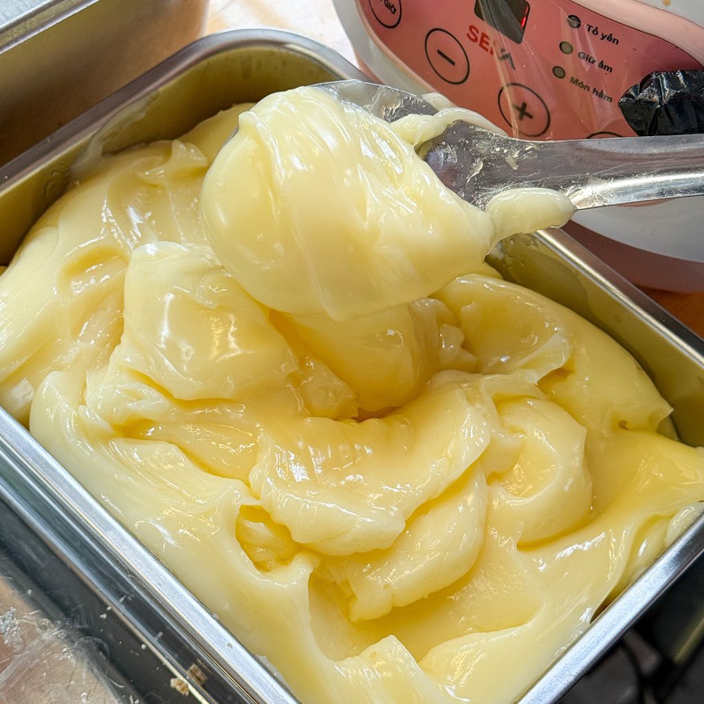 Danh sách ăn vặt 15h ở Vũng Tàu của bạn vừa có thêm một ứng cử viên “nặng ký” tại Tiệm Kem Bơ Cô Mũm Mĩm: món Latte Sầu Riêng Coffee mới toanh. Ly nước được phân tầng cực bắt mắt. Lớp đáy là bơ dầm nhuyễn sánh mịn, quyện cùng sữa và cà phê thơm lừng. Nhưng “vedette” thực sự chính là múi sầu riêng tươi, vàng ươm, được để bên trên cùng lớp dừa sợi trắng tinh. Chỉ cần nhìn thôi là đã tưởng tượng được vị béo ngậy của bơ và sầu riêng hòa quyện với vị đắng nhẹ của cà phê sẽ cuốn đến mức nào.