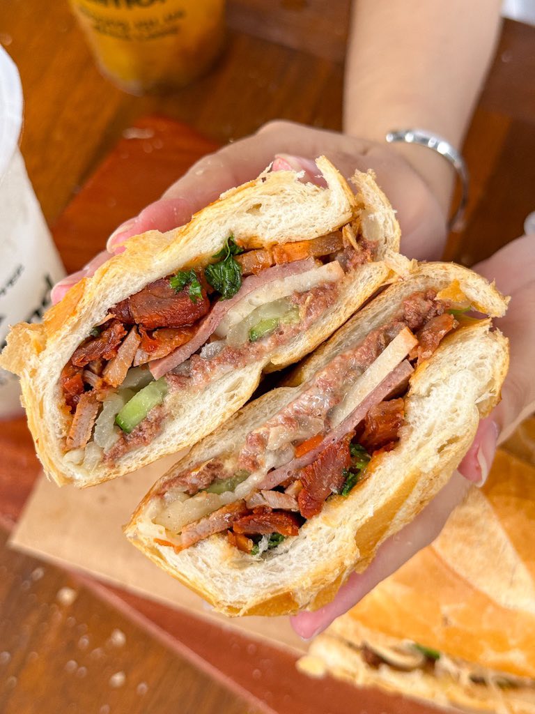 Bánh mì trước khi giao đều được làm nóng giòn, cắn miếng nào cũng nghe “rốp rốp” và ngập tràn topping. Xá xíu rim đậm vị, gà xé thơm, pate béo nhẹ hòa với rau và đồ chua ăn rất cuốn. Ngoài ổ lớn, quán còn có bánh mì que cho ai thích ăn nhẹ. Chiều tầm 15h ghé là có bánh nóng hổi vừa ra lò, nên nhớ tranh thủ nha.