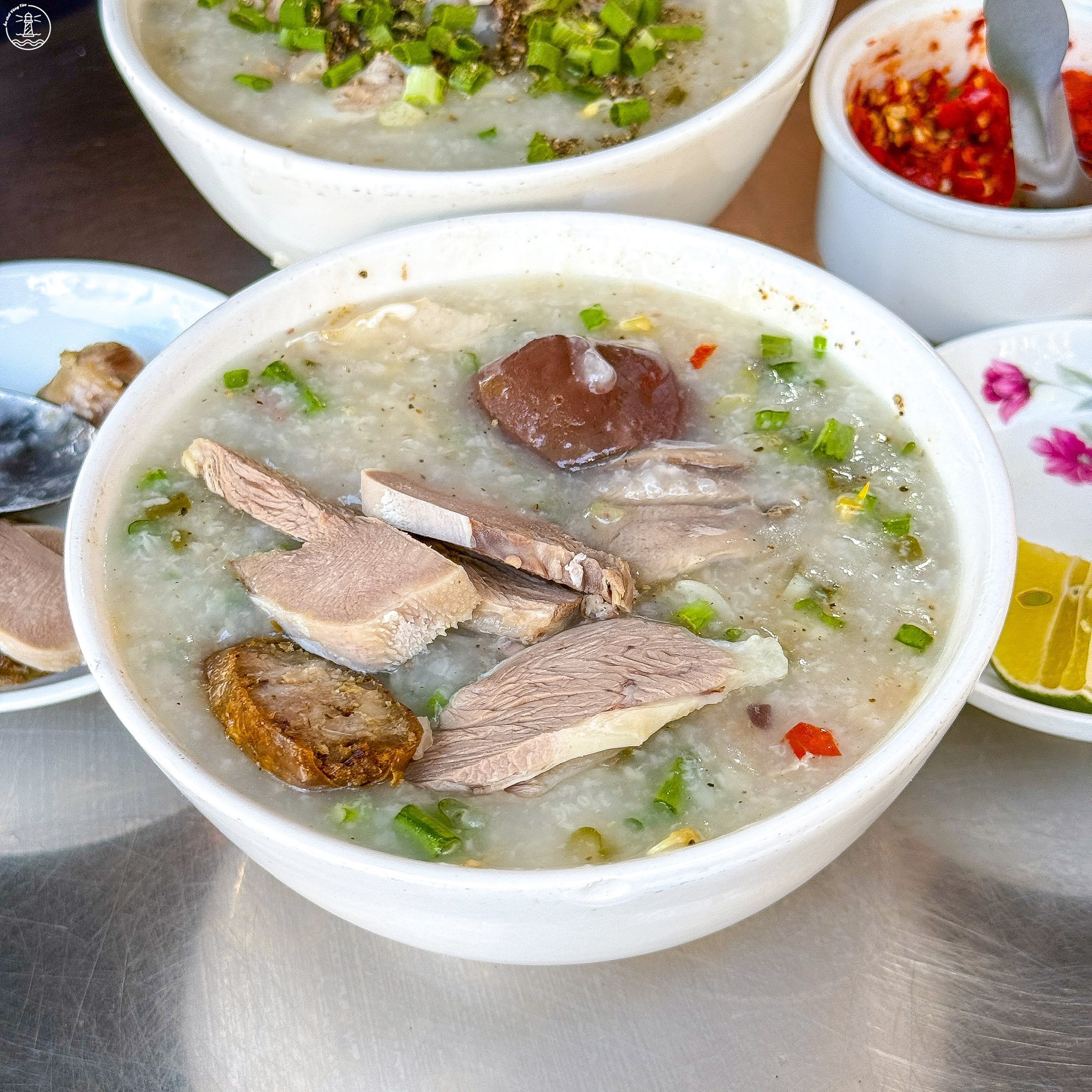 Chỉ cần cầm 25.000đ là bạn đã có ngay một tô cháo sánh mịn, đầy ắp topping gồm lòng, lưỡi, gan, thịt và đặc biệt là dồi trường giòn sật, ăn kèm với bánh quẩy là no nê. Cô chủ dọn hàng từ 12h trưa, nhưng chỉ tầm 3 – 4 giờ chiều là đã hết sạch nhẵn.