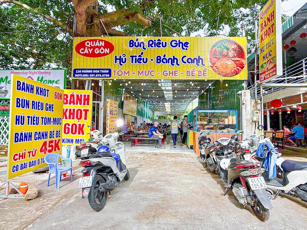Nằm trong danh sách những quán ăn vặt Vũng Tàu ngon và chất lượng, Quán Cây Gòn nổi tiếng với tô bún riêu ghẹ nguyên con tươi rói, nước dùng đậm đà, ngọt thanh từ xương và riêu cua, cùng với topping đầy ắp như chả chiên, chả cá và huyết.
