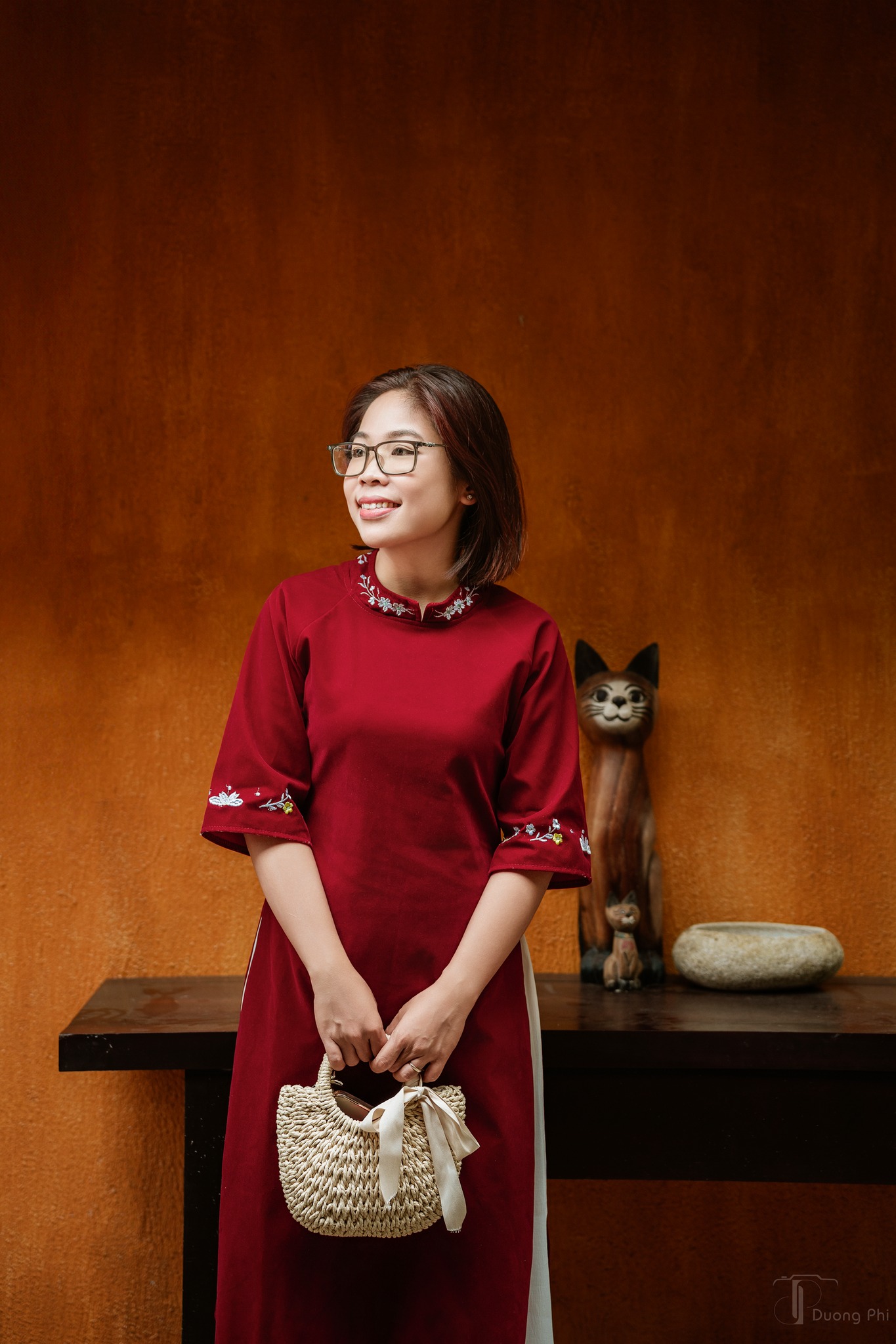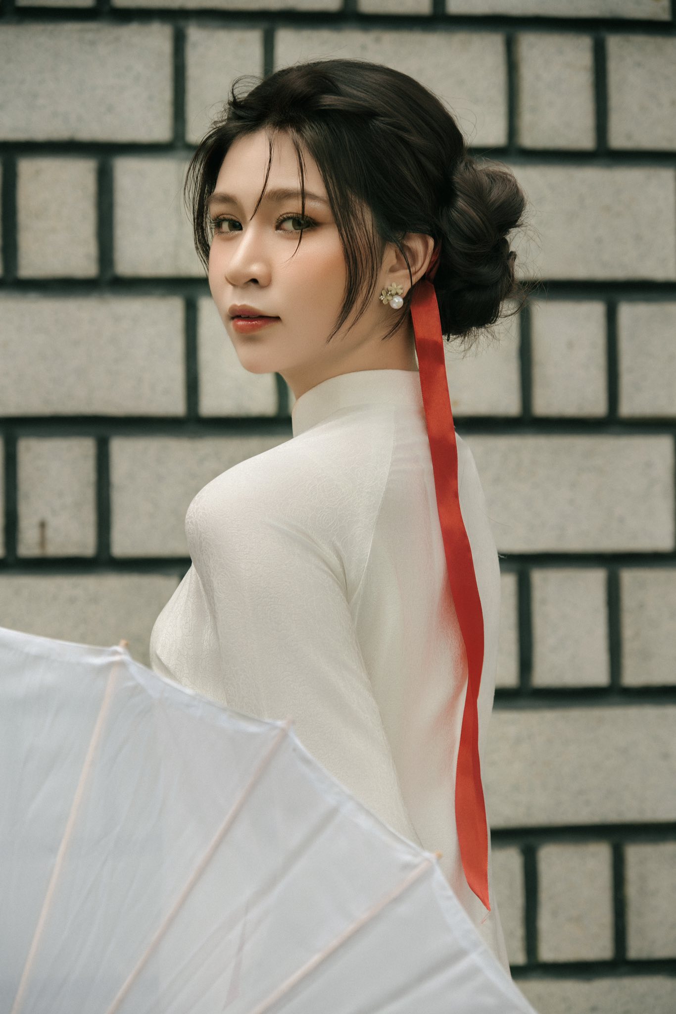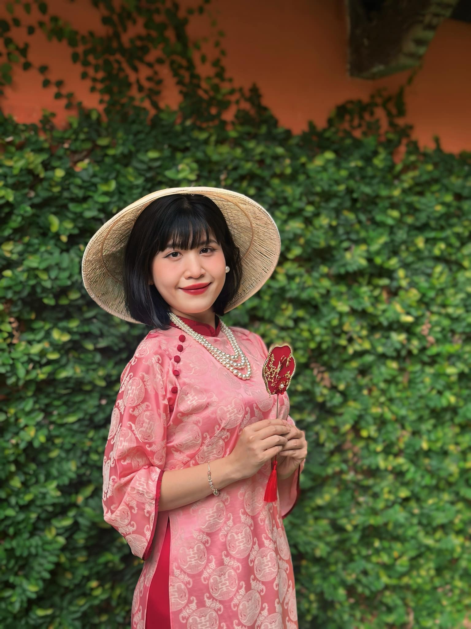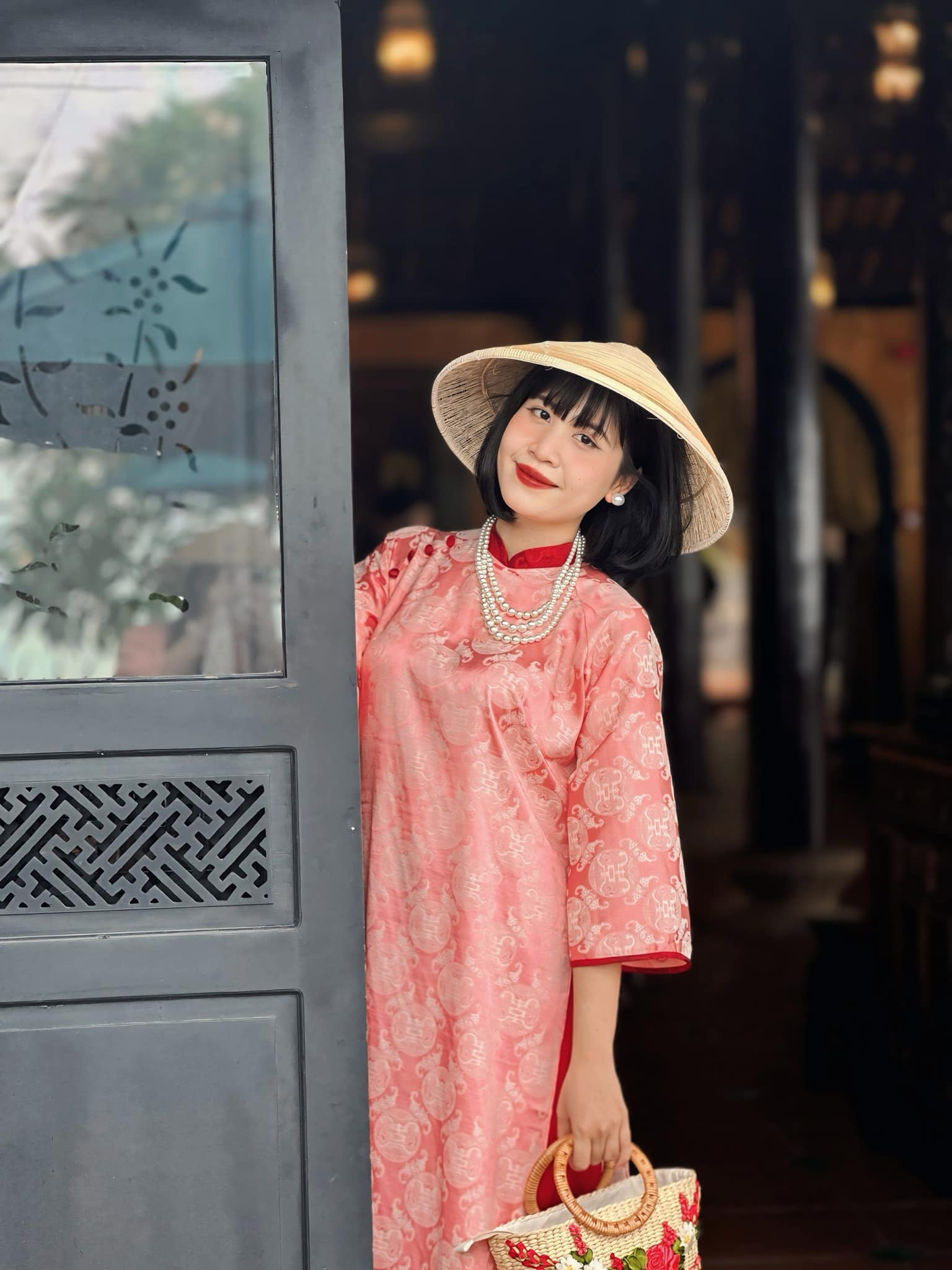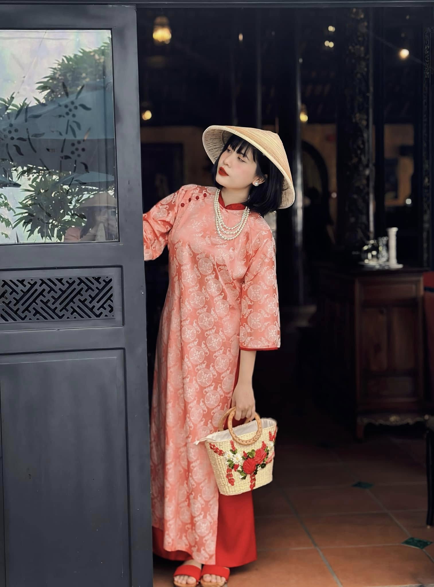 Bức tường với họa tiết tổ ong lạ mắt, gam màu trung tính, khi kết hợp cùng áo dài truyền thống lại tạo nên cảm giác vừa hiện đại vừa mang nét hoài niệm. Không cần decor cầu kỳ, chỉ cần đứng vào là đã có ngay background gọn gàng, tôn dáng, tôn áo, rất hợp với những bộ áo dài Tết mang phong cách nhẹ nhàng, tinh tế.