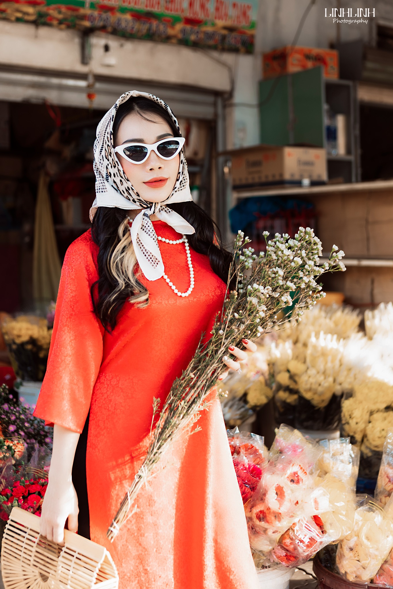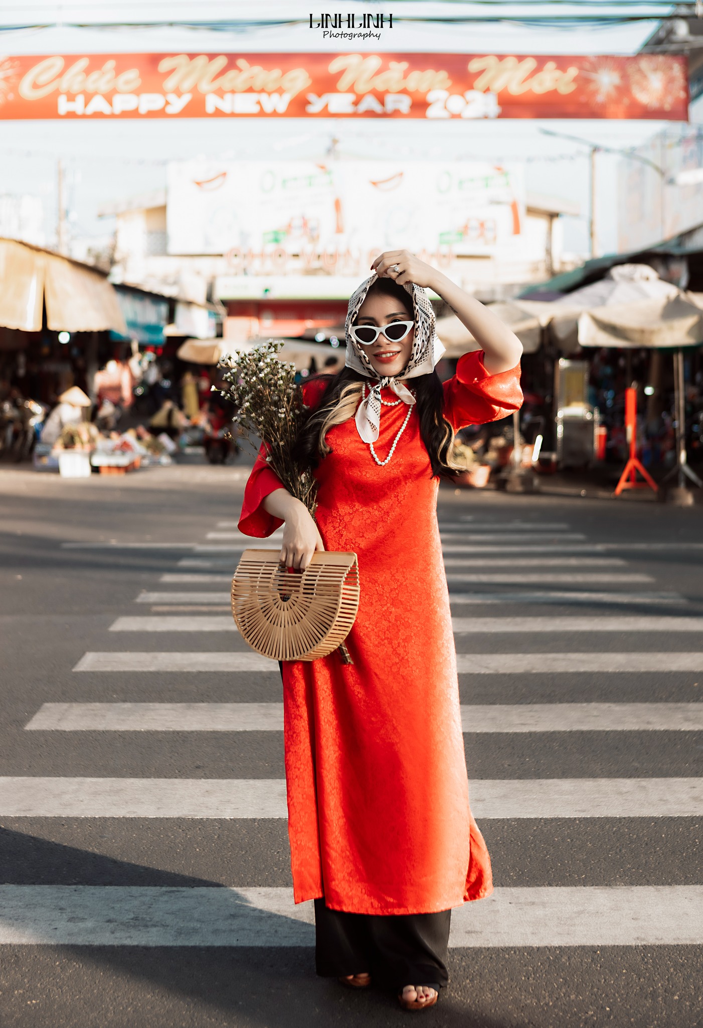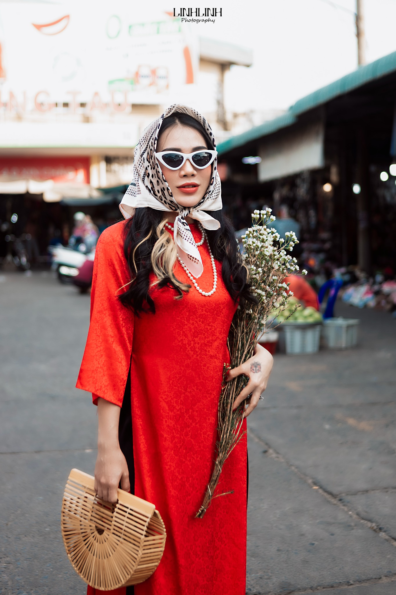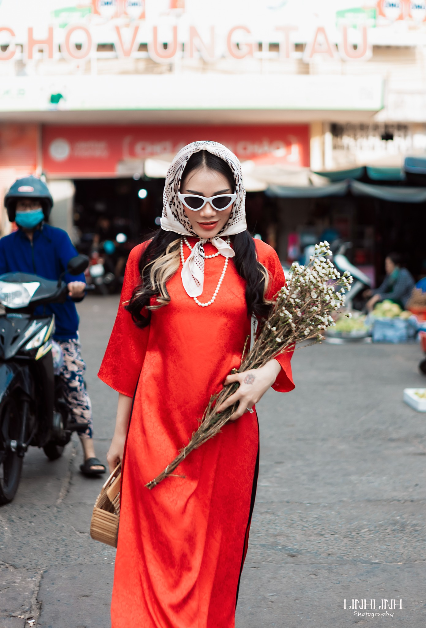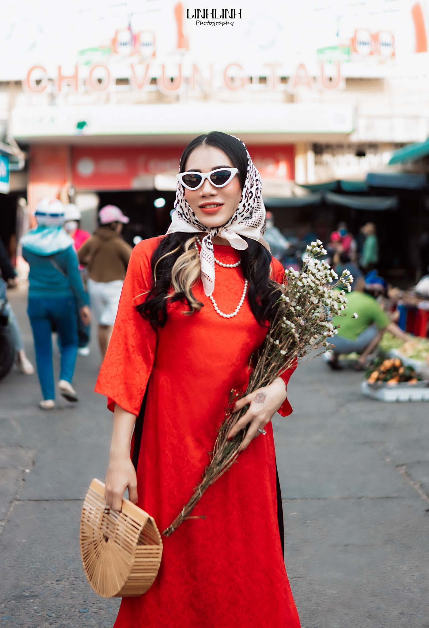 Chỉ cần khoác lên mình tà áo dài, bước vào chợ là auto có hình đẹp. Từ những gian hàng đầy sắc đỏ, sắc vàng của mứt Tết, hoa tươi, trái cây cho đến những góc chợ cũ mang nét sinh hoạt rất riêng của phố biển, tất cả đều phù hợp để chụp áo dài Tết ở Vũng Tàu. Không cần setup cầu kỳ, chính sự đông vui, nhộn nhịp và chân thật của chợ đã làm nên cái chất rất Tết.