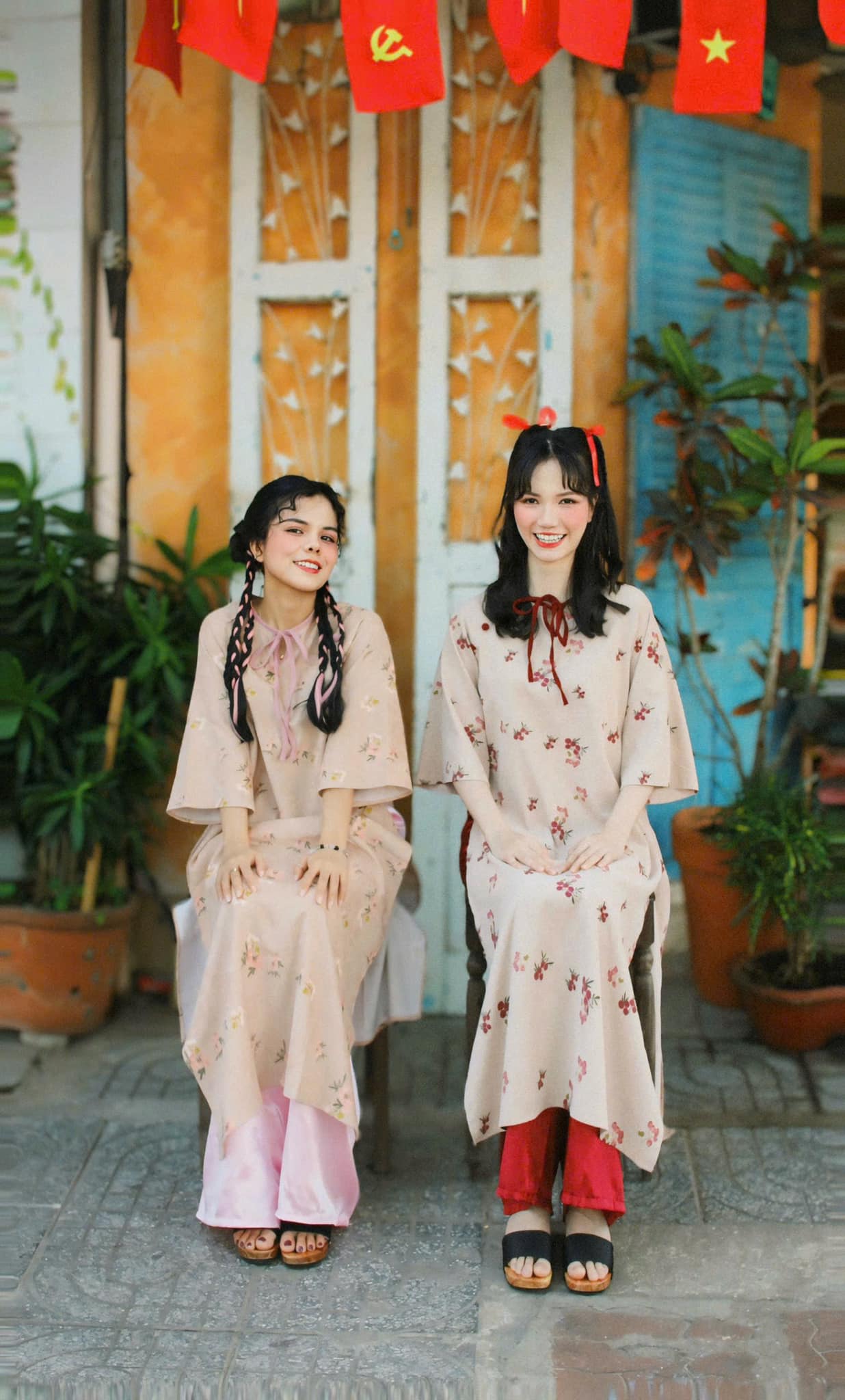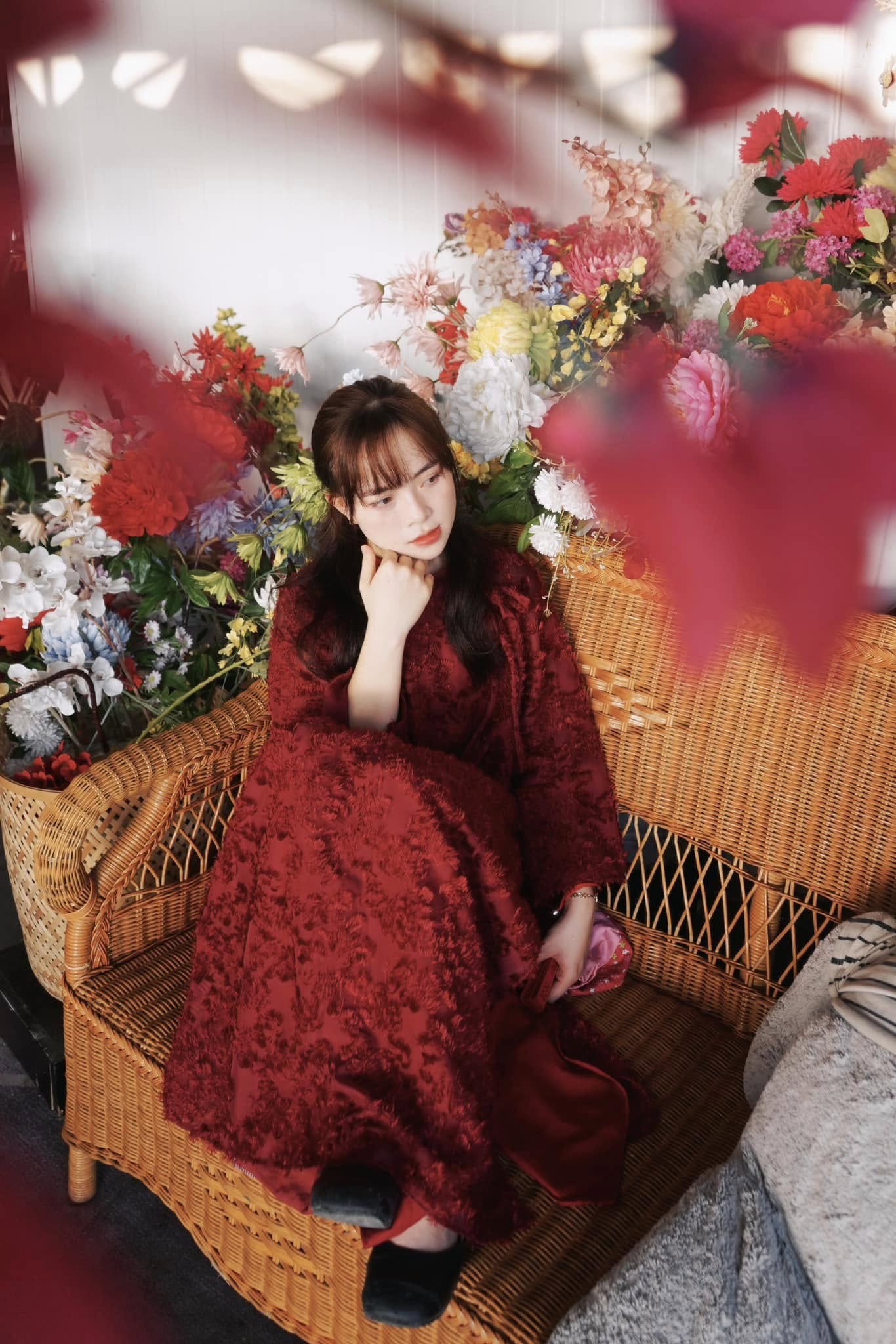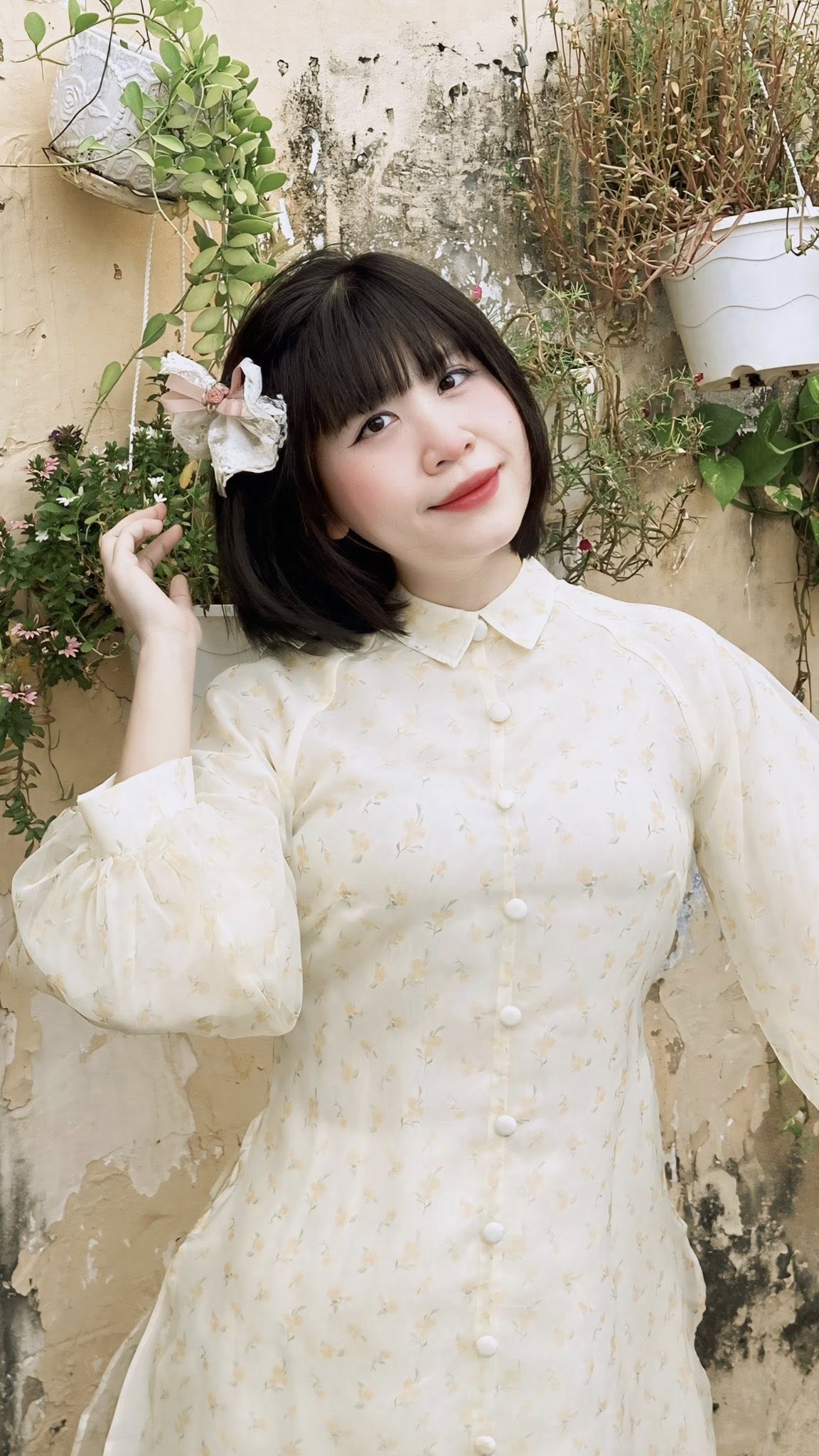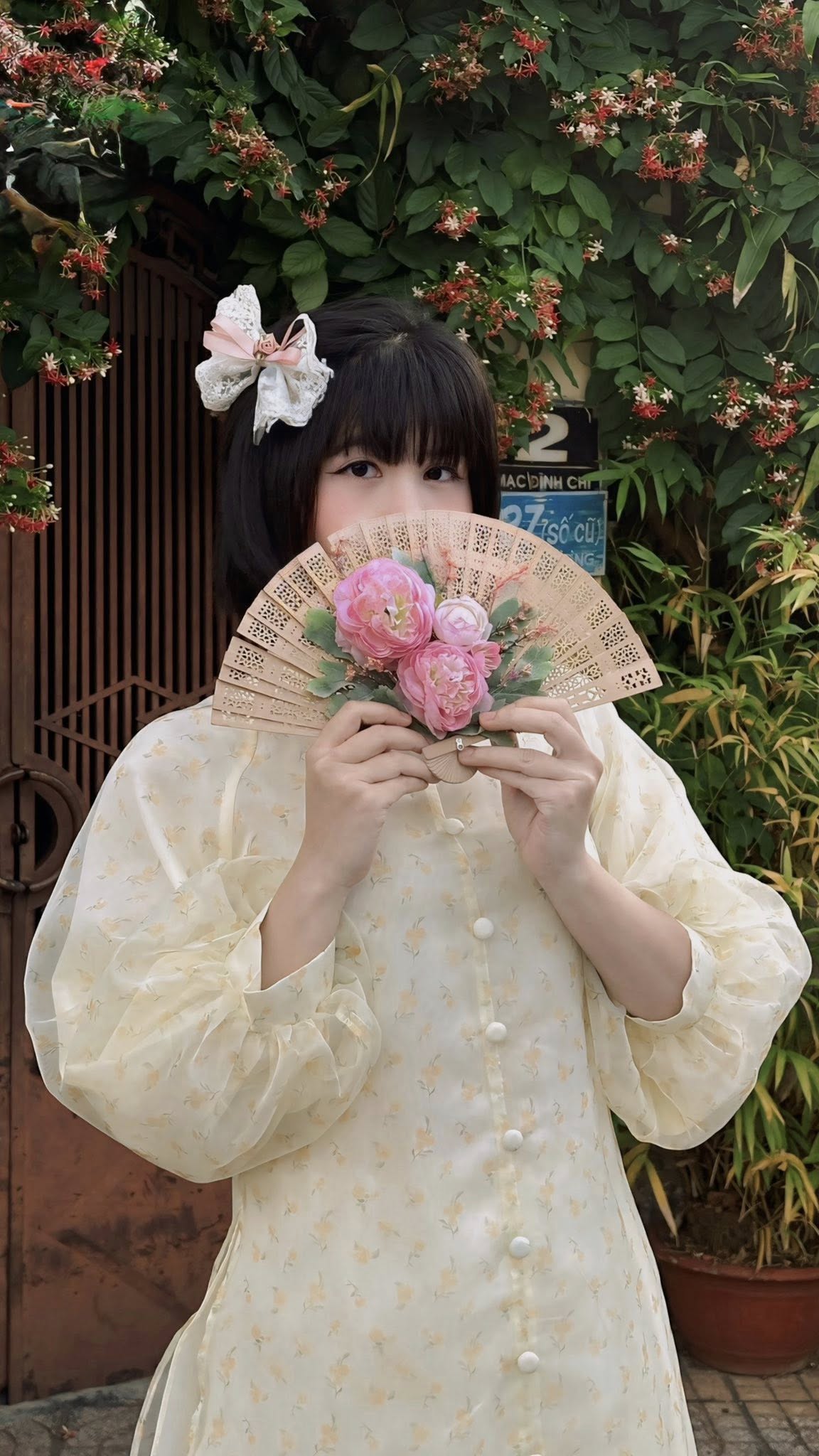 Góc chụp này đặc biệt phù hợp với những ai thích sự tự nhiên, đời thường nhưng vẫn đủ xinh để lưu lại khoảnh khắc đầu năm. Buổi sáng hoặc chiều nắng nhẹ, ánh sáng ngoài trời chiếu vào cổng hoa càng làm tà áo dài nổi bật, nhìn rất trong trẻo và dễ thương.