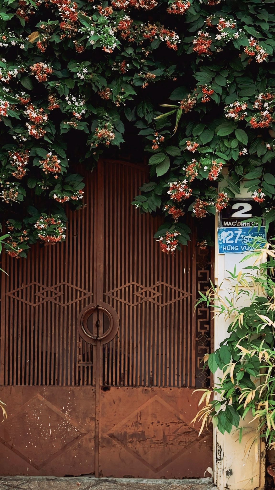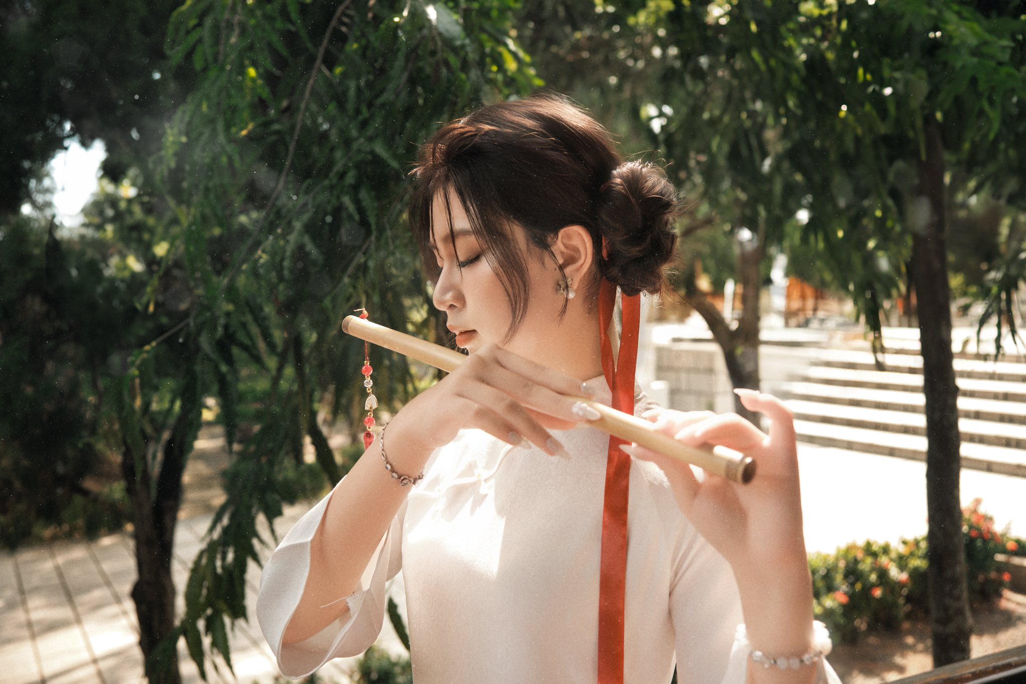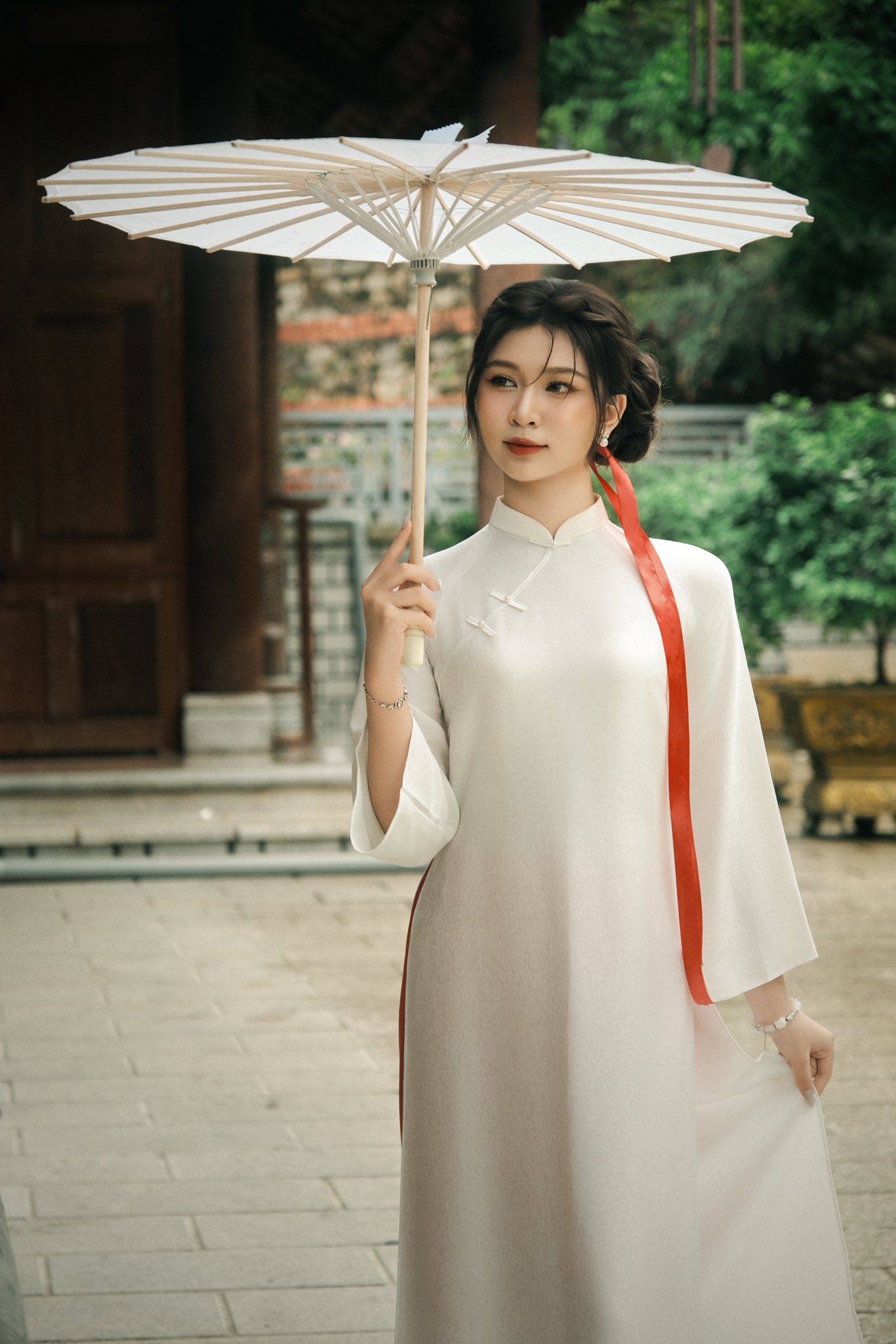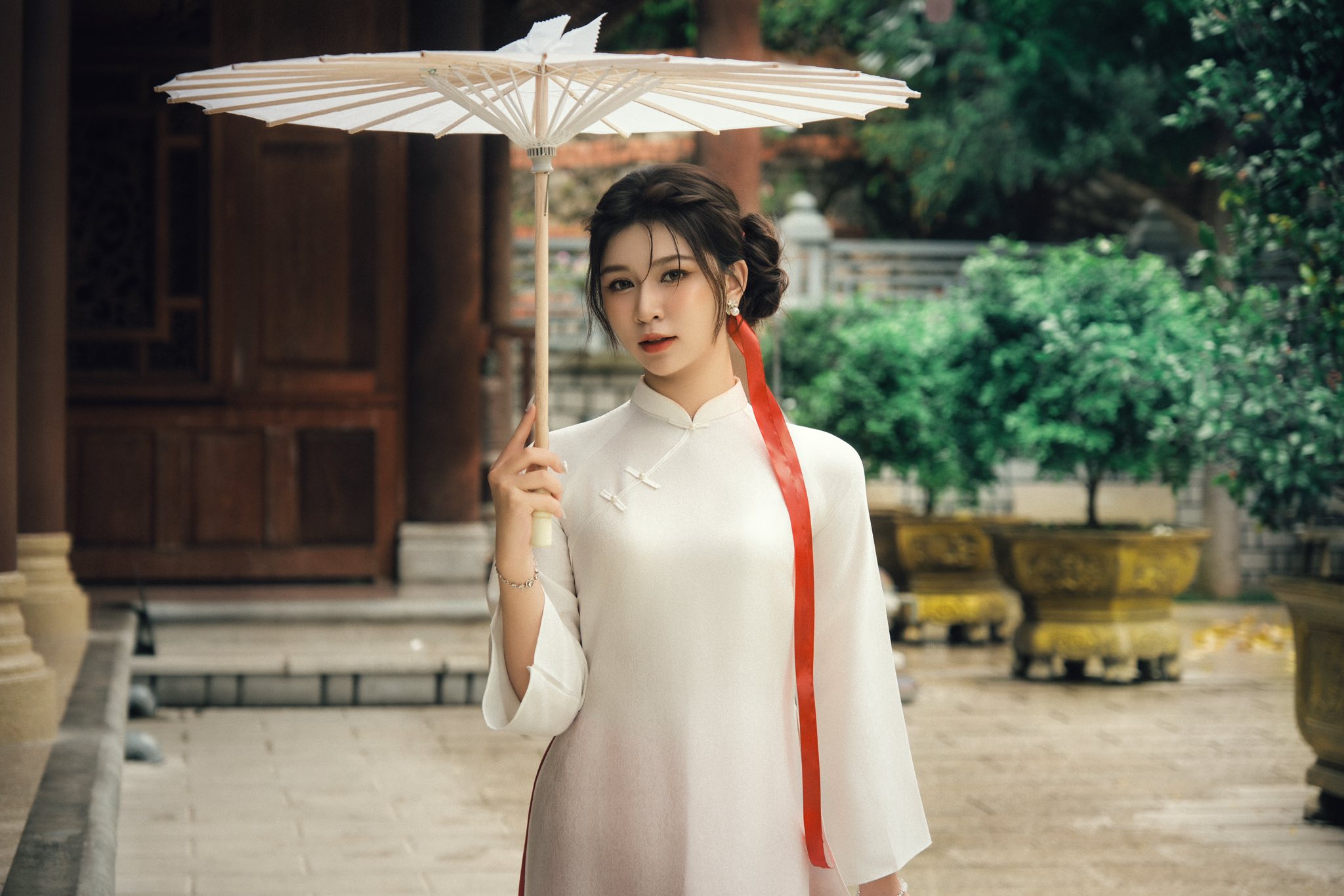 Góc chụp này đặc biệt phù hợp với những ai thích sự tự nhiên, đời thường nhưng vẫn đủ xinh để lưu lại khoảnh khắc đầu năm. Buổi sáng hoặc chiều nắng nhẹ, ánh sáng ngoài trời chiếu vào cổng hoa càng làm tà áo dài nổi bật, nhìn rất trong trẻo và dễ thương.