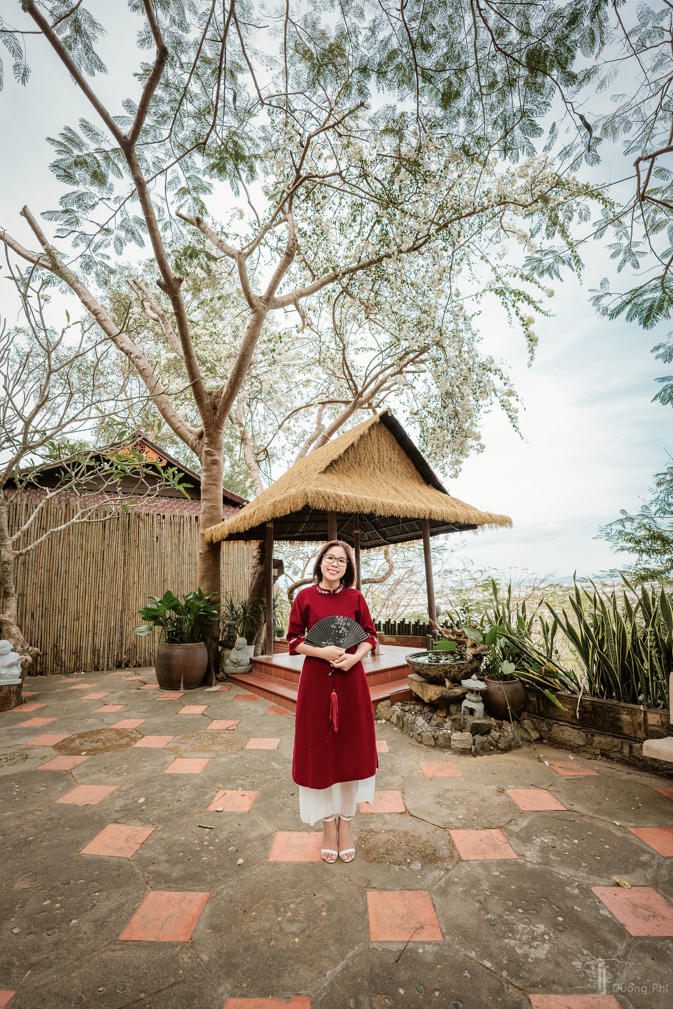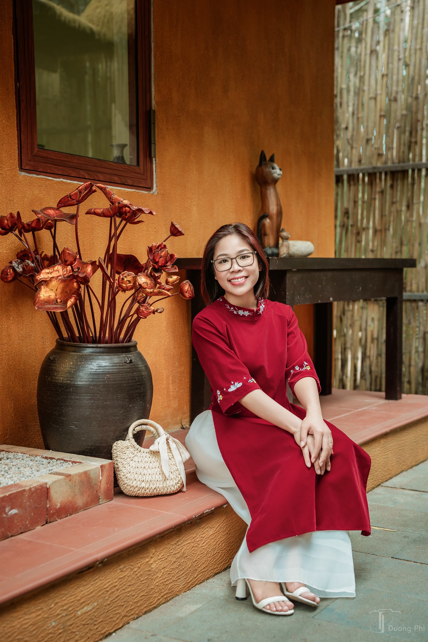 Không gian nơi đây được bố trí hài hòa giữa kiến trúc và thiên nhiên, từ sân vườn, bậc thềm đến những góc nhìn hướng ra biển. Ánh sáng ban ngày dịu nhẹ, kết hợp với gam màu trầm của làng giúp ảnh áo dài lên màu tự nhiên, không quá rực nhưng vẫn đủ nổi bật. Chính sự tối giản và tinh tế ấy khiến Bình An Village trở thành lựa chọn lý tưởng cho những ai yêu thích phong cách chụp ảnh Tết sang trọng nhưng không phô trương.