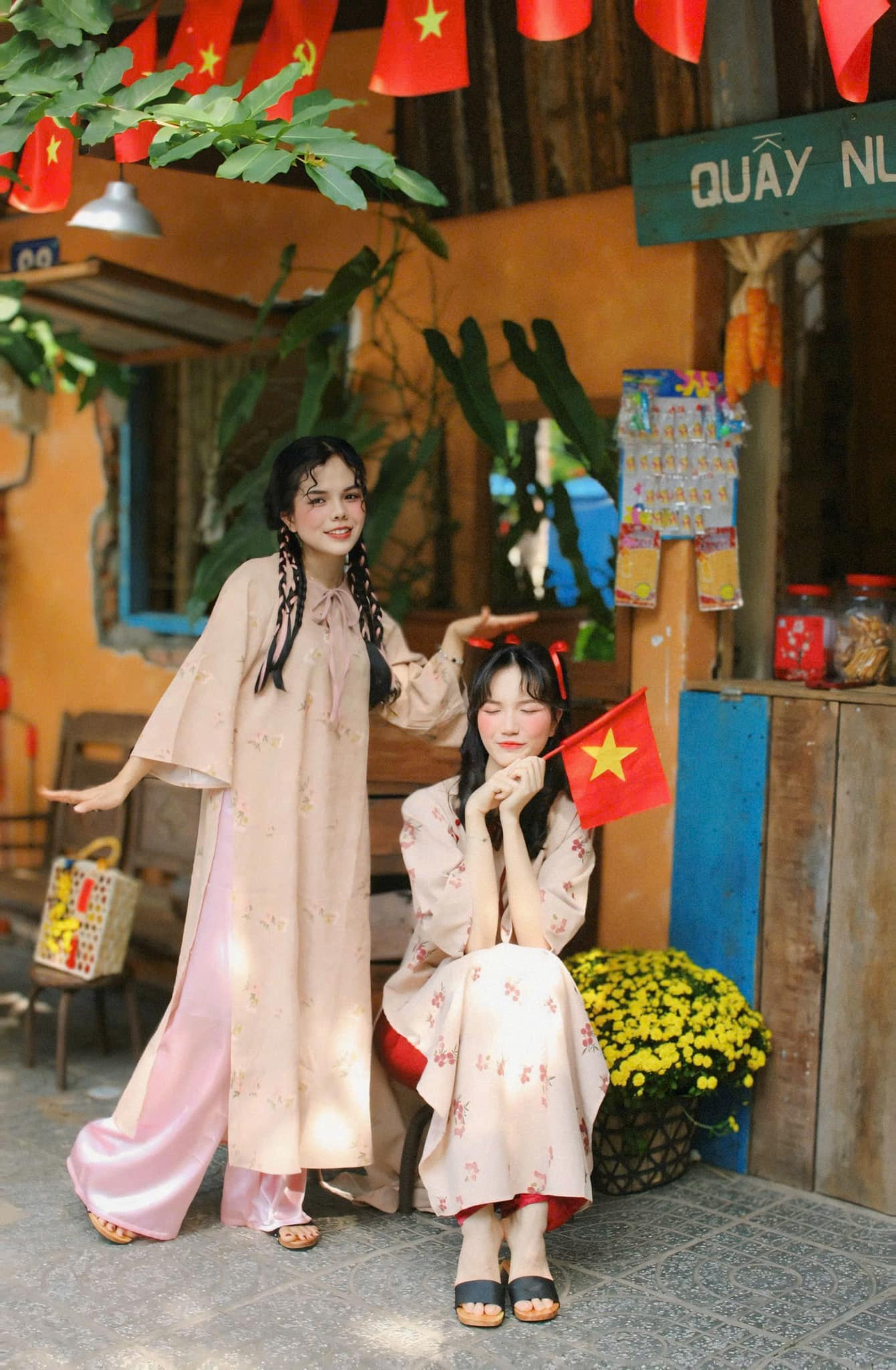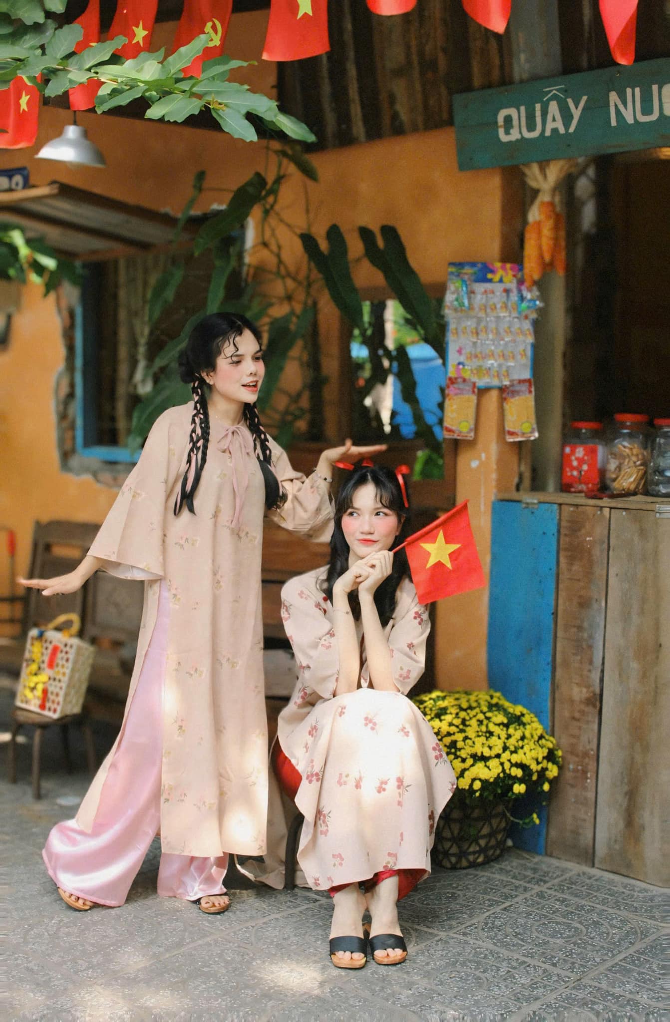 Quán nằm ở vị trí rất tiện, gần khu phố đi bộ với nhiều lồng đèn rực rỡ và sát bên bờ kè thoáng đãng, nên buổi sáng hay chiều đều có nắng đẹp. Ánh sáng tự nhiên chan hòa giúp tà áo dài lên hình mềm mại, trong trẻo, cực kỳ hợp để chụp áo dài Tết ở Vũng Tàu theo phong cách nhẹ nhàng, thuần Việt. Chỉ cần xoay vài góc là đã có đủ cảnh, từ lồng đèn, bờ kè cho đến những khoảng không gian mộc mạc quanh quán.