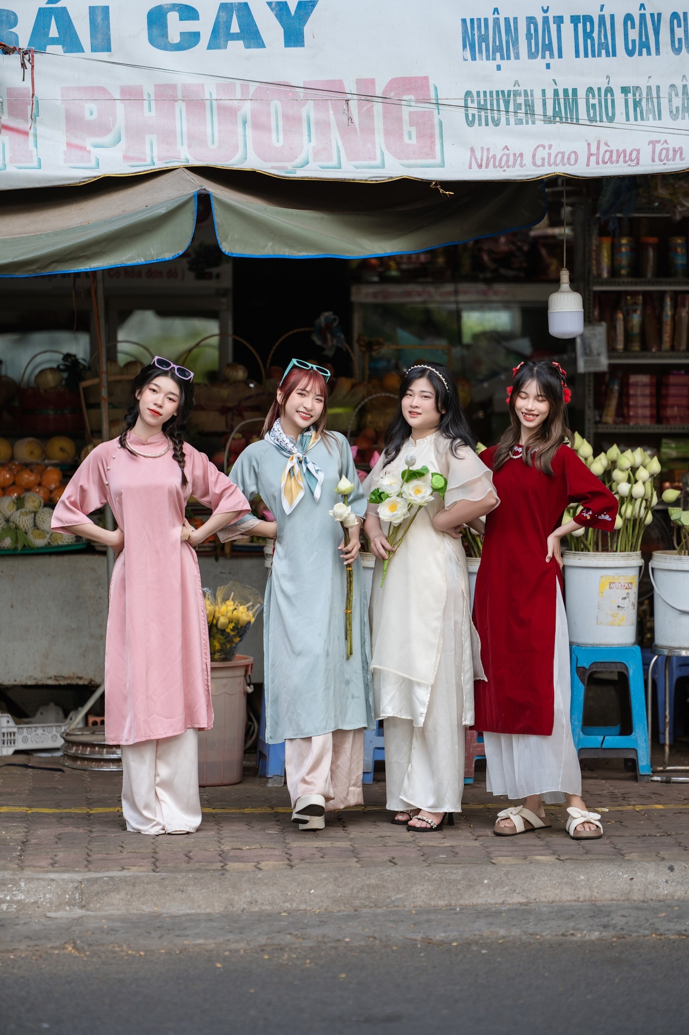 Chợ Vũng Tàu những ngày cận Tết bỗng trở nên rộn ràng hơn hẳn, không chỉ bởi sắc màu hoa trái mà còn bởi hình ảnh các chị em xúng xính áo dài đi chợ như đi trẩy hội. Không khí xuân lan tỏa khắp từng lối đi, từng sạp hàng, tạo nên một khung cảnh đời thường mà vô cùng duyên dáng.