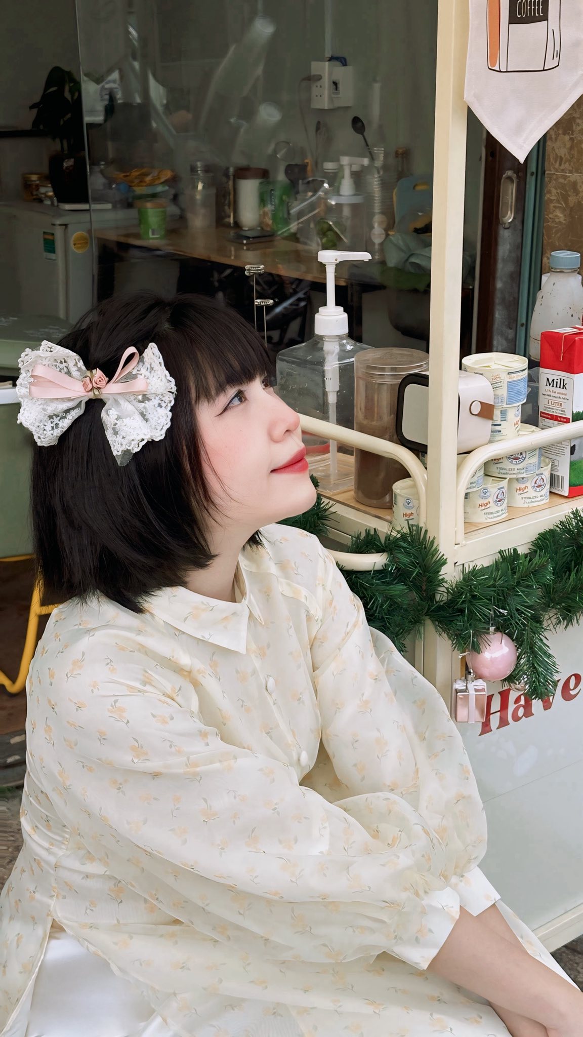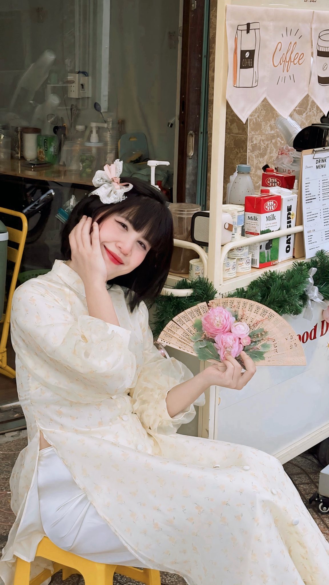 Không gian quán mang cảm giác gần gũi, nhẹ nhàng, kết hợp giữa chất mộc và thiên nhiên. Các góc ngồi được bố trí khéo léo dọc theo con dốc, chỉ cần đứng tựa lan can, bậc thềm hay lối đi nhỏ là đã có ngay những khung hình áo dài Tết rất tự nhiên. Ánh sáng ban ngày dịu nhẹ, lên ảnh trong trẻo. Còn khi về chiều, ánh nắng hoàng hôn phủ xuống càng làm tổng thể trở nên lãng mạn hơn.