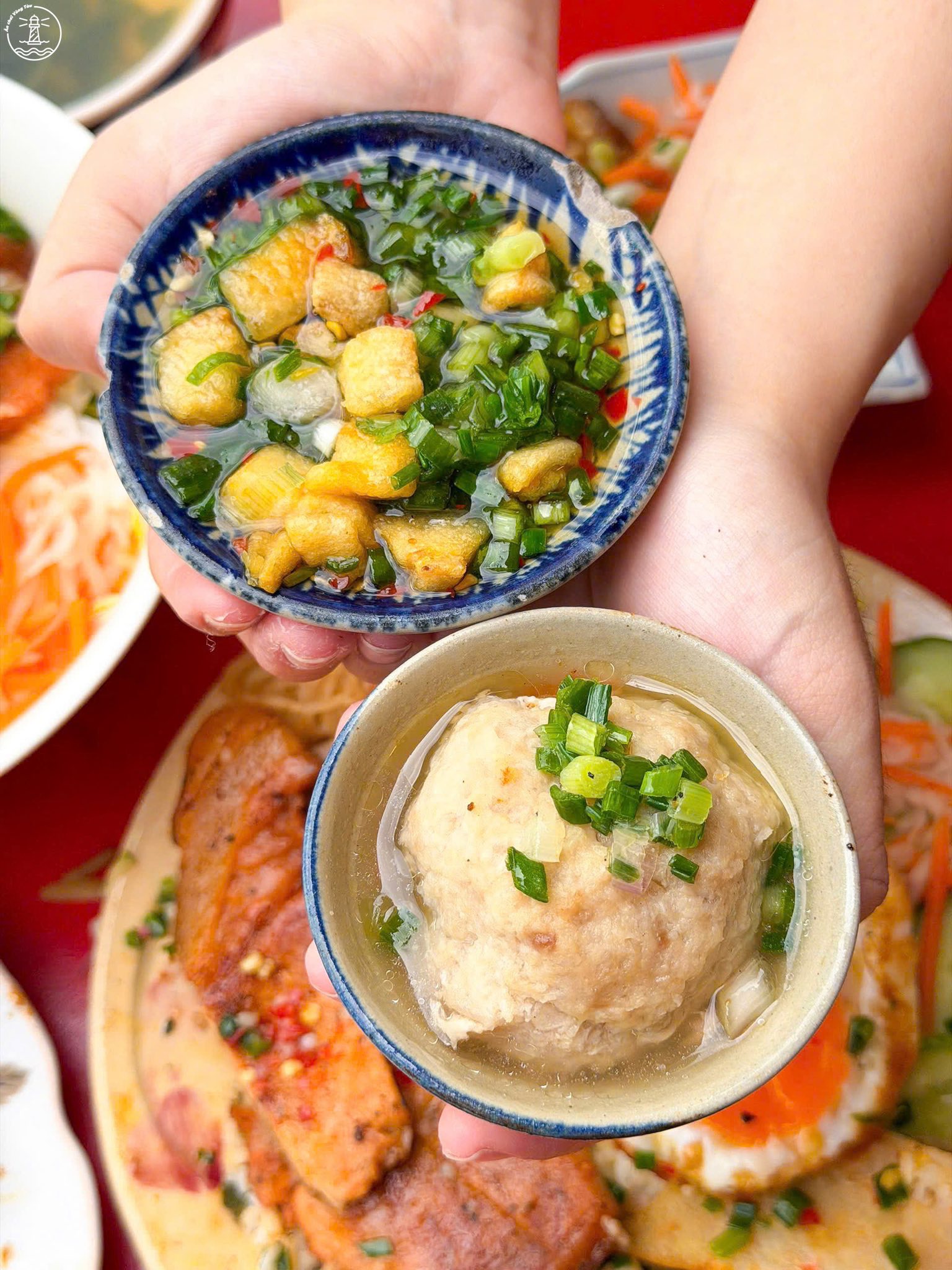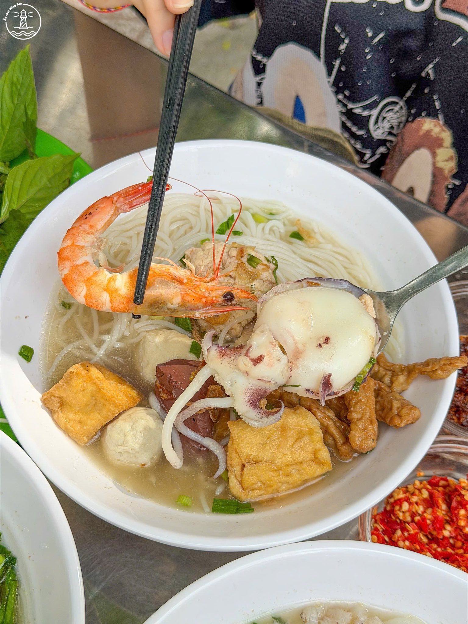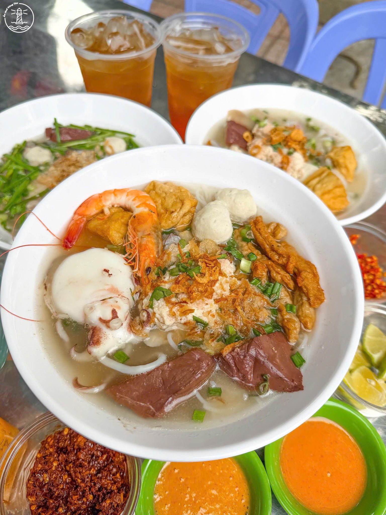 Bún riêu bề bề hải sản là món được gọi nhiều nhất. Một tô đầy ụ topping: riêu tự làm béo thơm, chả cá, thịt, mọc, đậu hũ, thêm tôm, mực và bề bề tươi rói. Chấm cùng muối chấm hải sản quán tự pha là đúng kiểu ăn tới đâu dính tới đó.