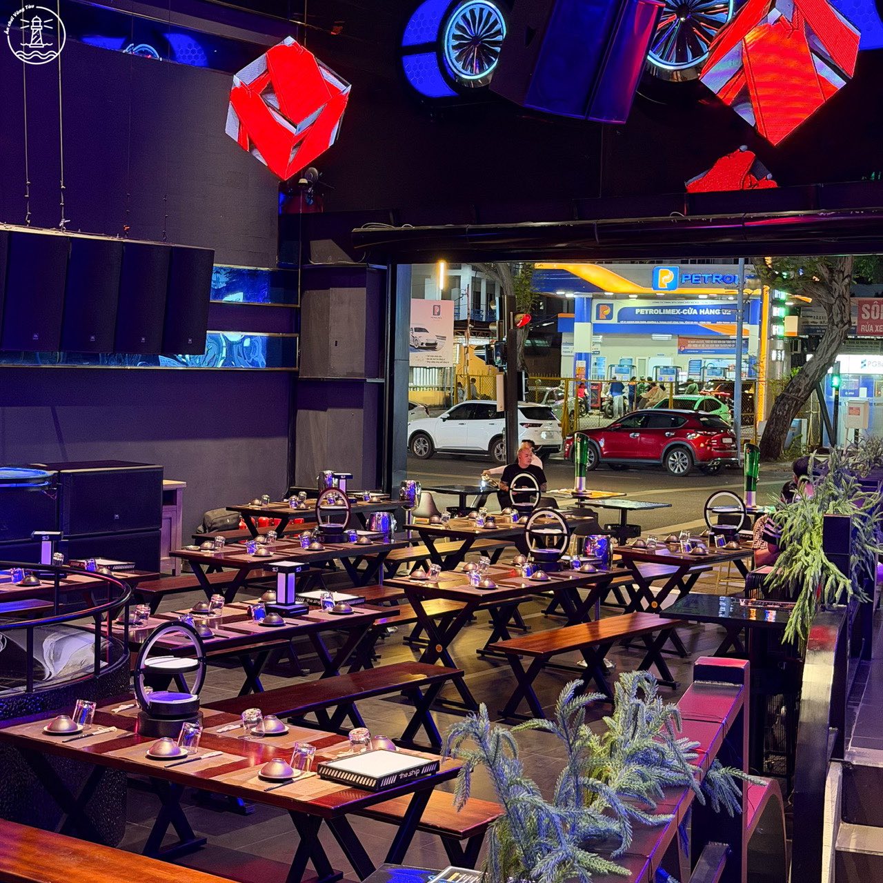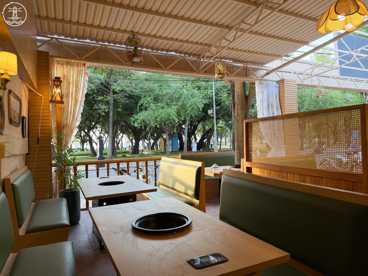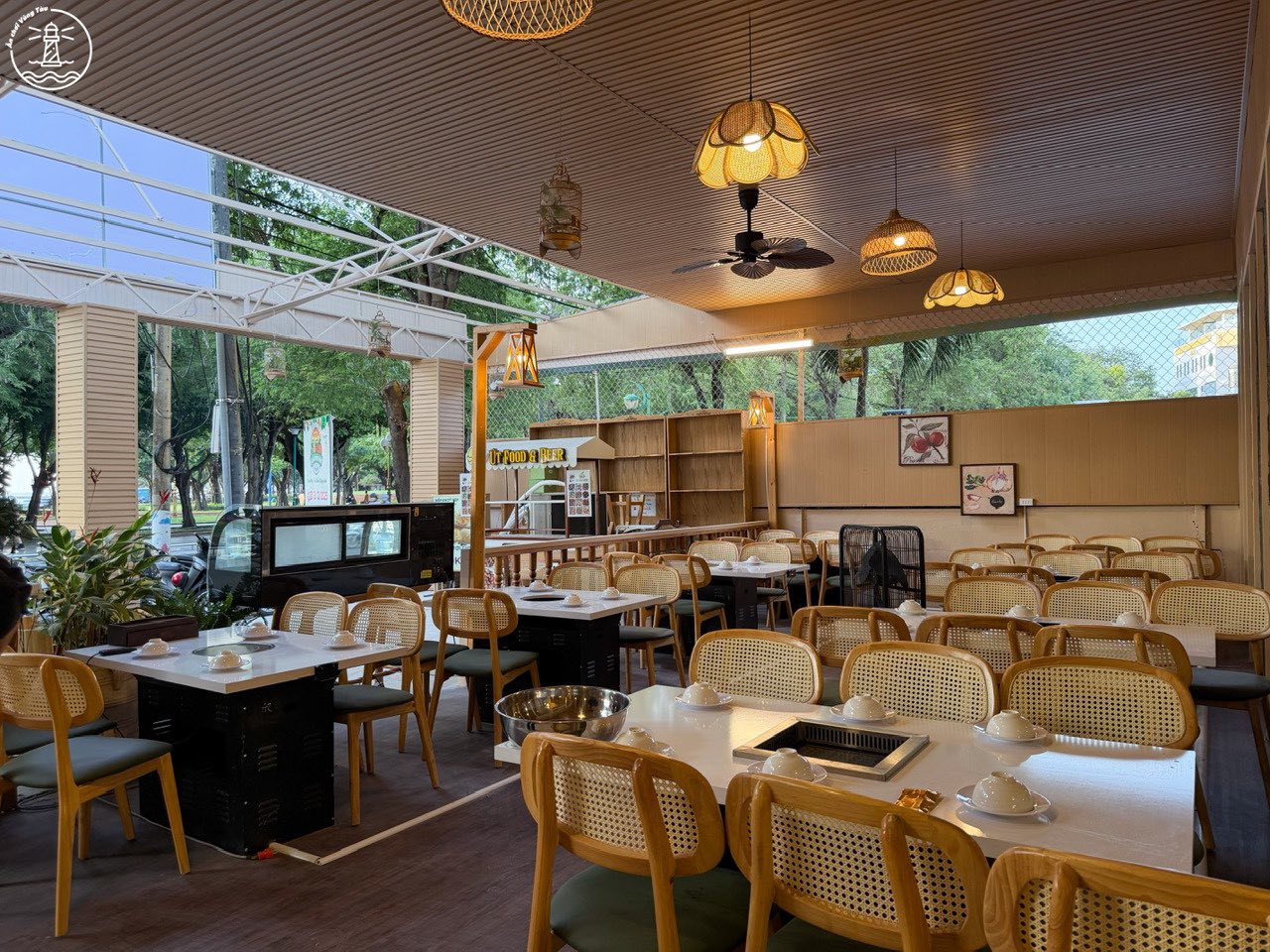 Điểm cộng lớn của quán nằm ở vị trí sát khu công viên Bãi Trước, buổi chiều có thể vừa dùng bữa vừa ngắm hoàng hôn, đón gió biển mát rượi. Không gian được chia thành khu trong nhà và khu ngoài trời. Khu trong nhà mang cảm giác ấm cúng, phù hợp cho những buổi ăn tối nhẹ nhàng hay hẹn hò, trong khi khu ngoài trời lại thoáng đãng, rất hợp đi nhóm bạn hoặc gia đình, nhất là vào khung giờ chiều tối.