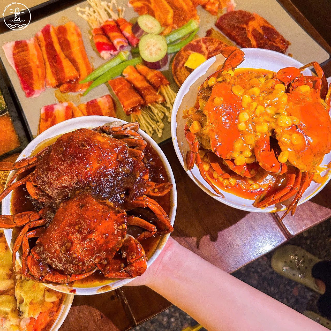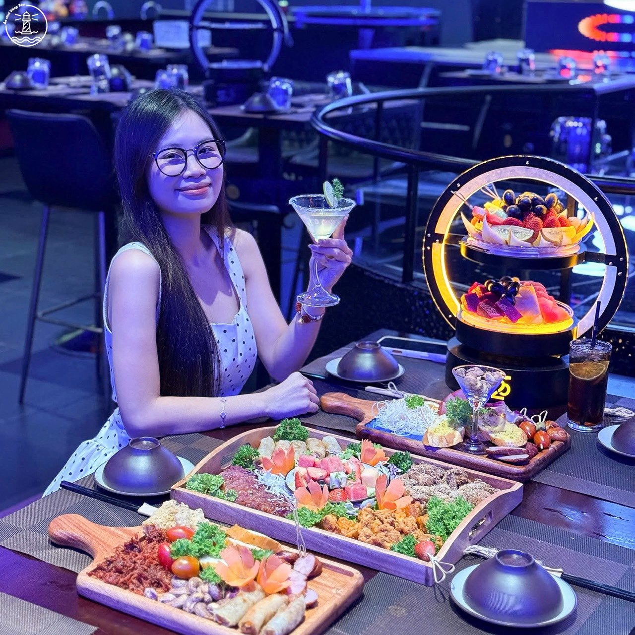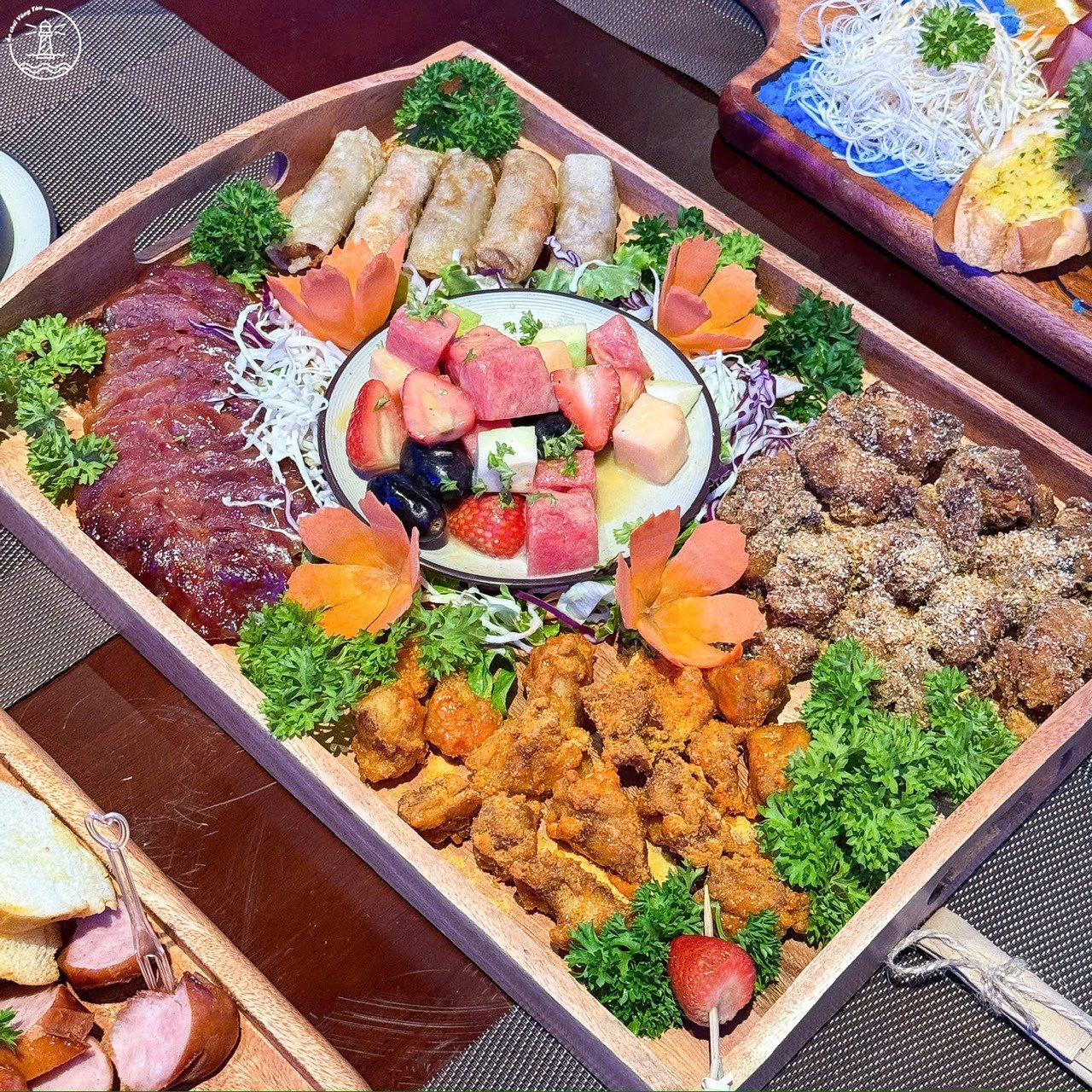 Điểm cộng lớn của quán nằm ở menu buffet đa dạng, tập trung vào các loại thịt nướng tươi và dễ ăn. Set nướng có nhiều lựa chọn thịt bò như gù bò mắm nhĩ, bò sả, bò sa tế ớt, ba chỉ bò, ba chỉ bò cuộn nấm, bò tảng, bò tuyết, xen kẽ thêm các loại thịt heo như vú heo, ba chỉ heo. Thịt được ướp thấm gia vị, lên vỉ nướng dậy mùi thơm, ăn kèm nước chấm vừa miệng. Hải sản cũng khá phong phú với bạch tuộc, tôm, mực ống, mực nang, mực lá, ếch… nguyên liệu tươi, lên món nhanh, không phải chờ đợi lâu. Khách có thể chọn món theo phiếu tick, gọi bao nhiêu lên bấy nhiêu rất tiện.