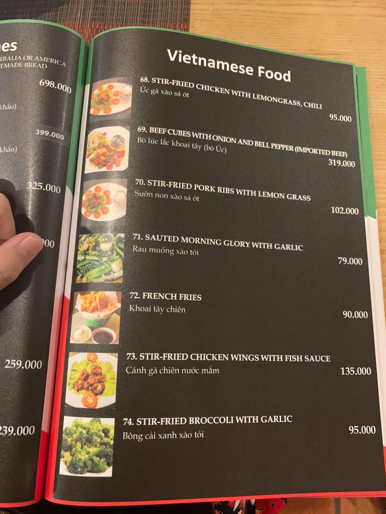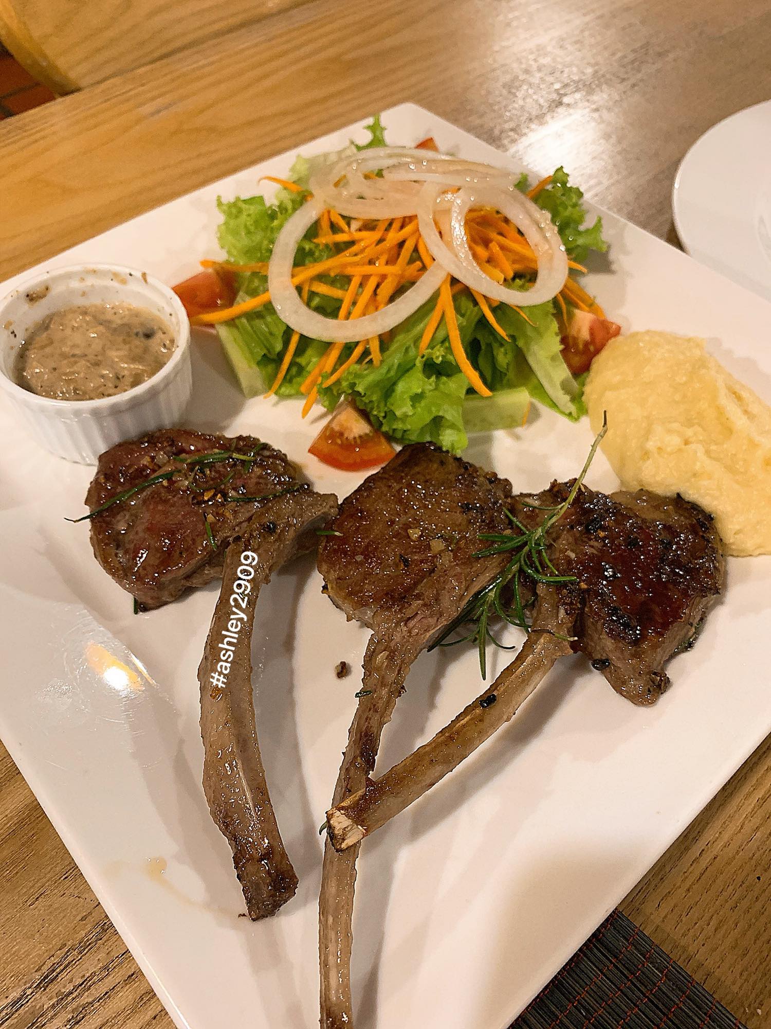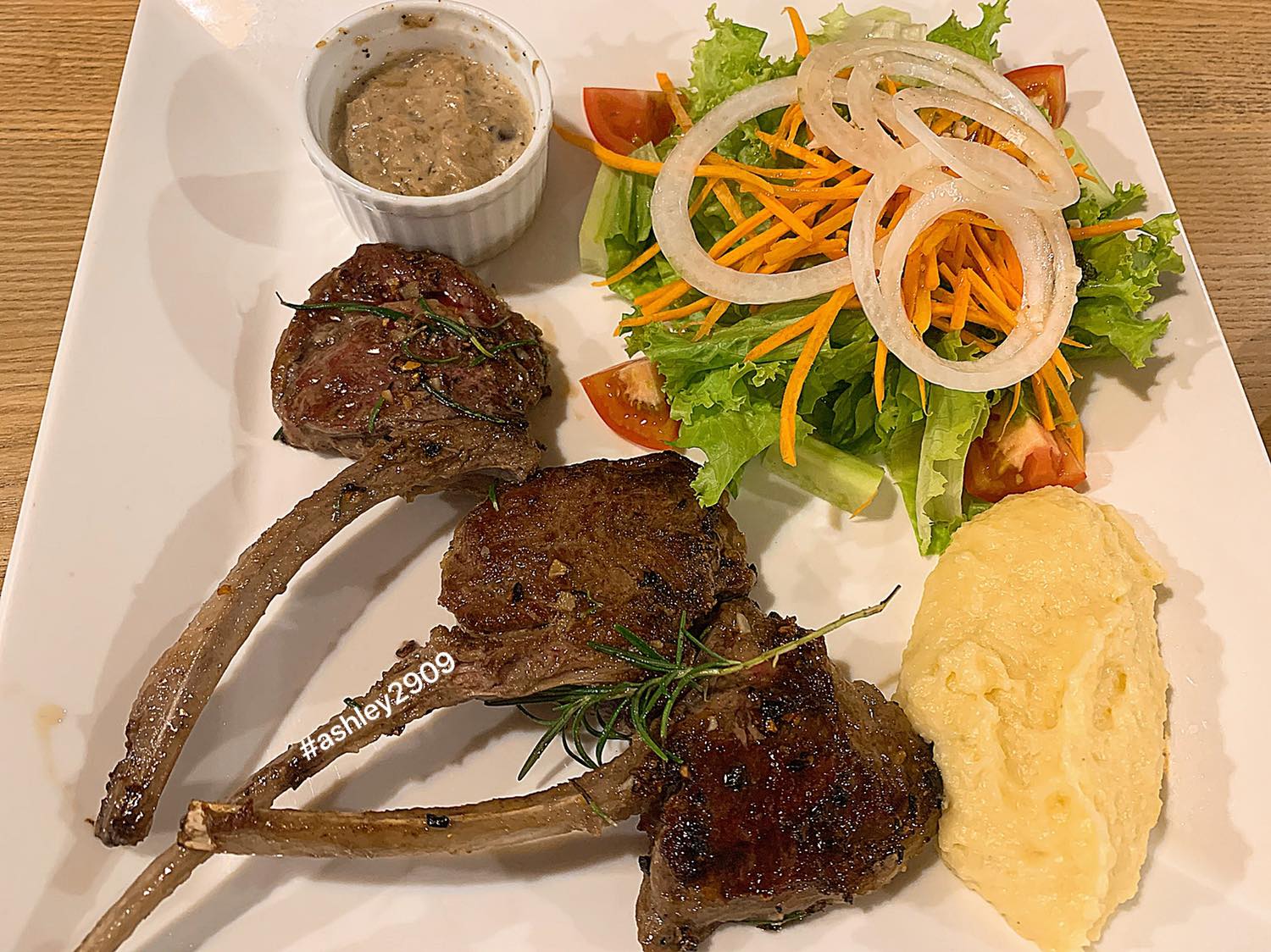 Ngoài pizza, menu của quán còn có nhiều món Âu để đổi vị, trong đó sườn cừu nướng là lựa chọn được đánh giá cao. Sườn được ướp kỹ, nướng thơm, thịt mềm và giữ được độ ngọt. Khi ăn kèm salad dầu giấm chua nhẹ, khoai tây nghiền béo béo và sốt nấm đi kèm sẽ giúp tổng thể món ăn hài hòa, dễ ăn và không bị ngán. Nếu không quen ăn thịt tái, thực khách có thể dặn quán nướng kỹ hơn để phù hợp khẩu vị.