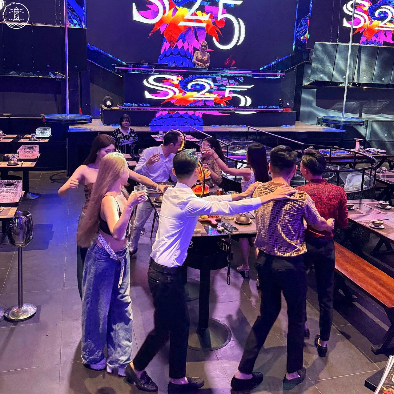 Càng về tối, không khí tại S25 Beer Club càng nóng hơn. Từ khoảng 8 giờ tối, DJ bắt đầu lên nhạc, dancer biểu diễn tạo cảm giác đúng chất beer club. Trước 10 giờ, không gian vẫn khá thoáng và dễ trò chuyện, phù hợp để khởi động buổi tối. Sau 10 giờ, quán chuyển sang không gian kín, nhạc và ánh sáng được đẩy cao hơn, rất hợp cho những ai thích quẩy đúng nghĩa.