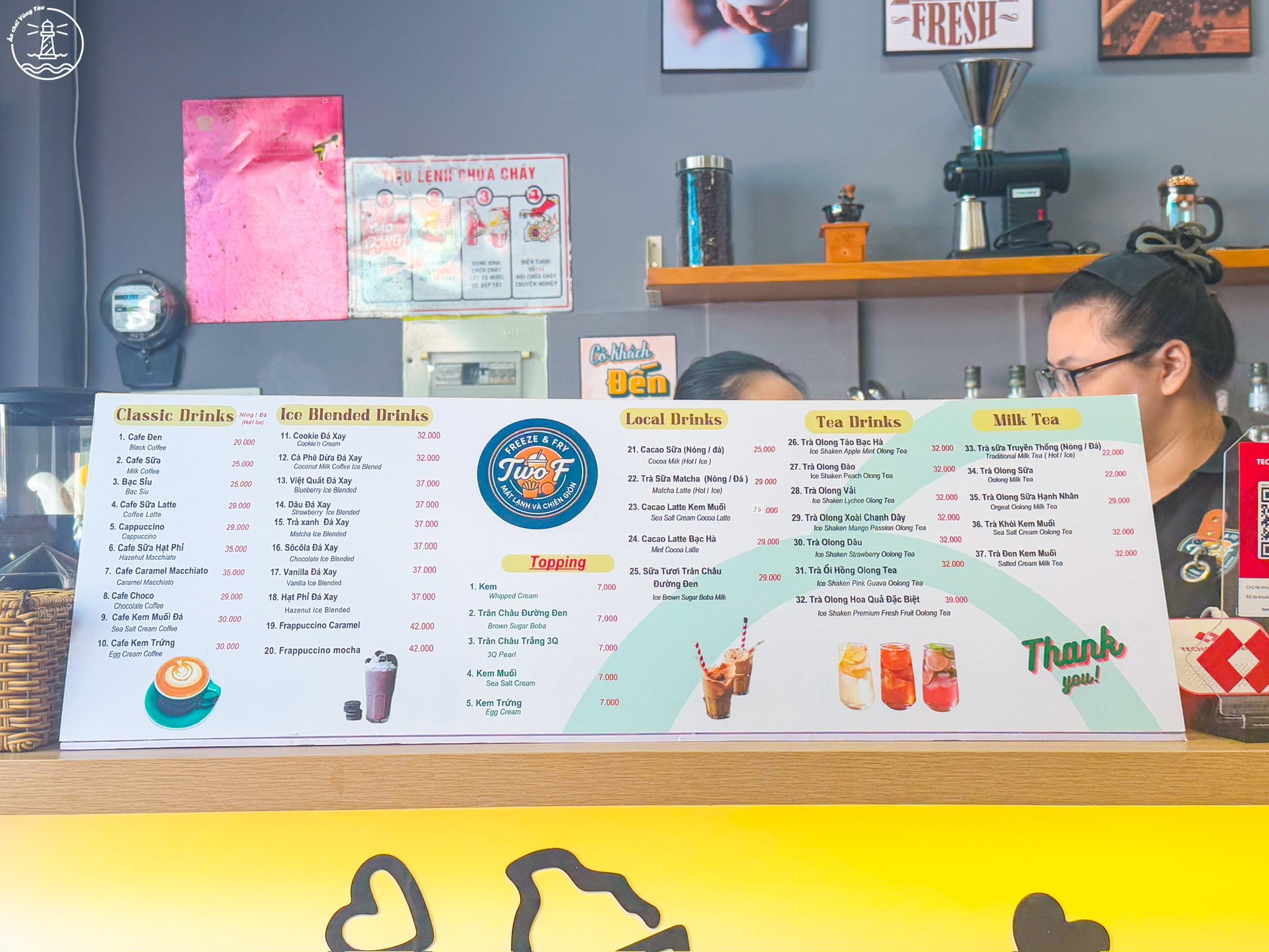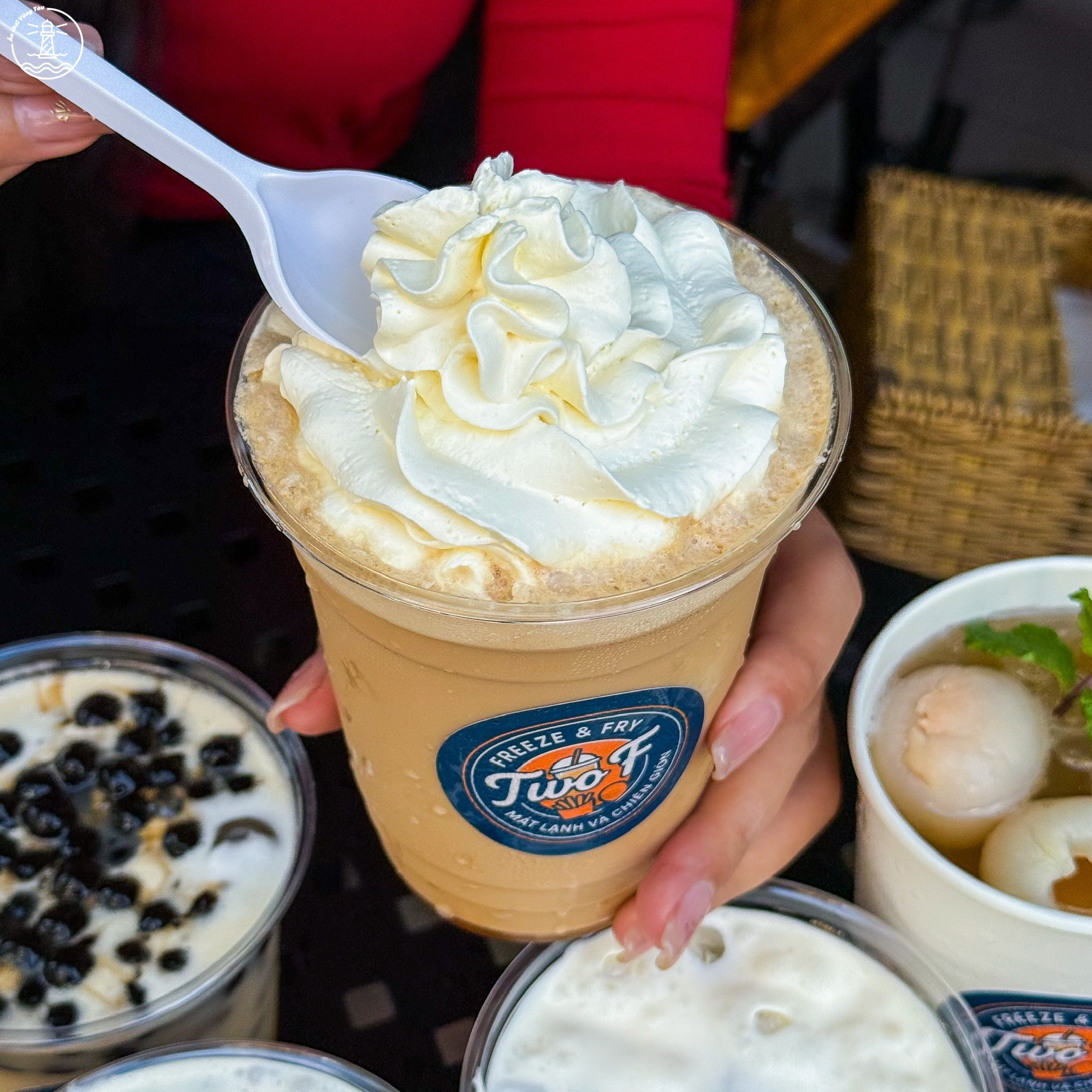 Thêm một điểm dừng chân khá thú vị trong danh sách quán ăn bãi trước Vũng Tàu 2026 chính là TWO F – FREEZE & FRY, phù hợp với những ai mê nước uống mát lạnh, tiện mua mang đi rồi ra biển ngồi chill. Quán nằm sát khu Bãi Trước, chỉ cần dạo biển vài phút là có thể ghé mua ngay một ly đá xay mát rượi để giải nhiệt.