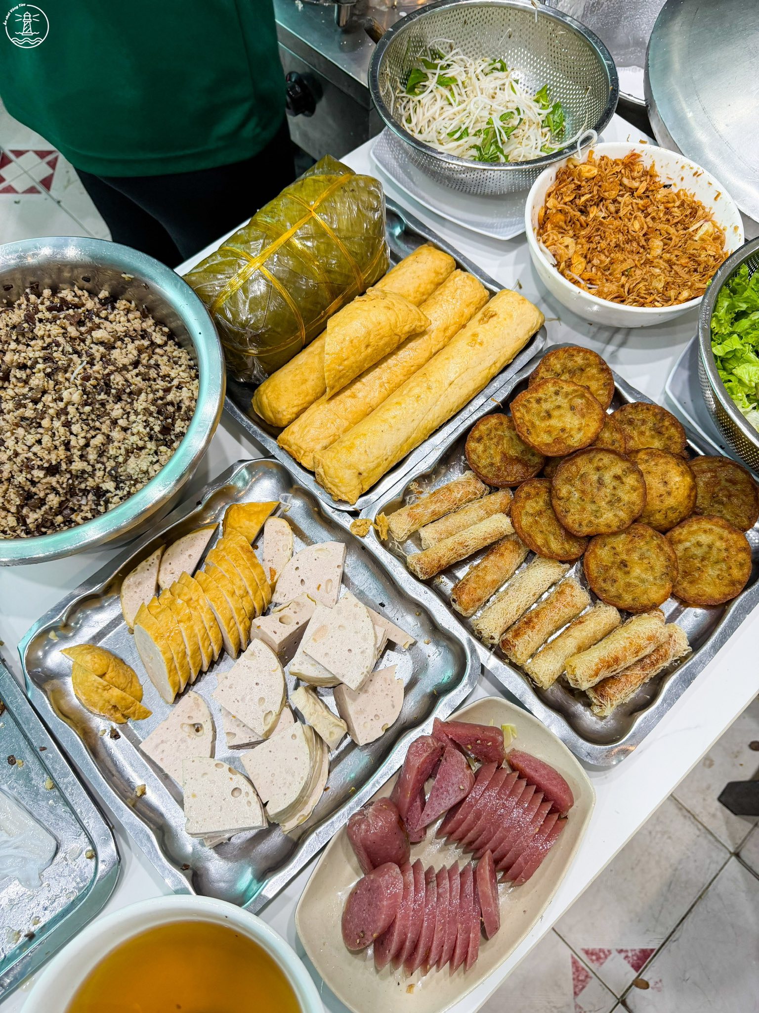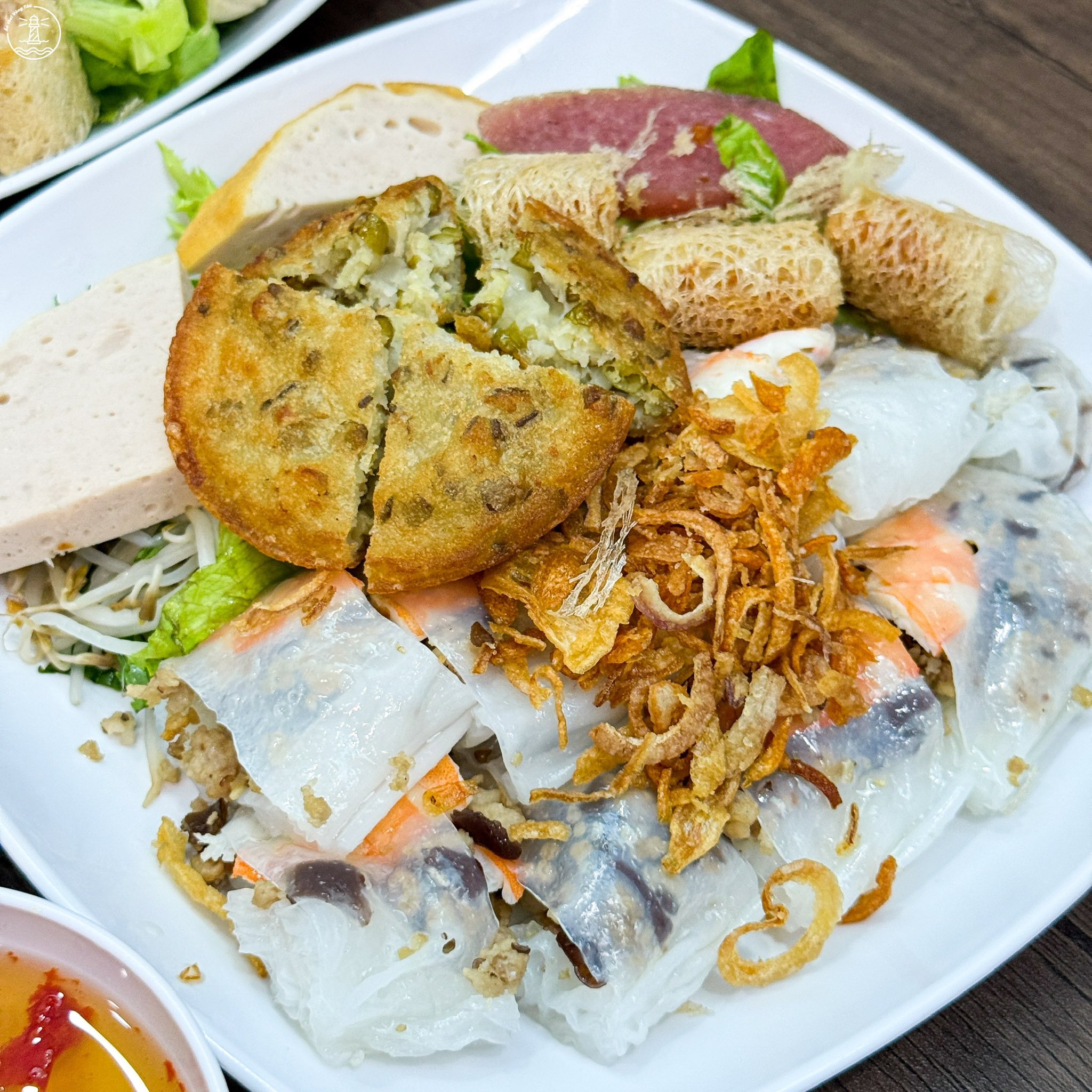 Điểm nhấn của quán còn nằm ở phần topping ăn kèm. Một dĩa bánh cuốn nóng hổi sẽ trọn vẹn hơn khi có chả lụa thơm dai, chả chiên giòn rụm, nem chua chua ngọt, bánh cống nóng hổi hay chả giò rế vàng giòn.