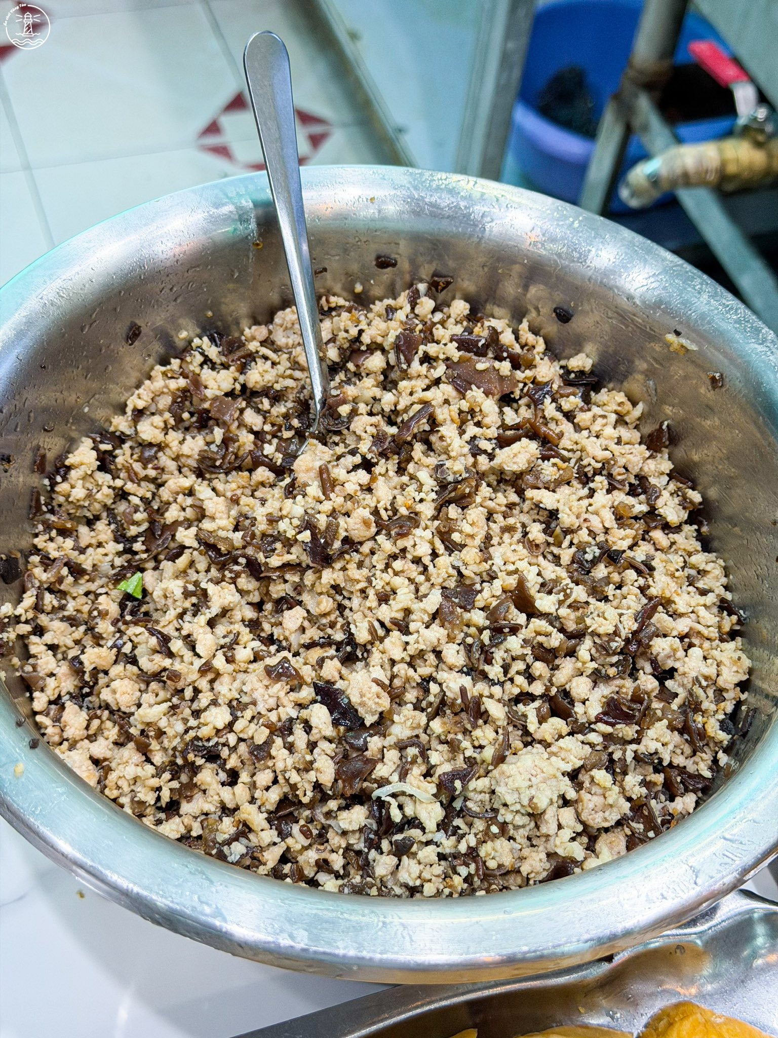 Nhân bánh được xào thủ công hằng ngày, chỉ gồm thịt heo và nấm mèo, công thức tuy đơn giản nhưng lại đủ tinh tế để giữ nguyên hương vị truyền thống hơn 30 năm qua. Chính sự tối giản ấy giúp hương vị không bị lẫn với bất kỳ nơi nào khác.