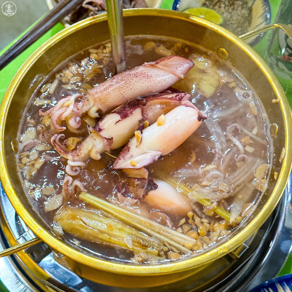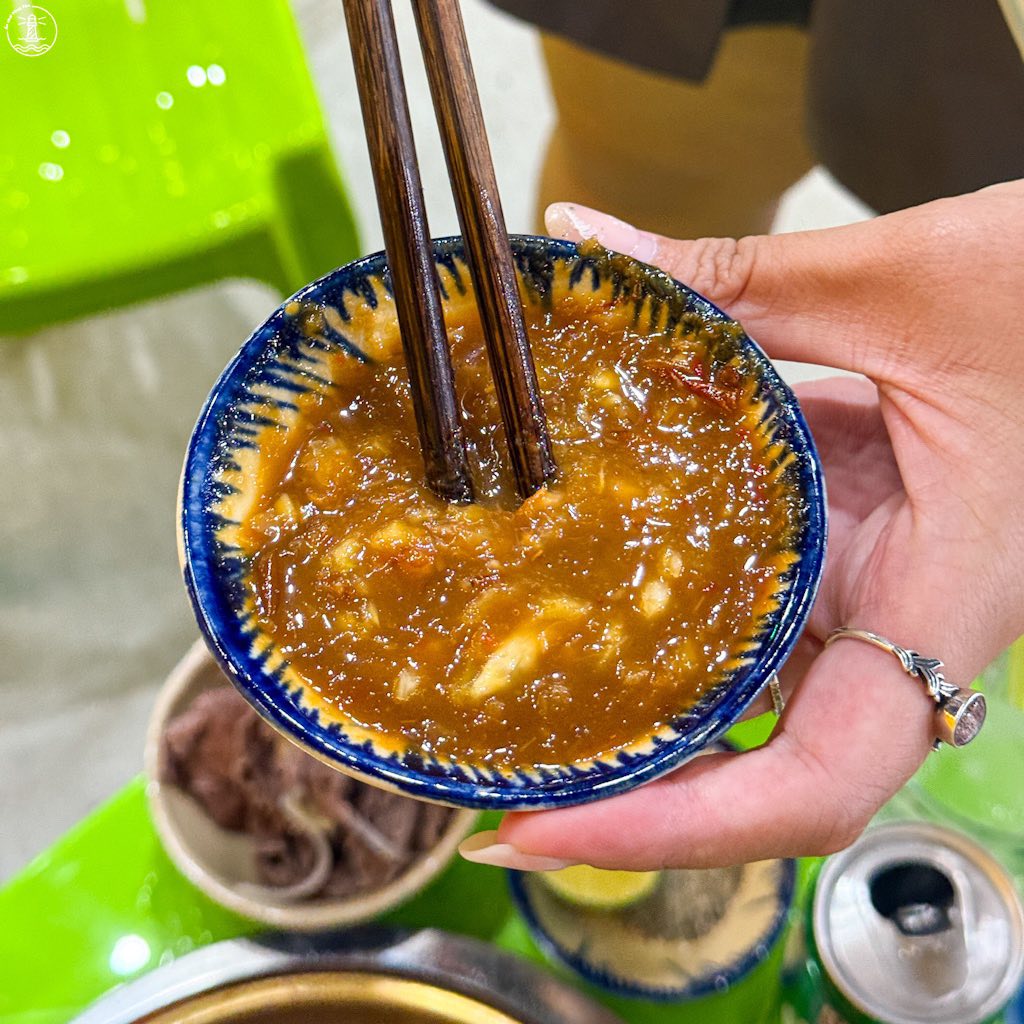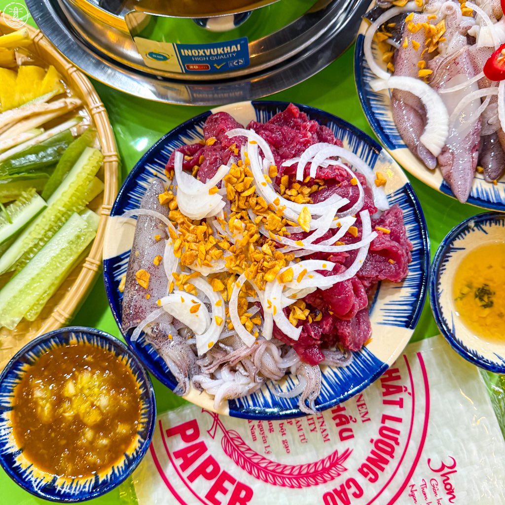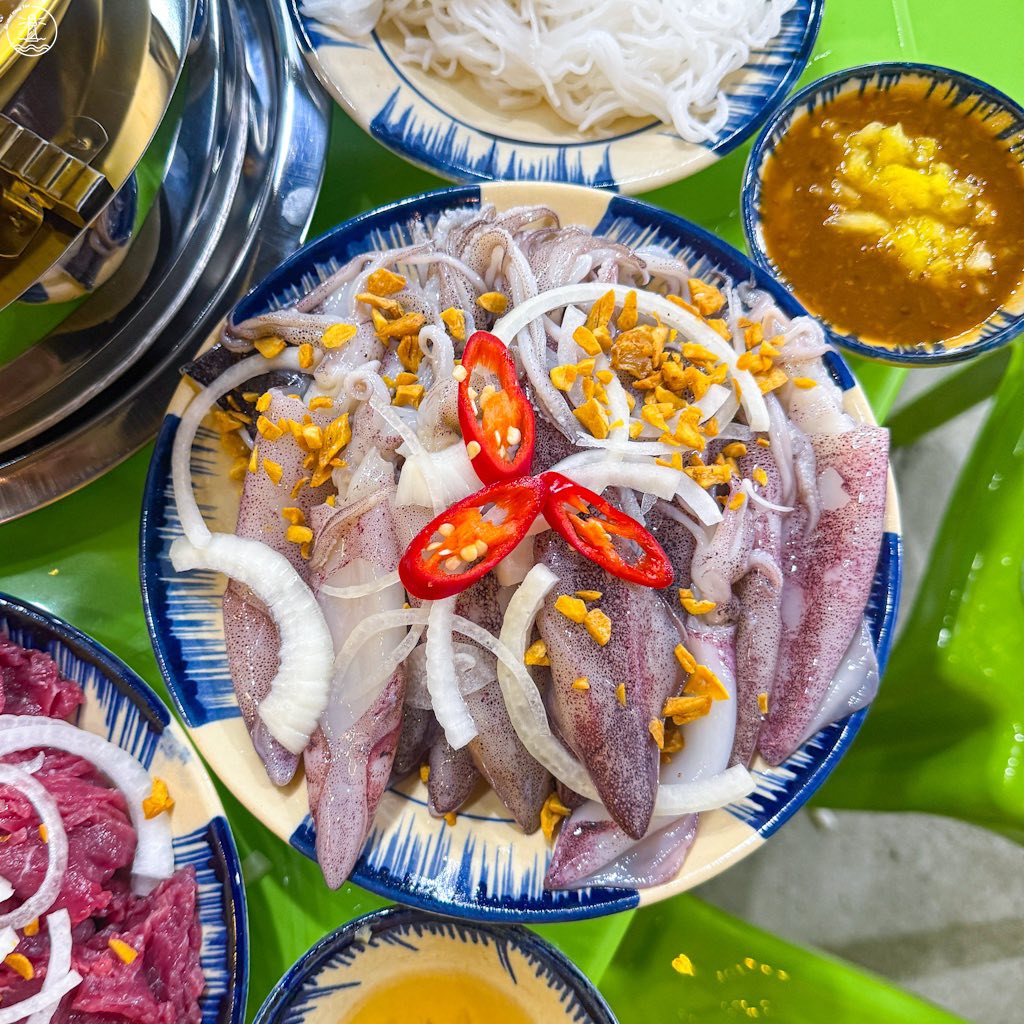 Một điểm đặc biệt khác khiến thực khách tò mò chính là phần mực nhúng giấm được thêm vào menu bên cạnh bò. Đây là sự kết hợp hiếm thấy ở các quán bò nhúng truyền thống. Việc lựa chọn giữa thịt bò mềm hay mực giòn tạo ra trải nghiệm mới lạ mà không làm mất đi tinh thần nhẹ nhàng, thanh vị vốn có của món ăn.