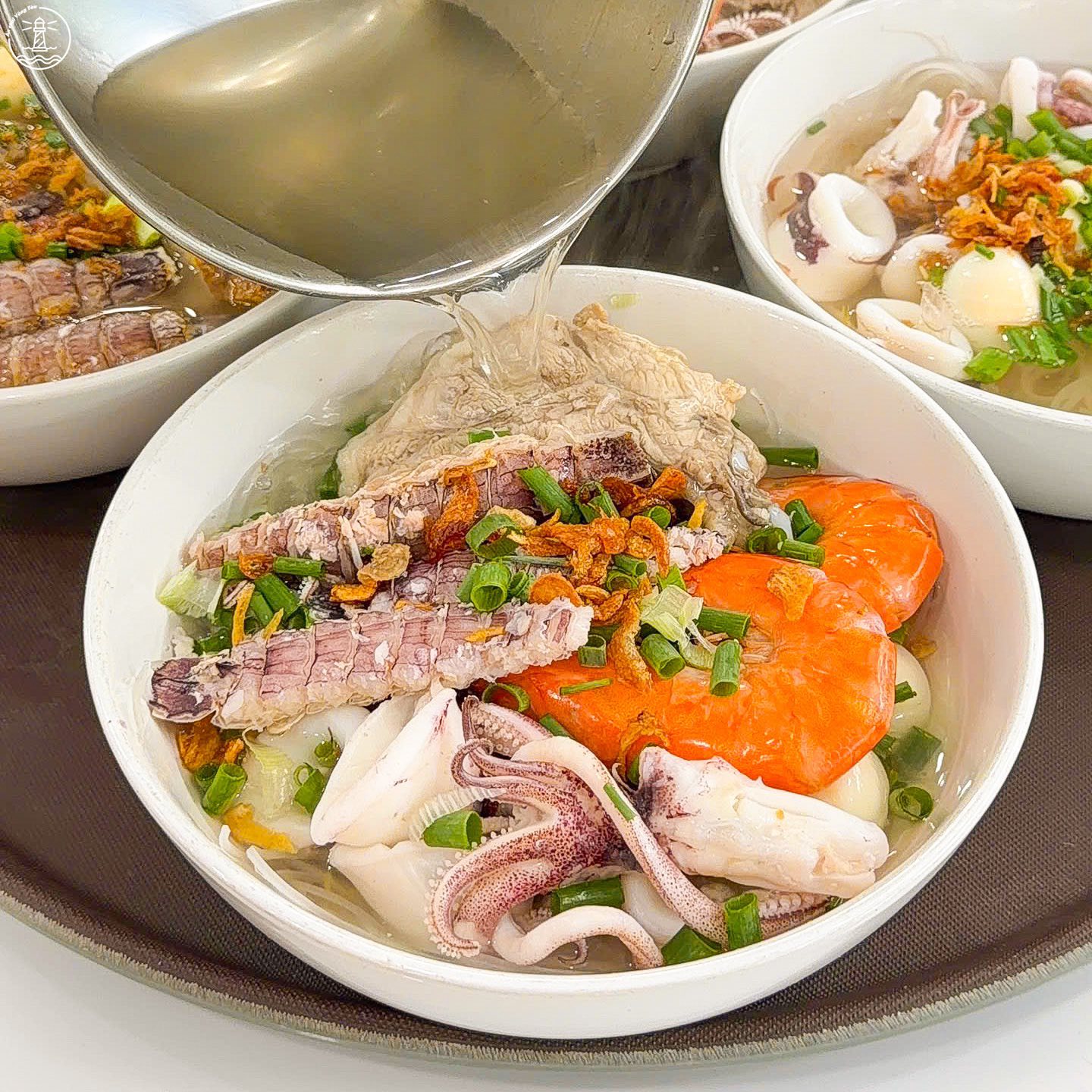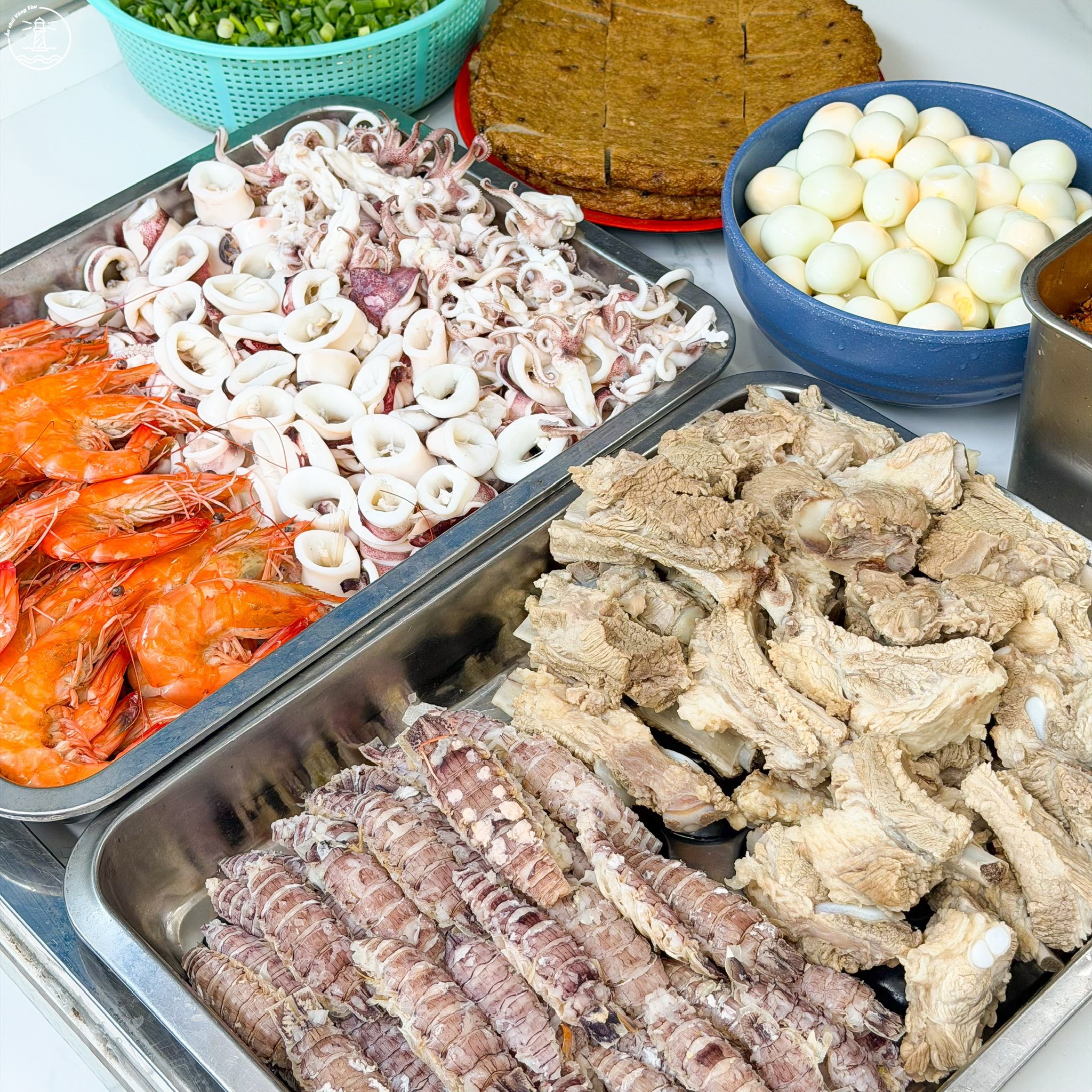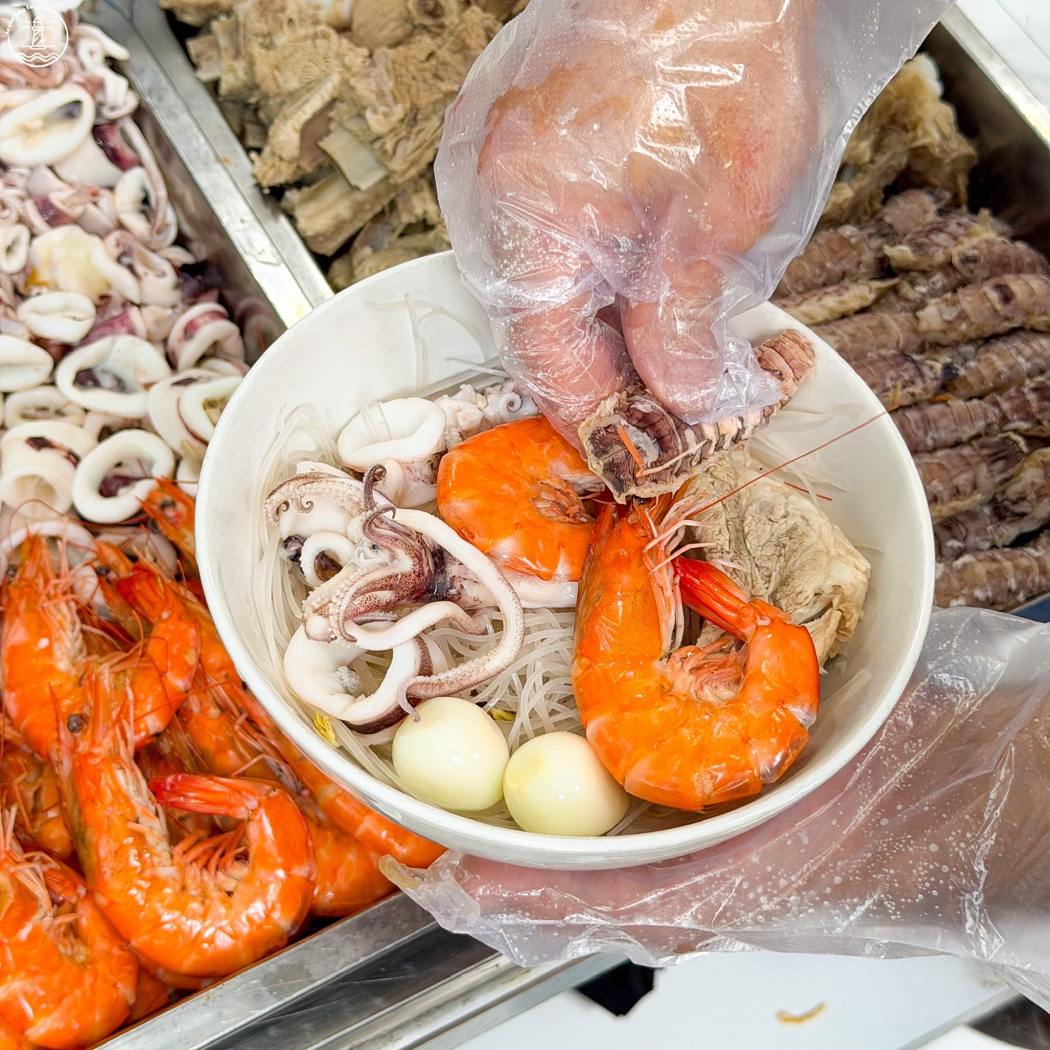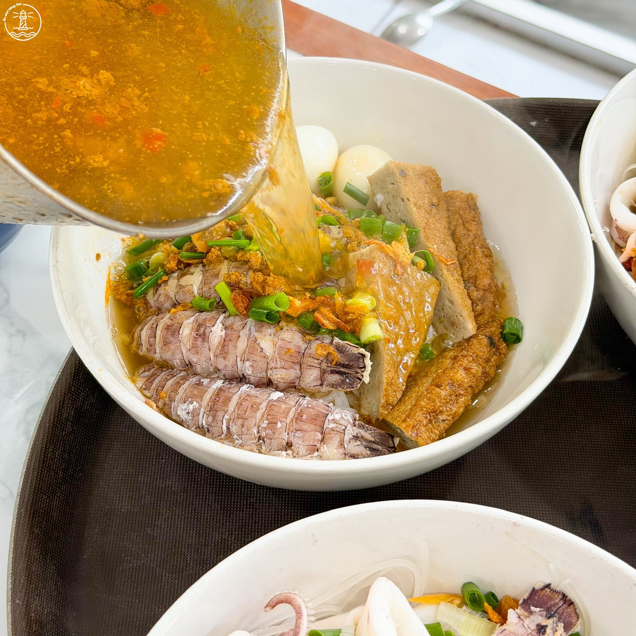 Ngoài hải sản, quán còn kết hợp thêm chả cá, sườn và trứng cút để tăng độ đa dạng cho món ăn. Nhờ sự kết hợp này, mỗi tô đều mang lại cảm giác đầy đặn, vừa có vị ngọt tự nhiên từ hải sản, vừa có độ đậm đà từ các nguyên liệu đi kèm.