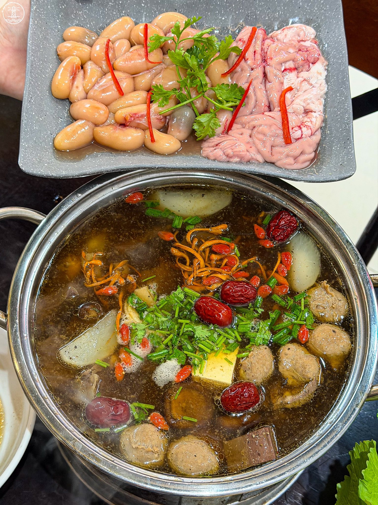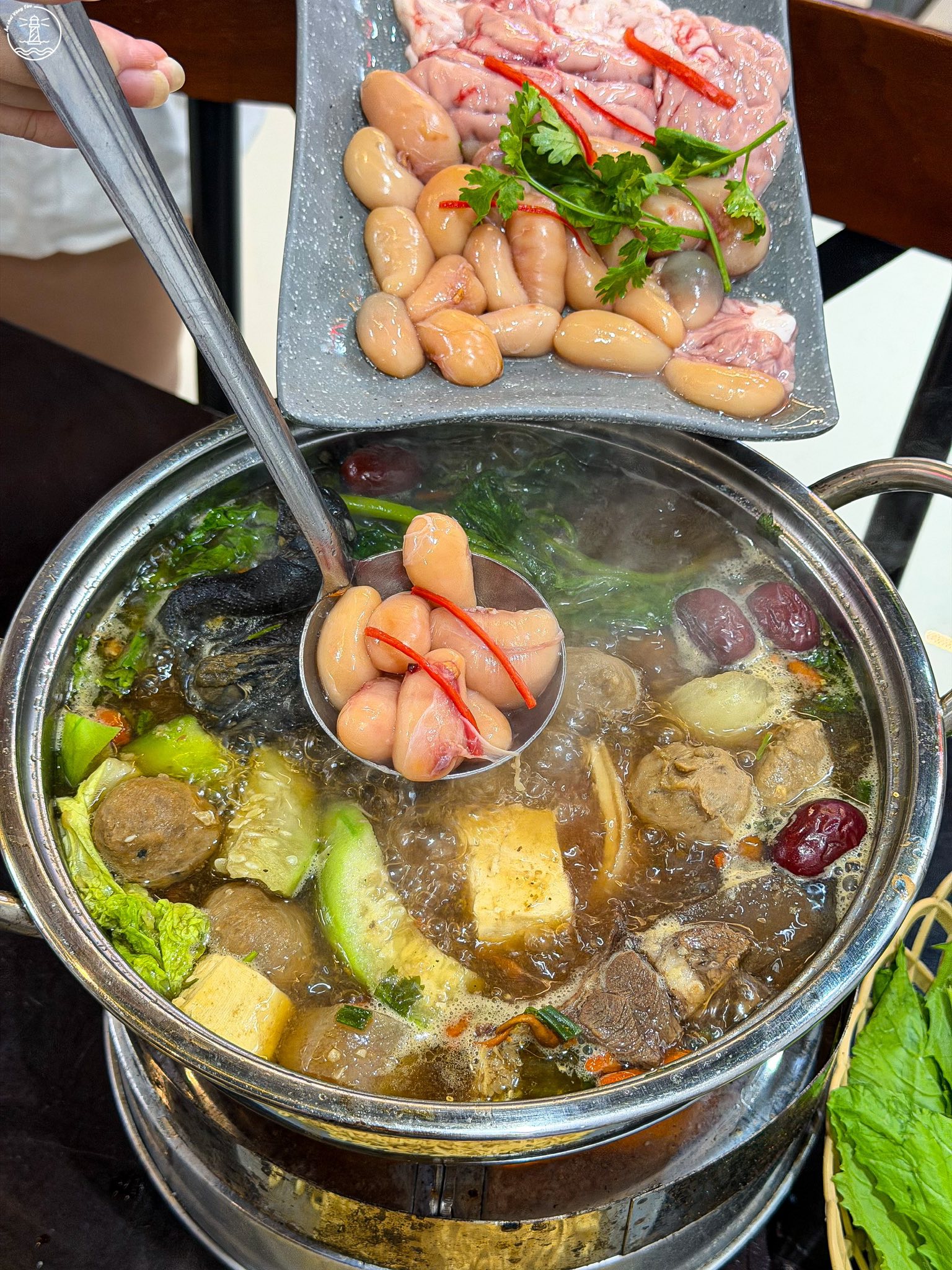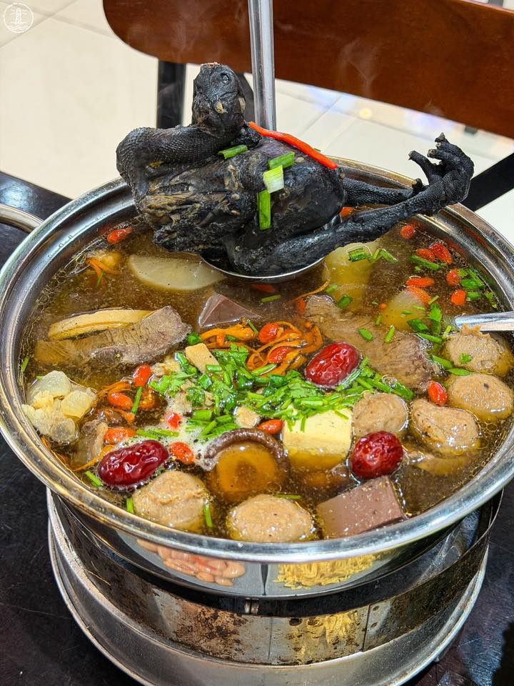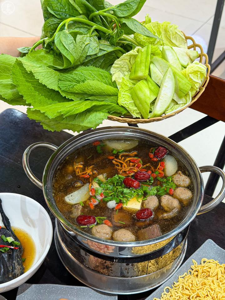 Để trải nghiệm ẩm thực thêm phần trọn vẹn, bạn nhất định nên gọi thêm gà ác tiềm và óc heo để nhúng lẩu. Thịt gà ác nhỏ nhưng chắc thịt, khi thả vào nồi lẩu sẽ thấm đẫm hương vị thảo mộc vào từng thớ thịt, mang lại cảm giác ngọt mềm khó cưỡng. Phần óc heo tươi rói, khi chín tới ăn vào béo ngậy, tan ngay trong miệng hòa quyện cùng nước dùng nóng hổi thực sự là một trải nghiệm gây nghiện.