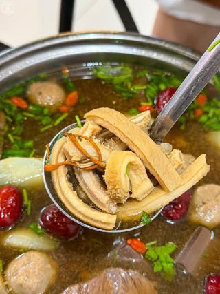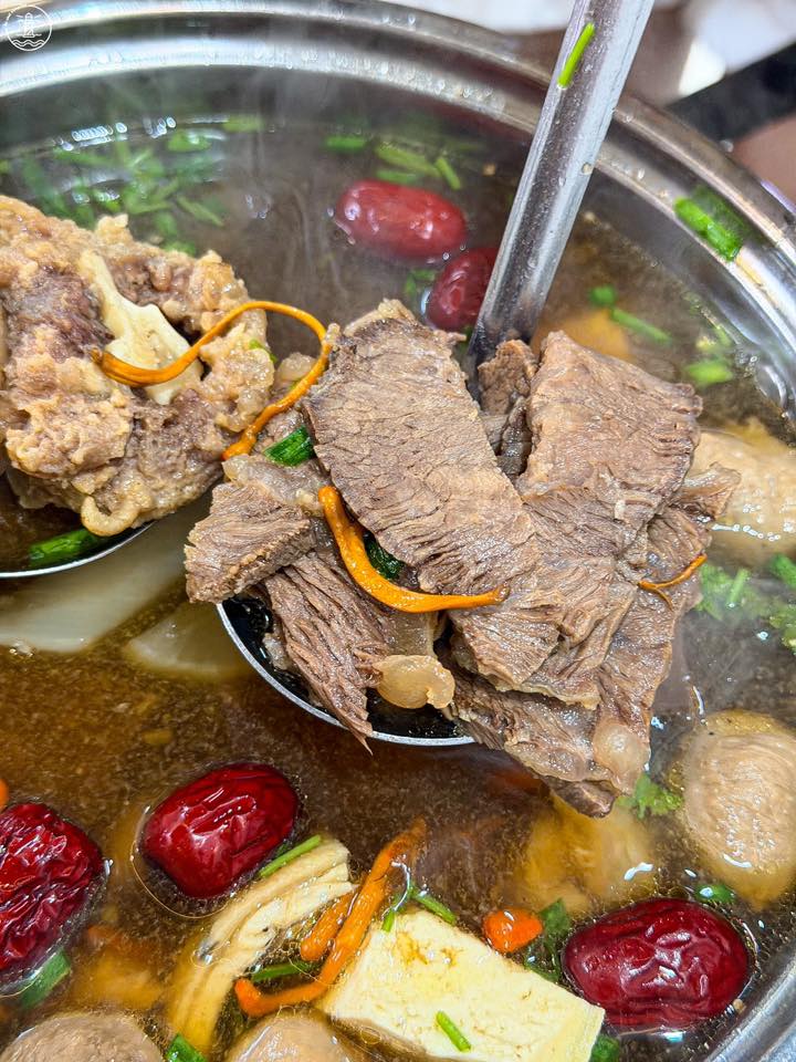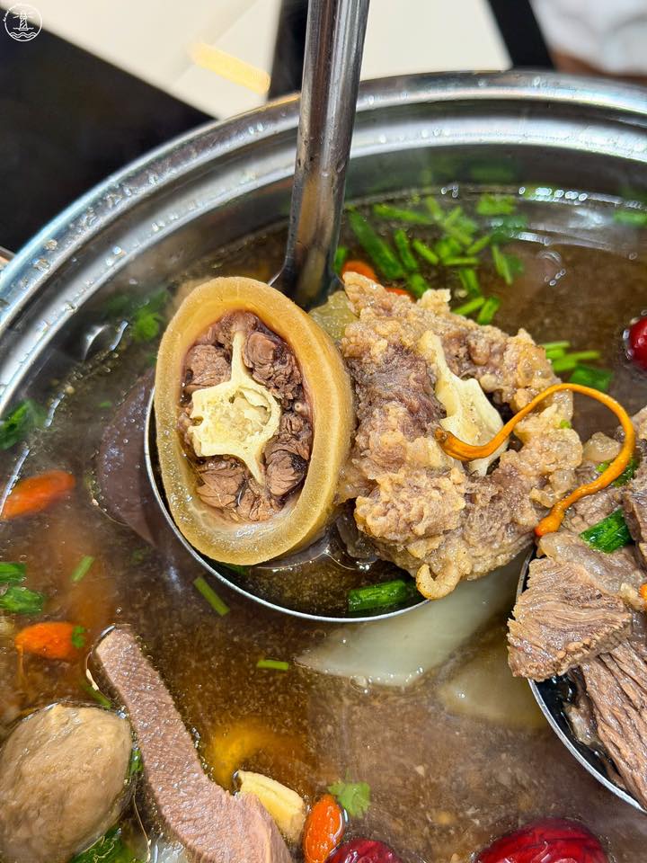 Điều làm nên linh hồn của món lẩu này chính là phần nước dùng mang hương vị thảo mộc đặc trưng vô cùng dễ ăn. Khác với lo ngại về mùi thuốc bắc nồng gắt thường thấy, nước dùng tại quán lẩu bò tiềm có vị ngọt thanh, mùi thơm chỉ thoang thoảng rất dễ chịu. Bí quyết nằm ở sự kết hợp khéo léo giữa nước hầm xương và các vị thuốc bắc bổ dưỡng như táo tàu, kỷ tử, và đặc biệt là sự xuất hiện của đông trùng hạ thảo. Những nguyên liệu này không chỉ giúp nước lẩu càng đun càng đậm đà, ngọt sâu mà còn có tác dụng bồi bổ cơ thể, làm ấm bụng, cực kỳ thích hợp cho những buổi tối se lạnh hay những ngày bạn cảm thấy mệt mỏi cần nạp lại năng lượng.