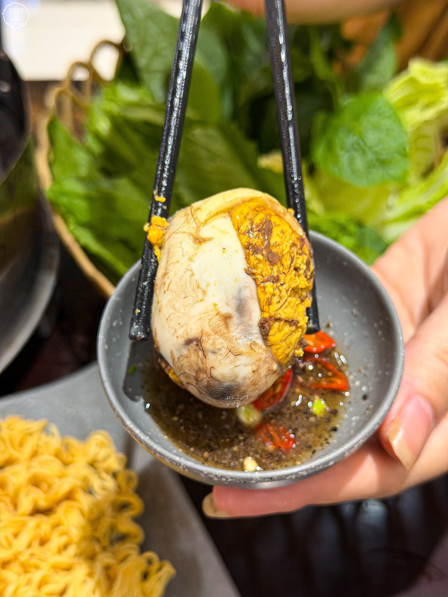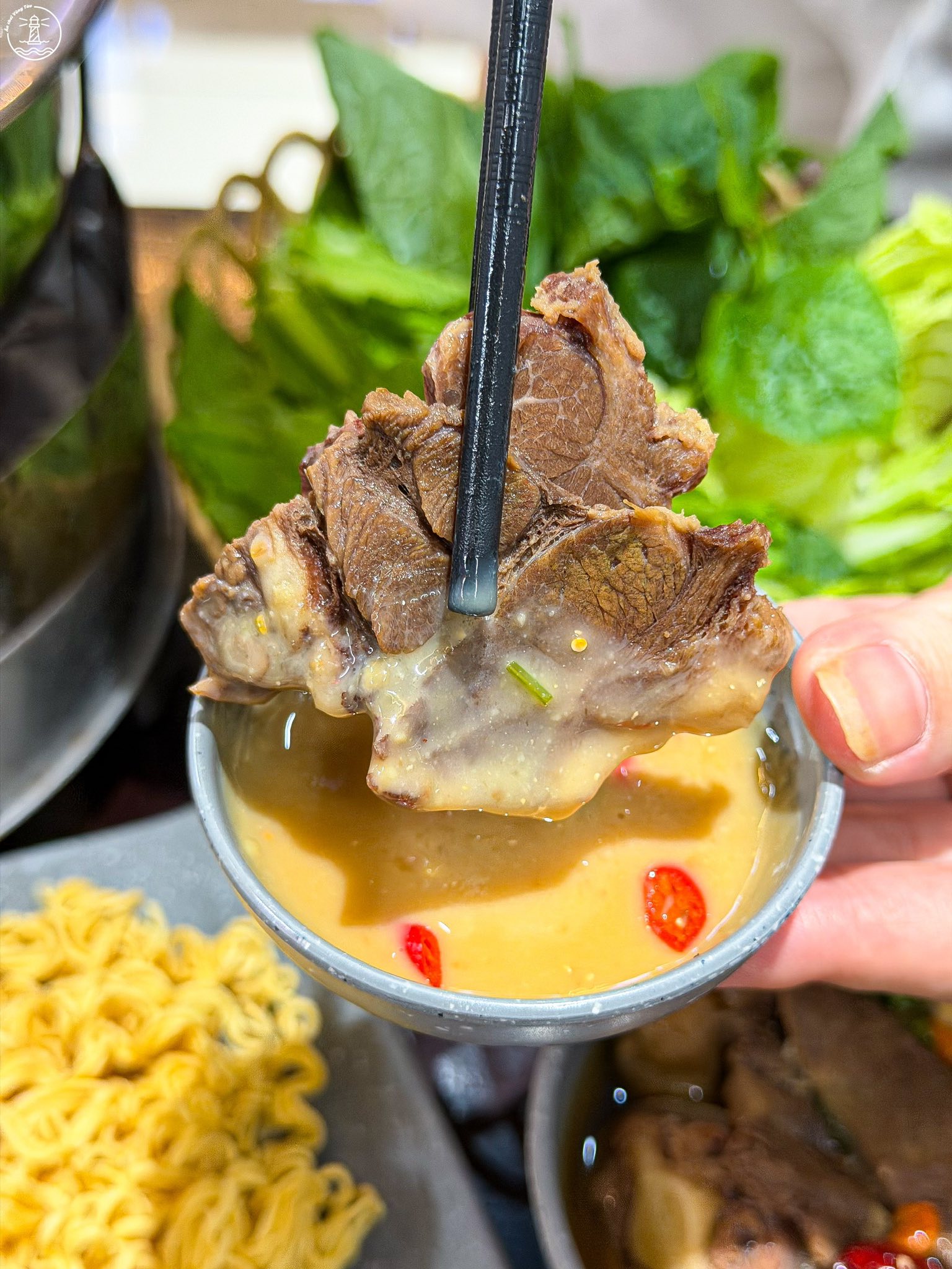Thịt bò tại quán được sơ chế và tẩm ướp gia vị rất vừa vặn, sau đó hầm mềm cùng nước xương nên giữ được độ ngọt tự nhiên, không hề bị khô hay bở. Khi ăn, bạn chỉ cần chấm một miếng thịt đẫm nước lẩu vào chén chao pha sẵn béo bùi là đảm bảo hết sảy.