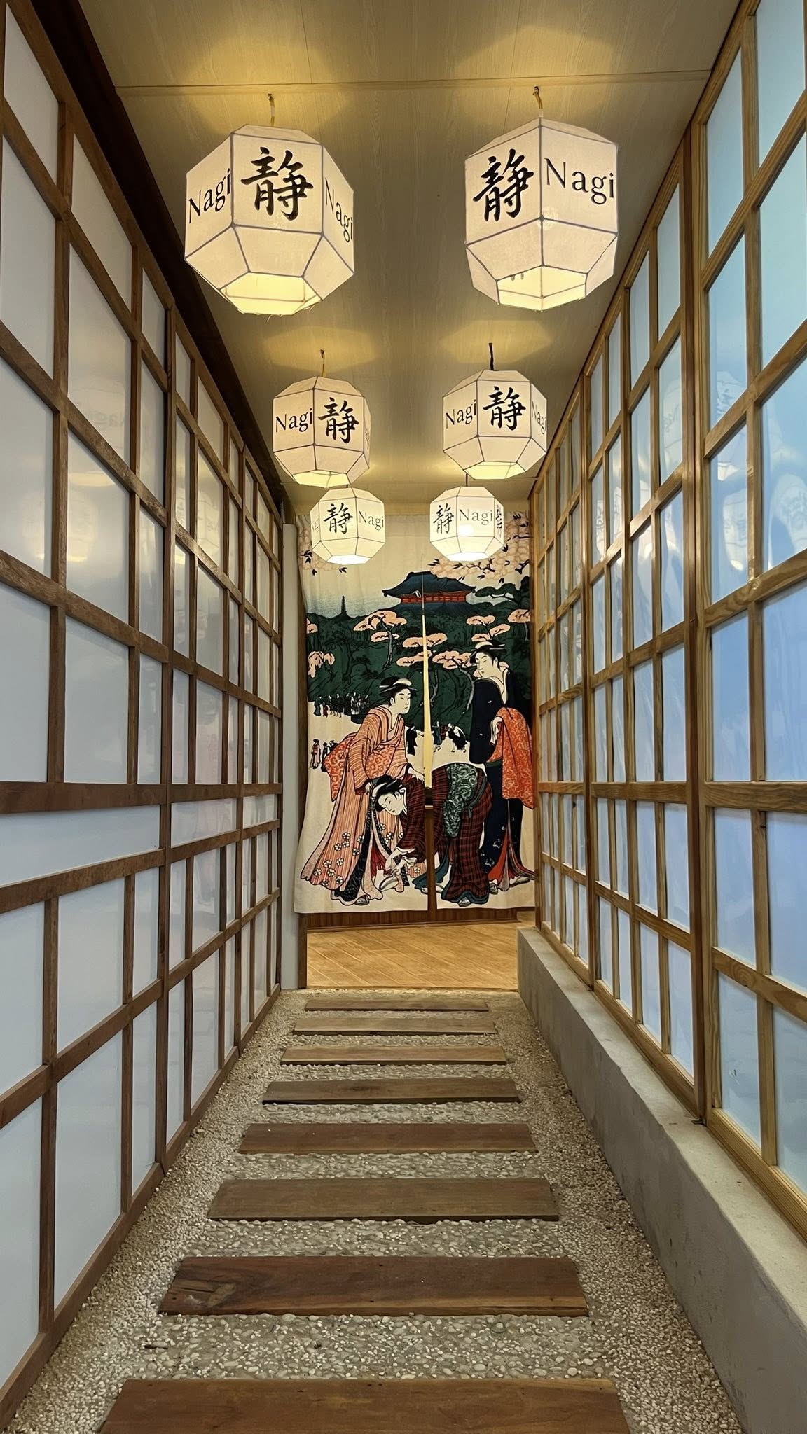 Khu vực phía trước được bố trí như một góc vườn nhỏ với cây xanh và bảng hiệu mang phong cách Nhật, tạo ấn tượng ngay từ cái nhìn đầu tiên. Bên trong quán là sự đa dạng về chỗ ngồi, từ bàn ghế cao quen thuộc đến khu bàn thấp kiểu Nhật dành cho khách thích trải nghiệm mới mẻ. Những ô cửa kính lớn giúp tận dụng ánh sáng tự nhiên, đồng thời mở ra nhiều góc chụp ảnh được yêu thích.