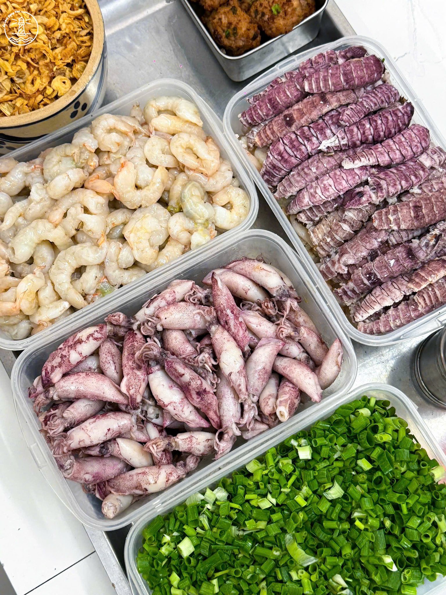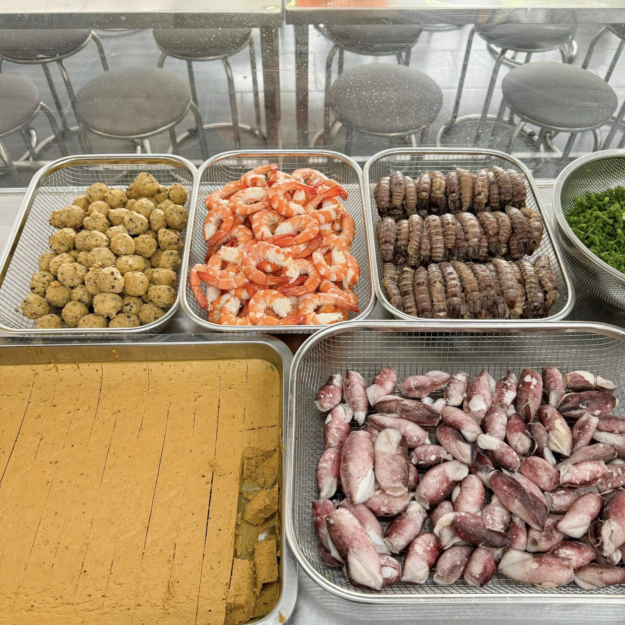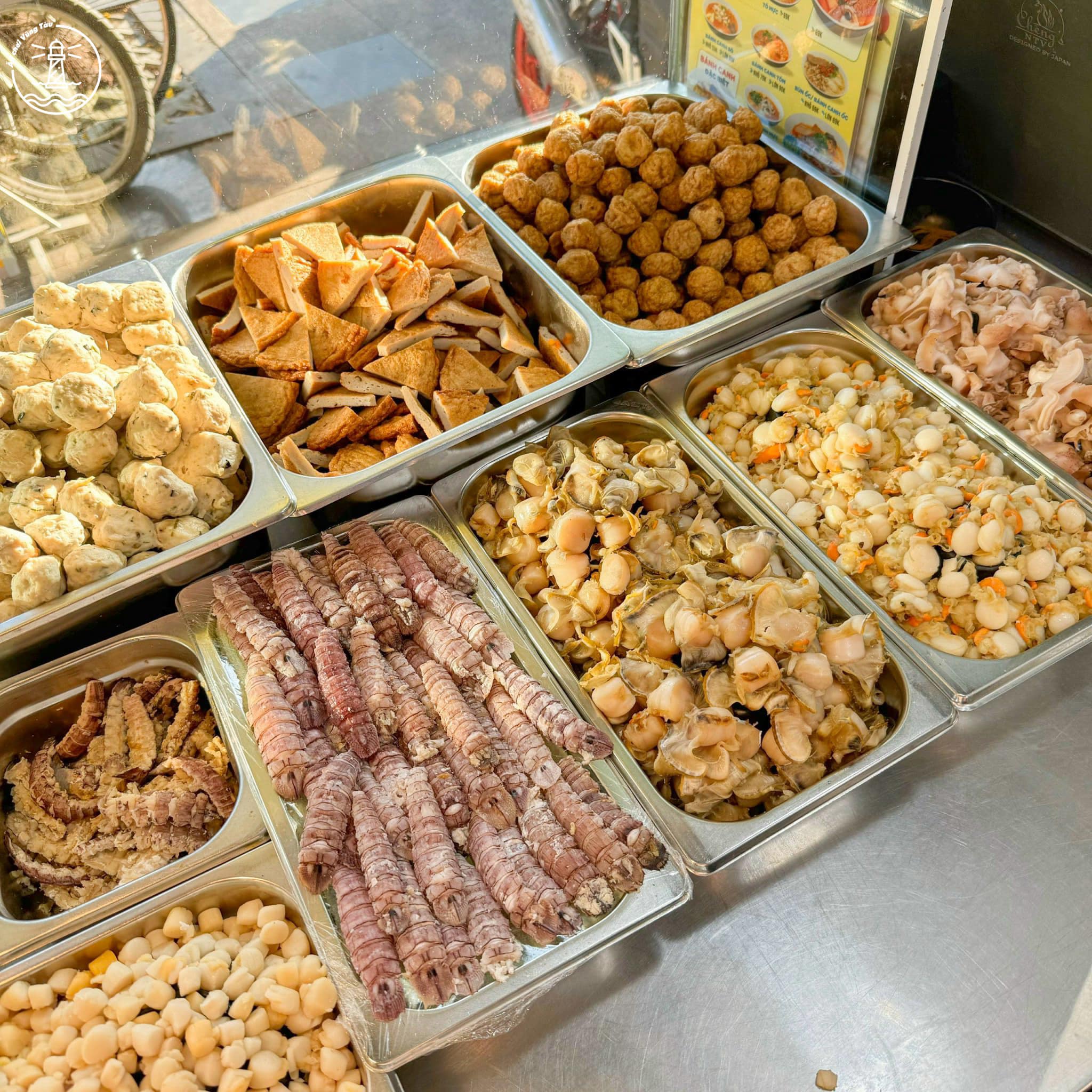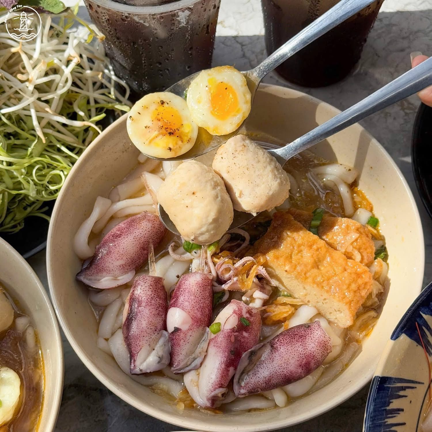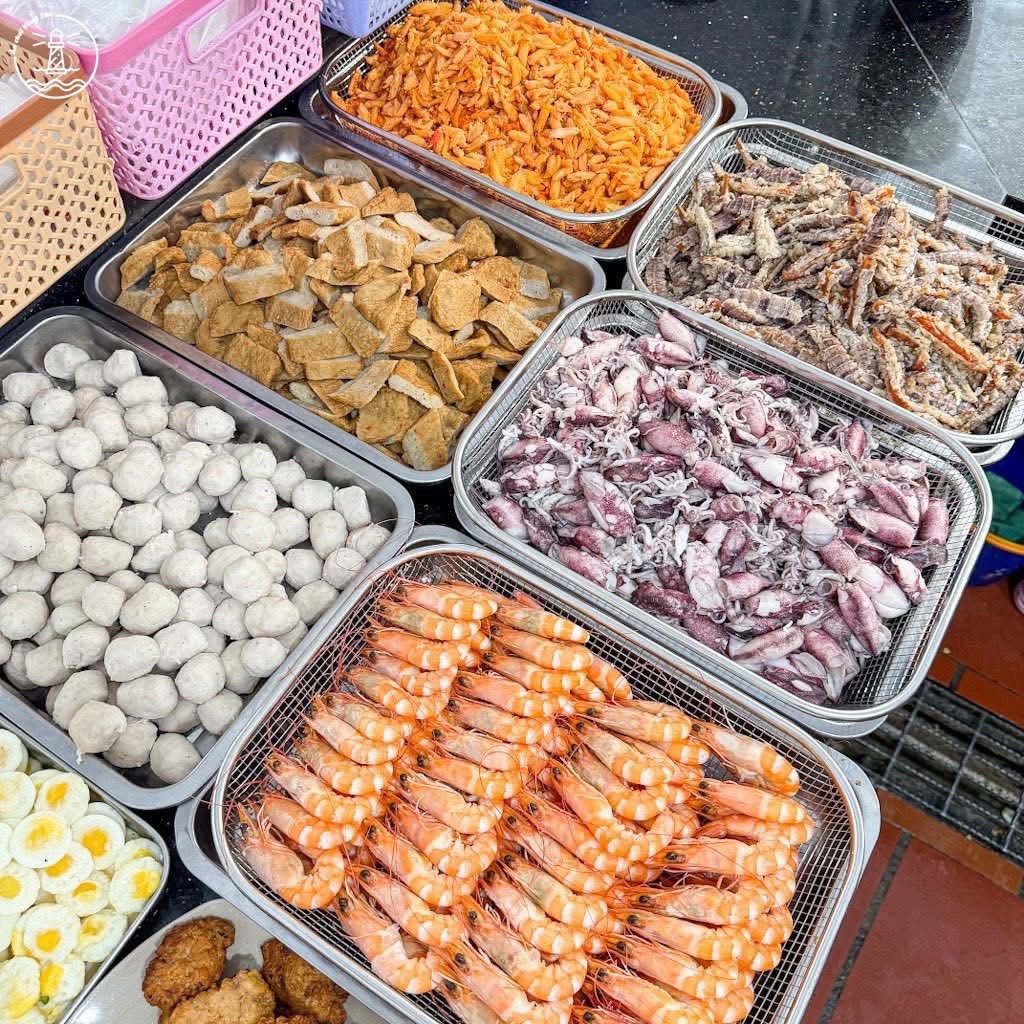 Quầy topping tại quán khá phong phú với nhiều loại hải sản tươi như bề bề, tôm, mực, ghẹ, đi kèm chả cá, mọc và trứng cút lòng đào. Nổi bật nhất là chả mực được làm từ mực tươi giã tay nên giữ được độ dai mềm và vị ngọt tự nhiên, khi chiên lên vàng giòn bên ngoài nhưng bên trong vẫn mọng nước, tạo cảm giác rất tròn vị khi thưởng thức.
