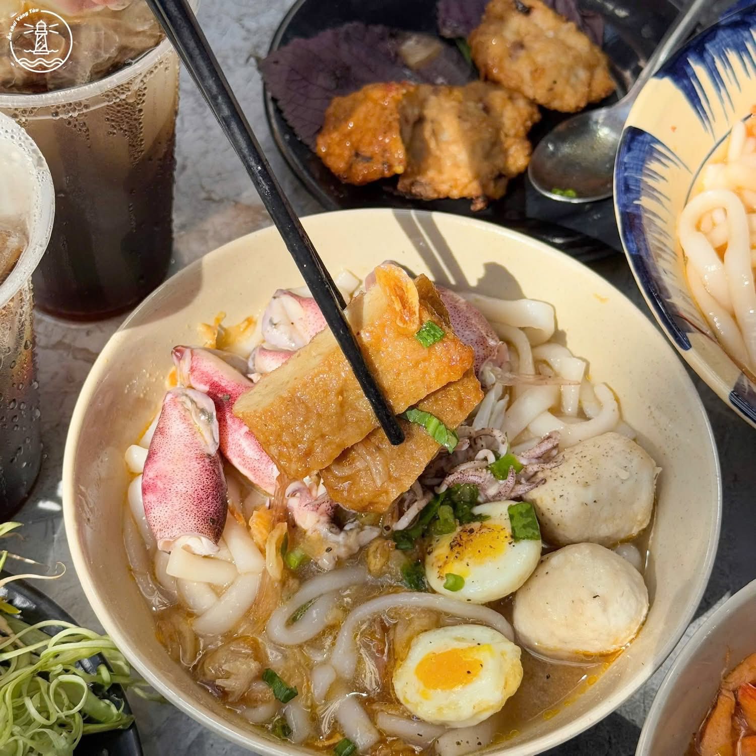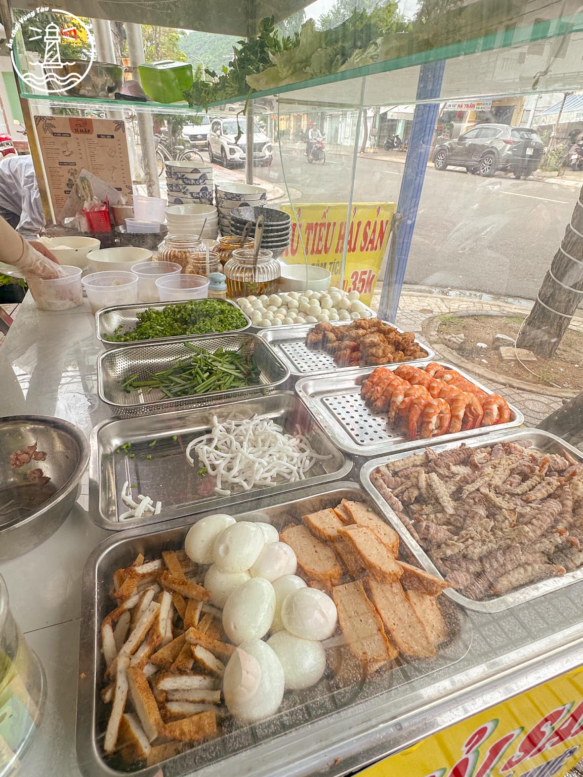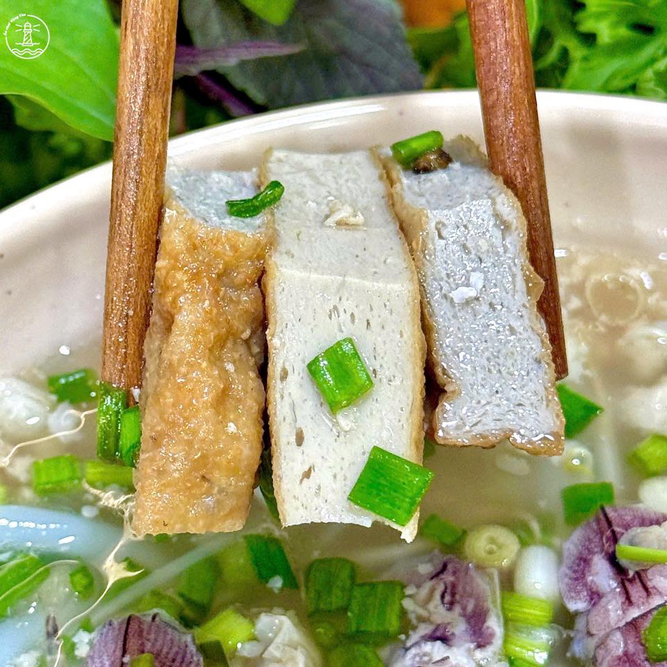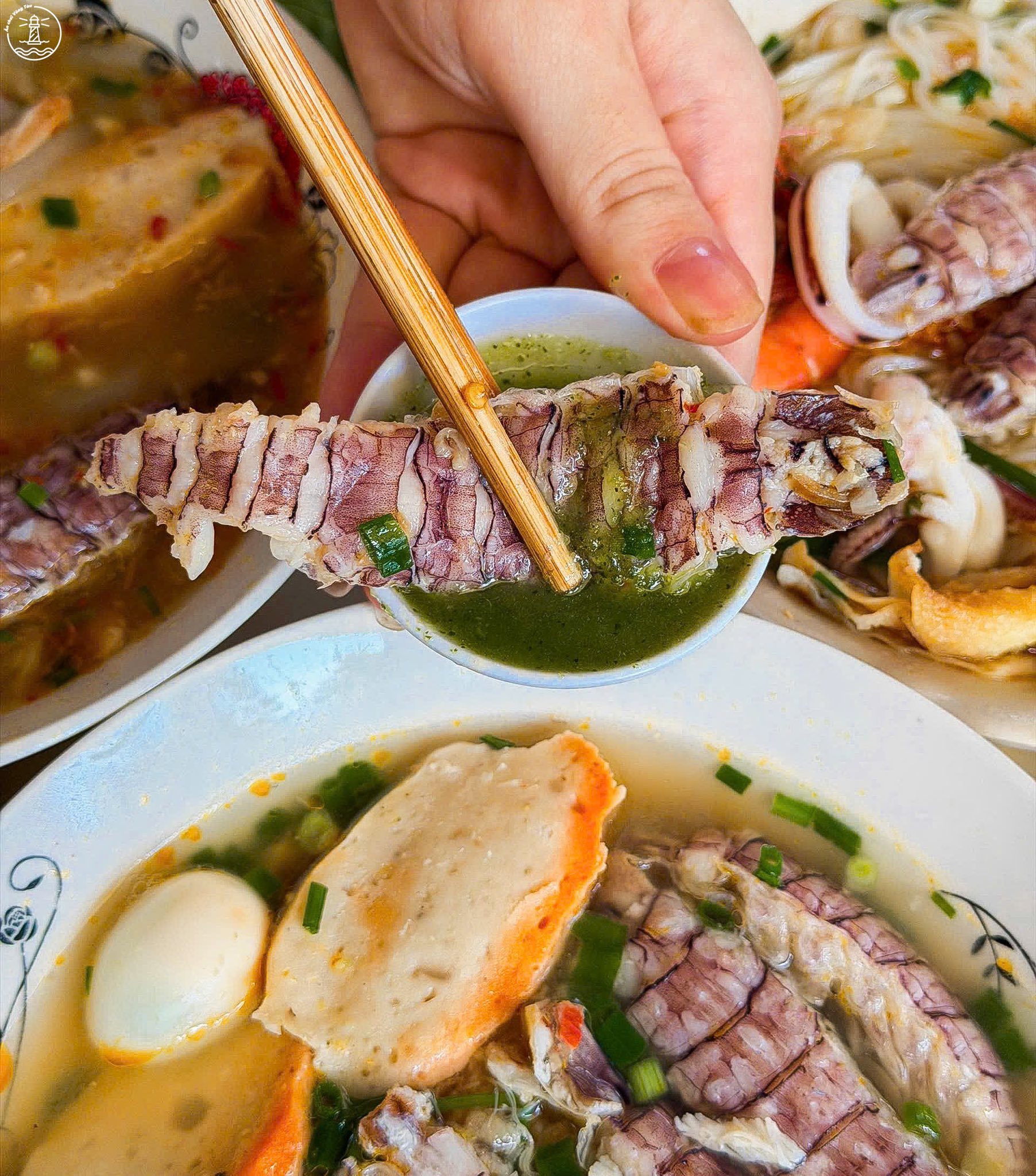 Quầy topping tại quán khá phong phú với nhiều loại hải sản tươi như bề bề, tôm, mực, ghẹ, đi kèm chả cá, mọc và trứng cút lòng đào. Nổi bật nhất là chả mực được làm từ mực tươi giã tay nên giữ được độ dai mềm và vị ngọt tự nhiên, khi chiên lên vàng giòn bên ngoài nhưng bên trong vẫn mọng nước, tạo cảm giác rất tròn vị khi thưởng thức.