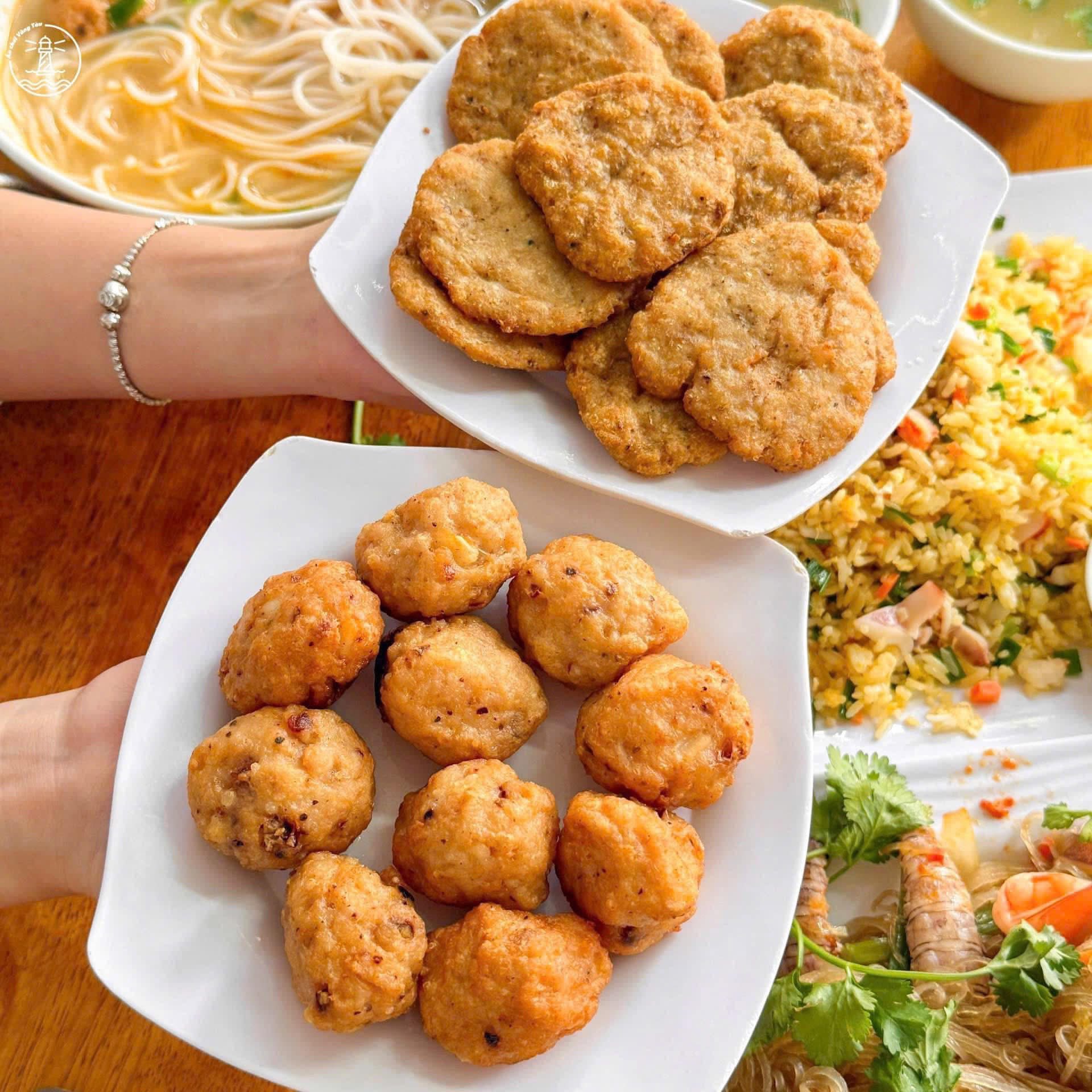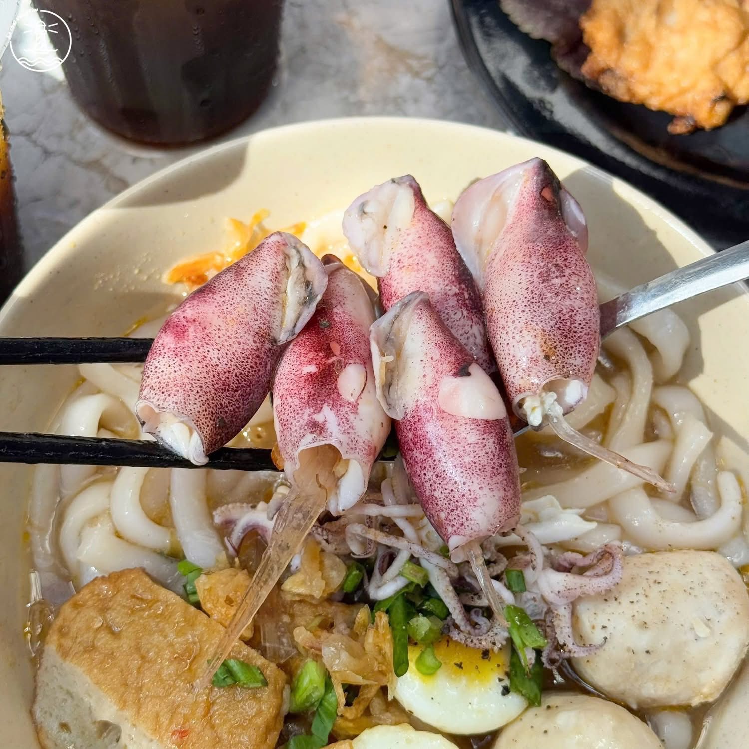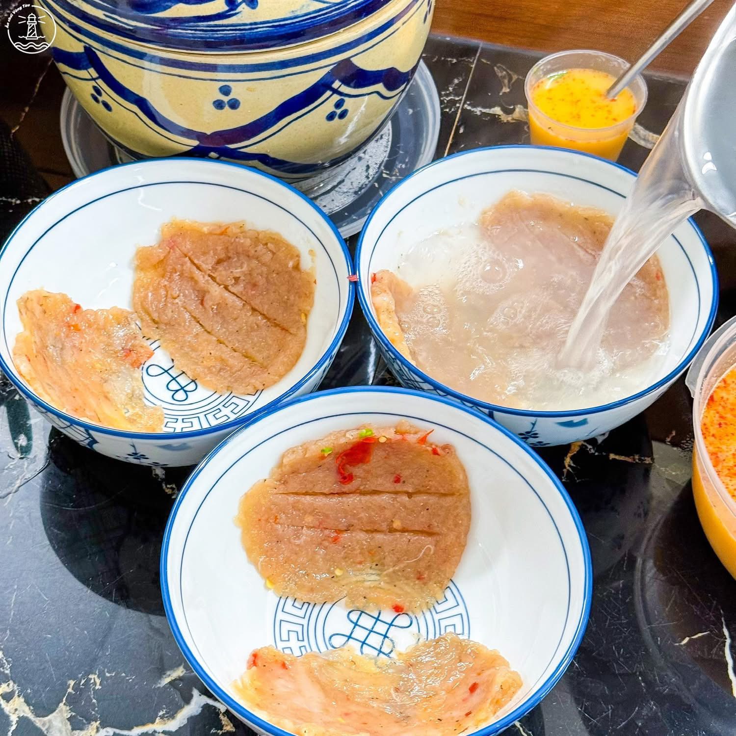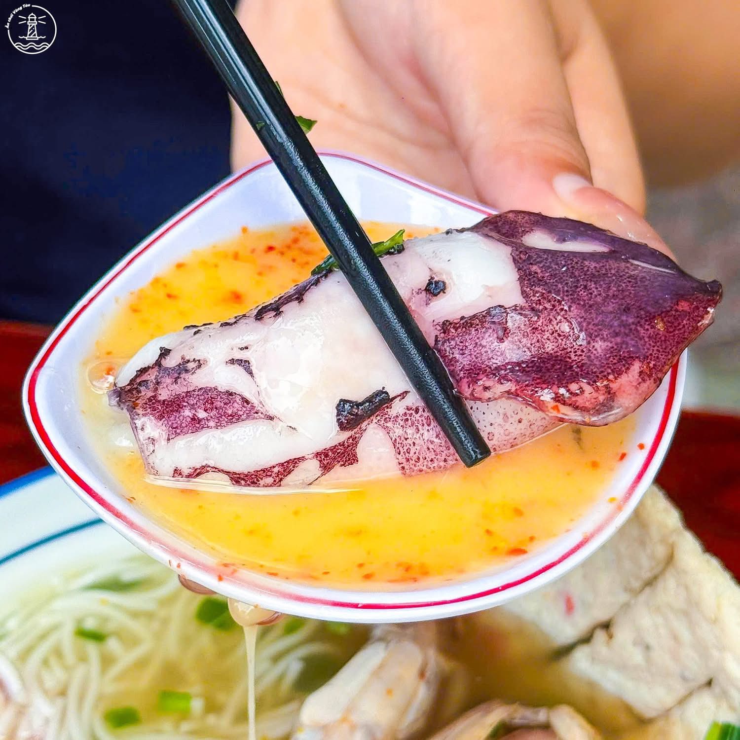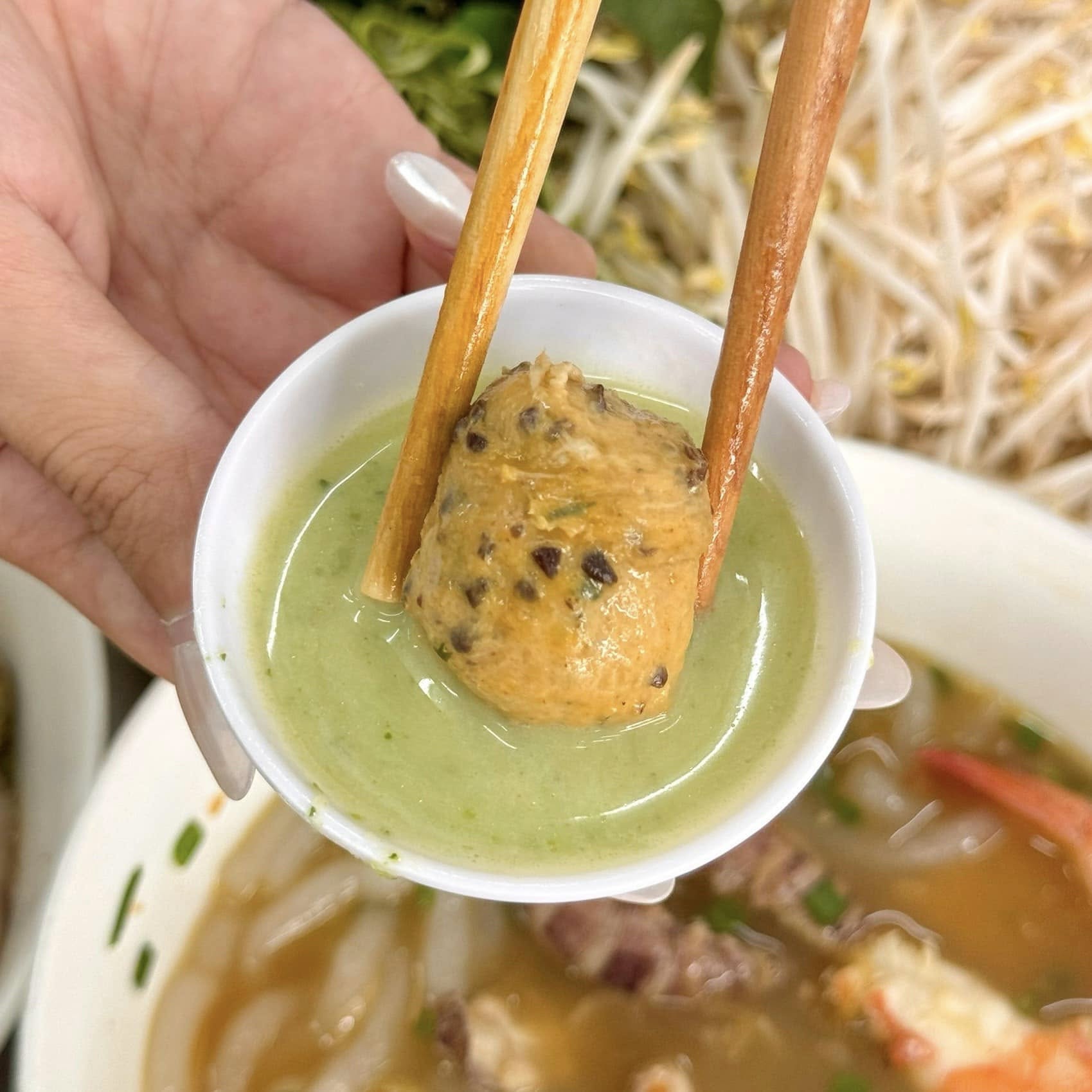 Quầy topping tại quán khá phong phú với nhiều loại hải sản tươi như bề bề, tôm, mực, ghẹ, đi kèm chả cá, mọc và trứng cút lòng đào. Nổi bật nhất là chả mực được làm từ mực tươi giã tay nên giữ được độ dai mềm và vị ngọt tự nhiên, khi chiên lên vàng giòn bên ngoài nhưng bên trong vẫn mọng nước, tạo cảm giác rất tròn vị khi thưởng thức.