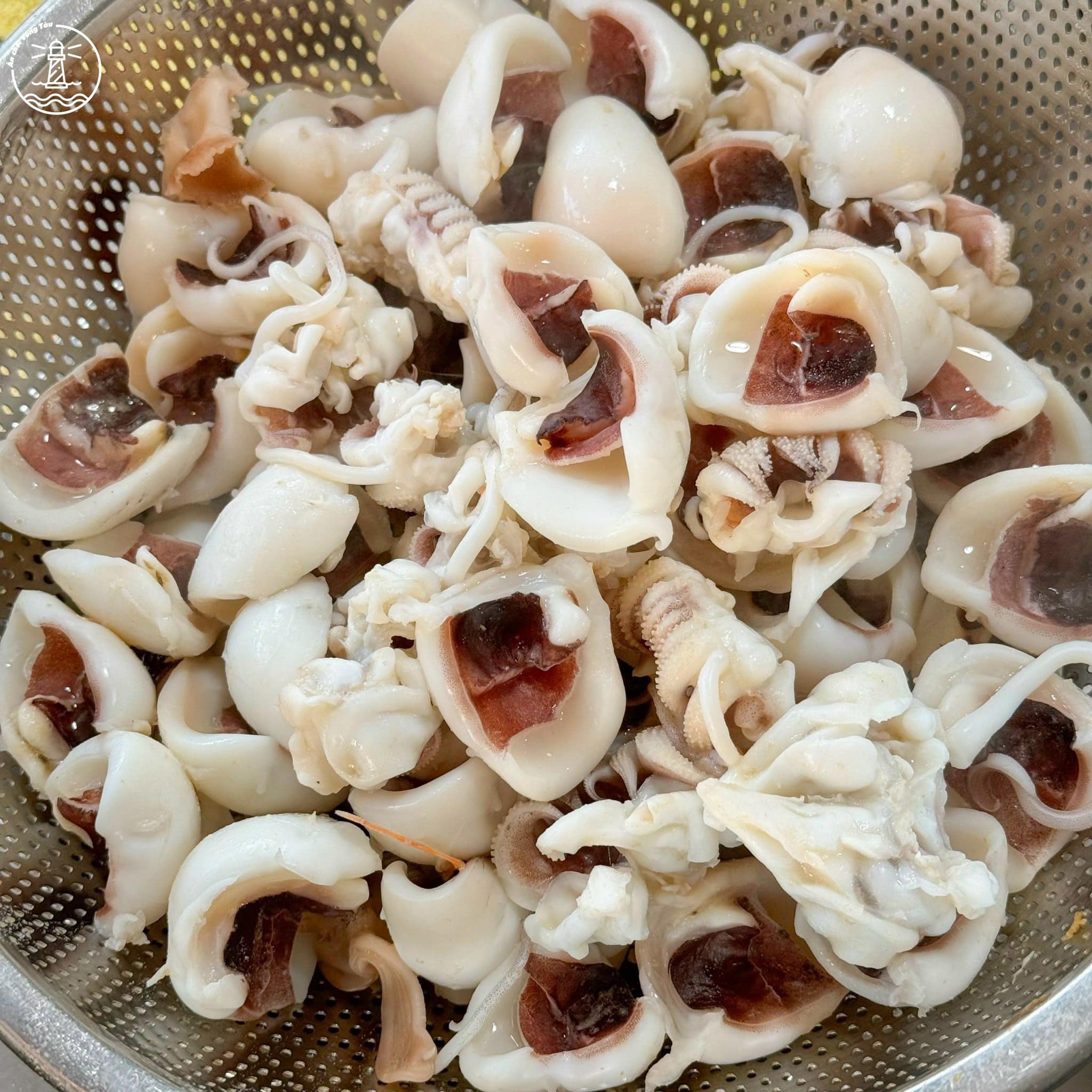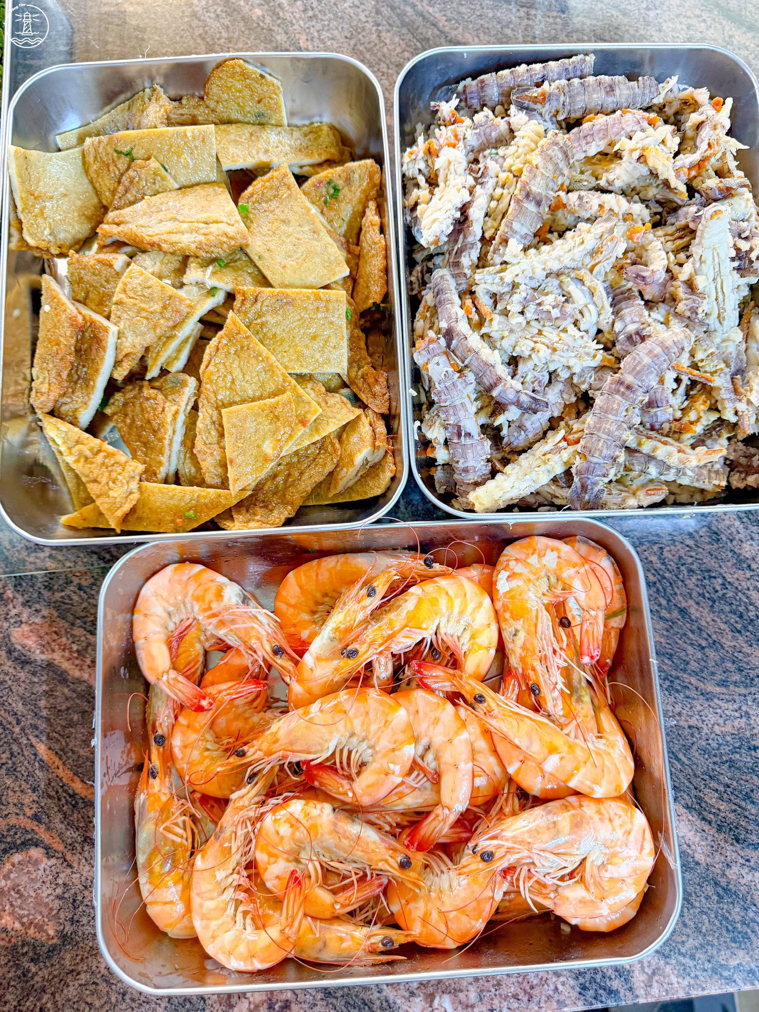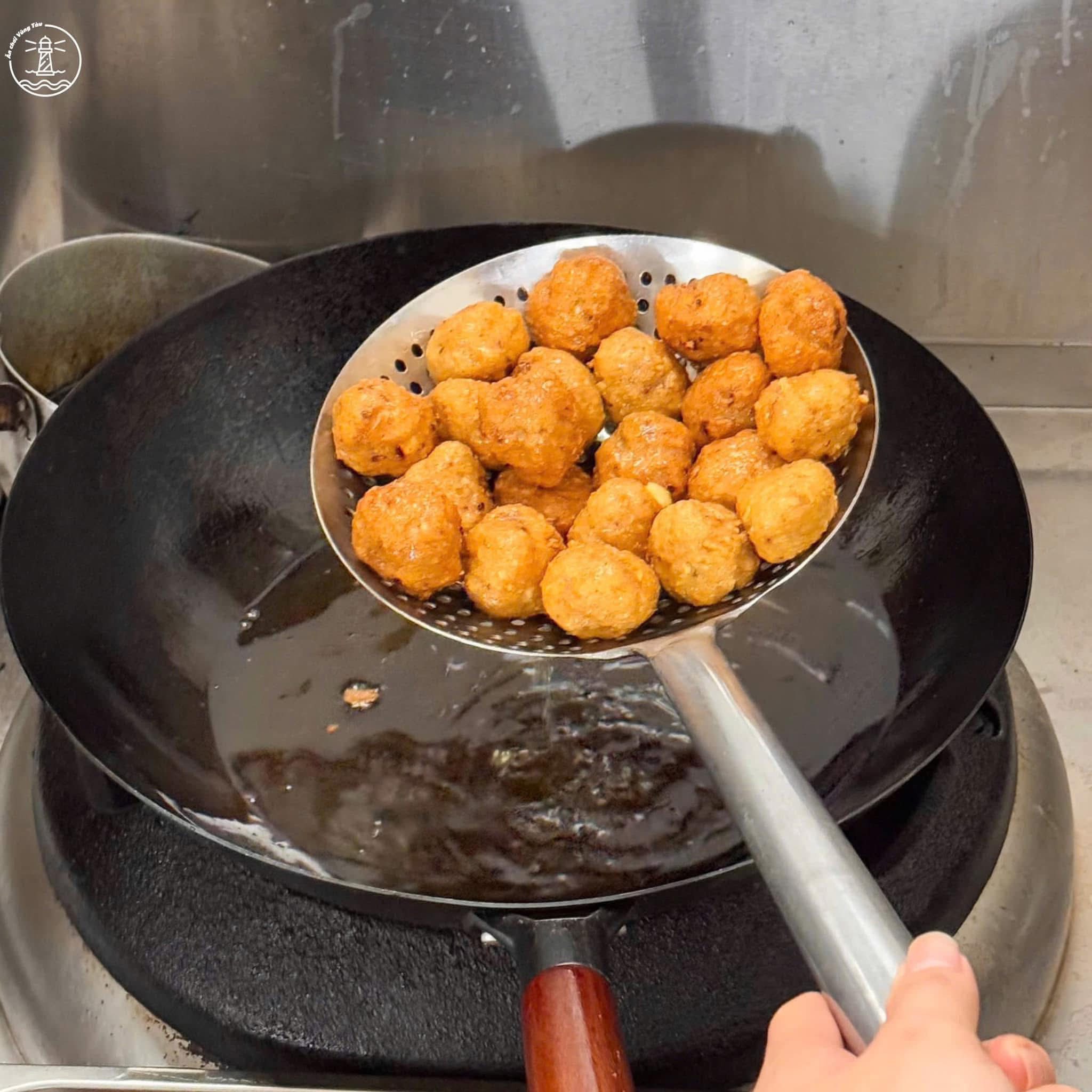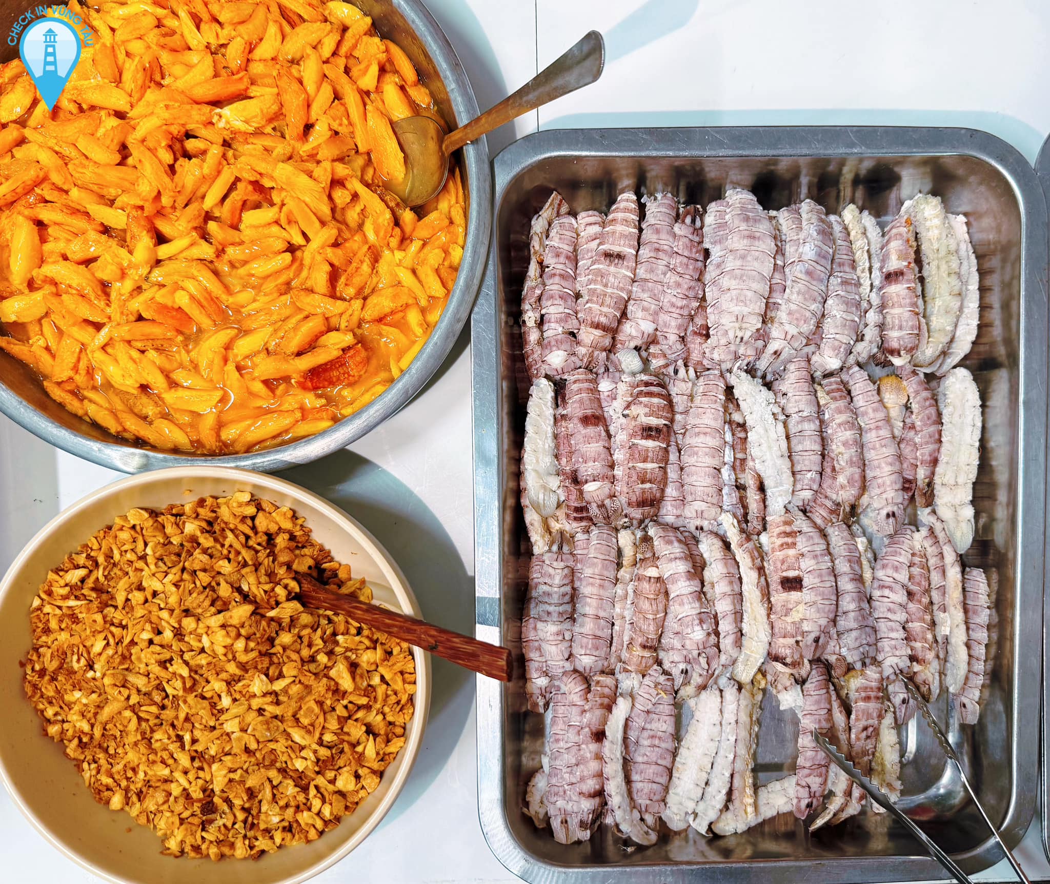 Quầy topping tại quán khá phong phú với nhiều loại hải sản tươi như bề bề, tôm, mực, ghẹ, đi kèm chả cá, mọc và trứng cút lòng đào. Nổi bật nhất là chả mực được làm từ mực tươi giã tay nên giữ được độ dai mềm và vị ngọt tự nhiên, khi chiên lên vàng giòn bên ngoài nhưng bên trong vẫn mọng nước, tạo cảm giác rất tròn vị khi thưởng thức.