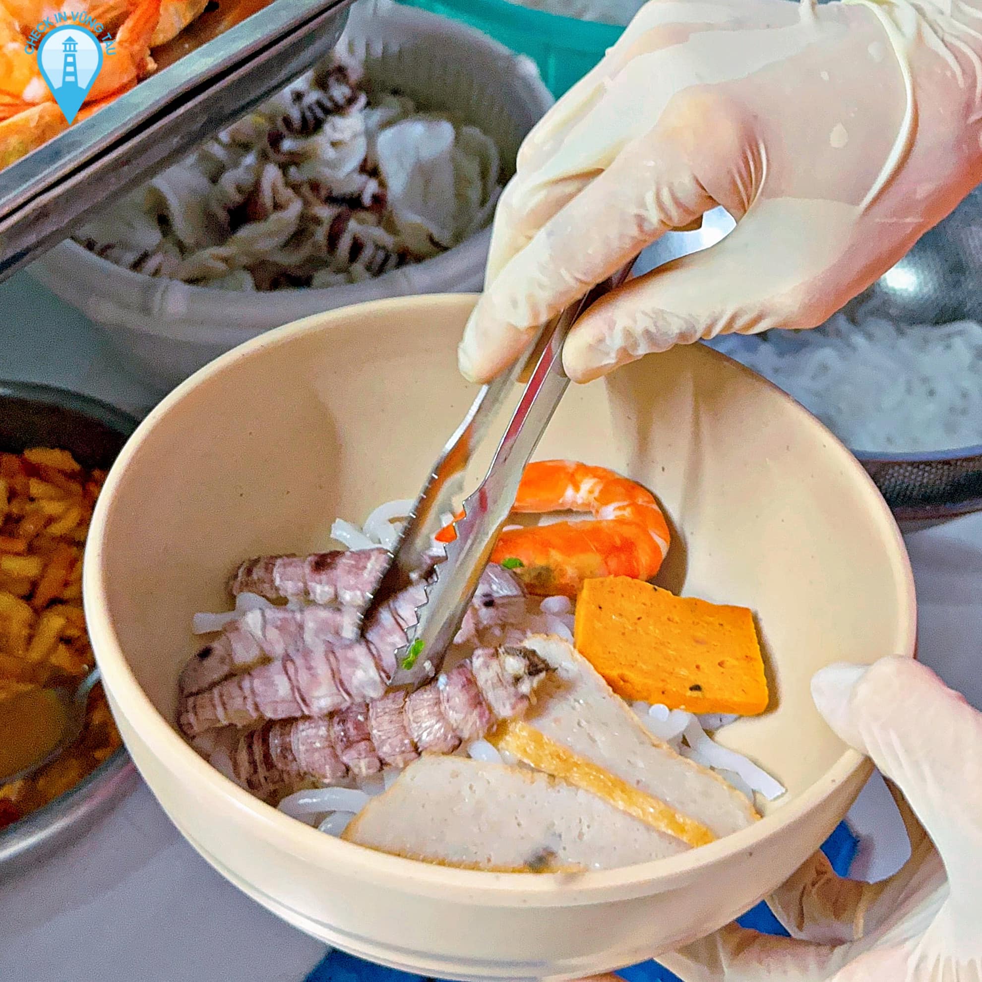 Phần topping tại quán khá đa dạng với chả cá thu, chả tôm, bò, mực và bề bề. Mỗi tô bún có thể linh hoạt lựa chọn theo sở thích, từ đơn giản đến đầy đủ nhiều loại hải sản. Sợi bún trắng đục, không dùng chất bảo quản nên khi ăn có độ dai tự nhiên. Chả tôm được giã tay nên giữ được độ dai và vị ngọt, trong khi chả cá thu mang hương vị nguyên bản, nhẹ nhàng hơn. Mực tươi được nhập mỗi ngày, thịt giòn và ngọt, kết hợp cùng bề bề chắc thịt tạo nên tổng thể hài hòa. Nước lèo trong, vị thanh và ngọt tự nhiên từ hải sản, giúp món ăn dễ ăn mà không bị ngấy.