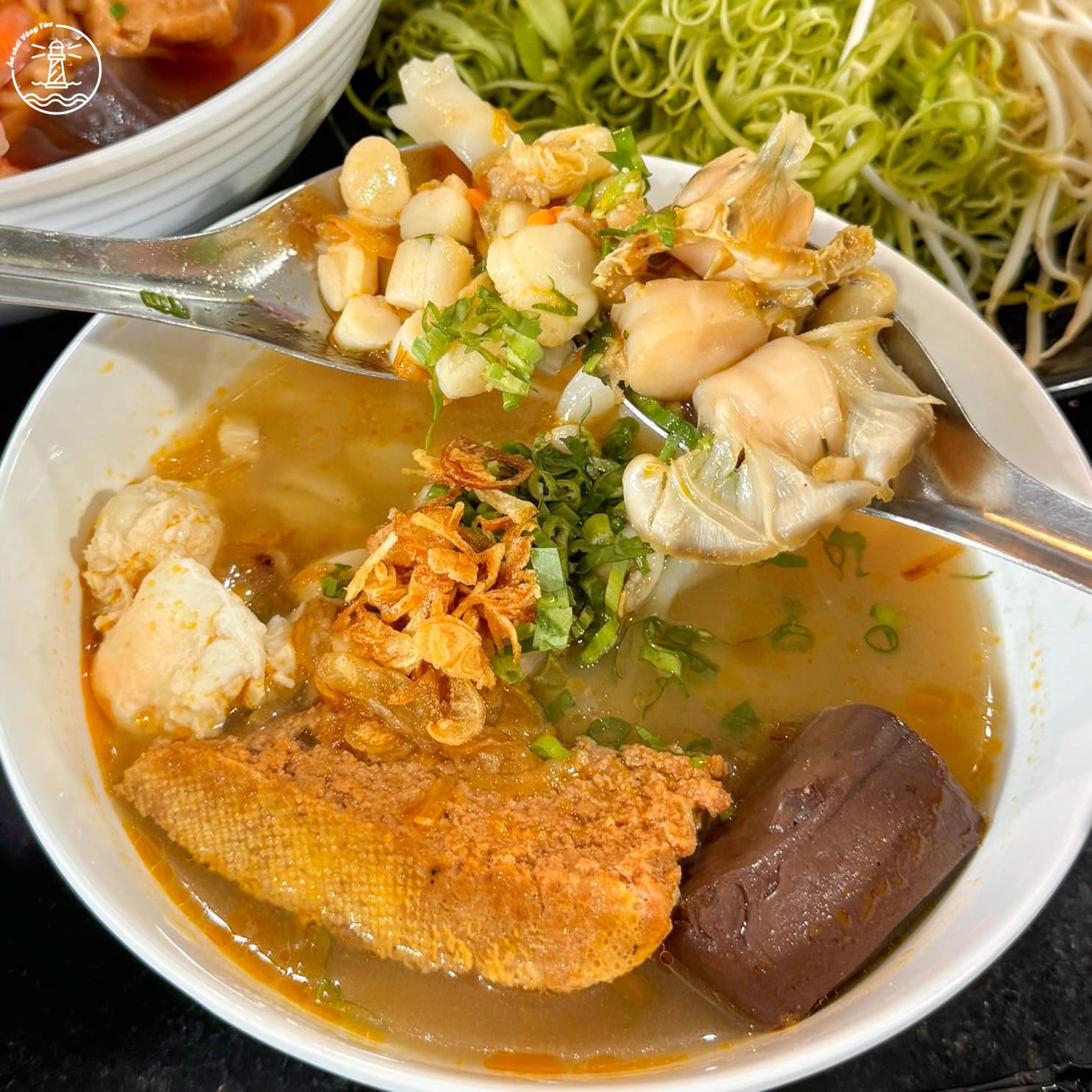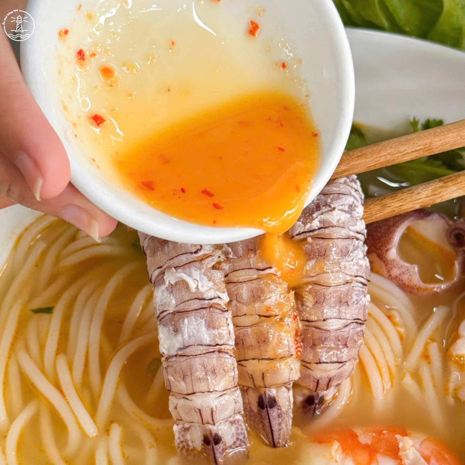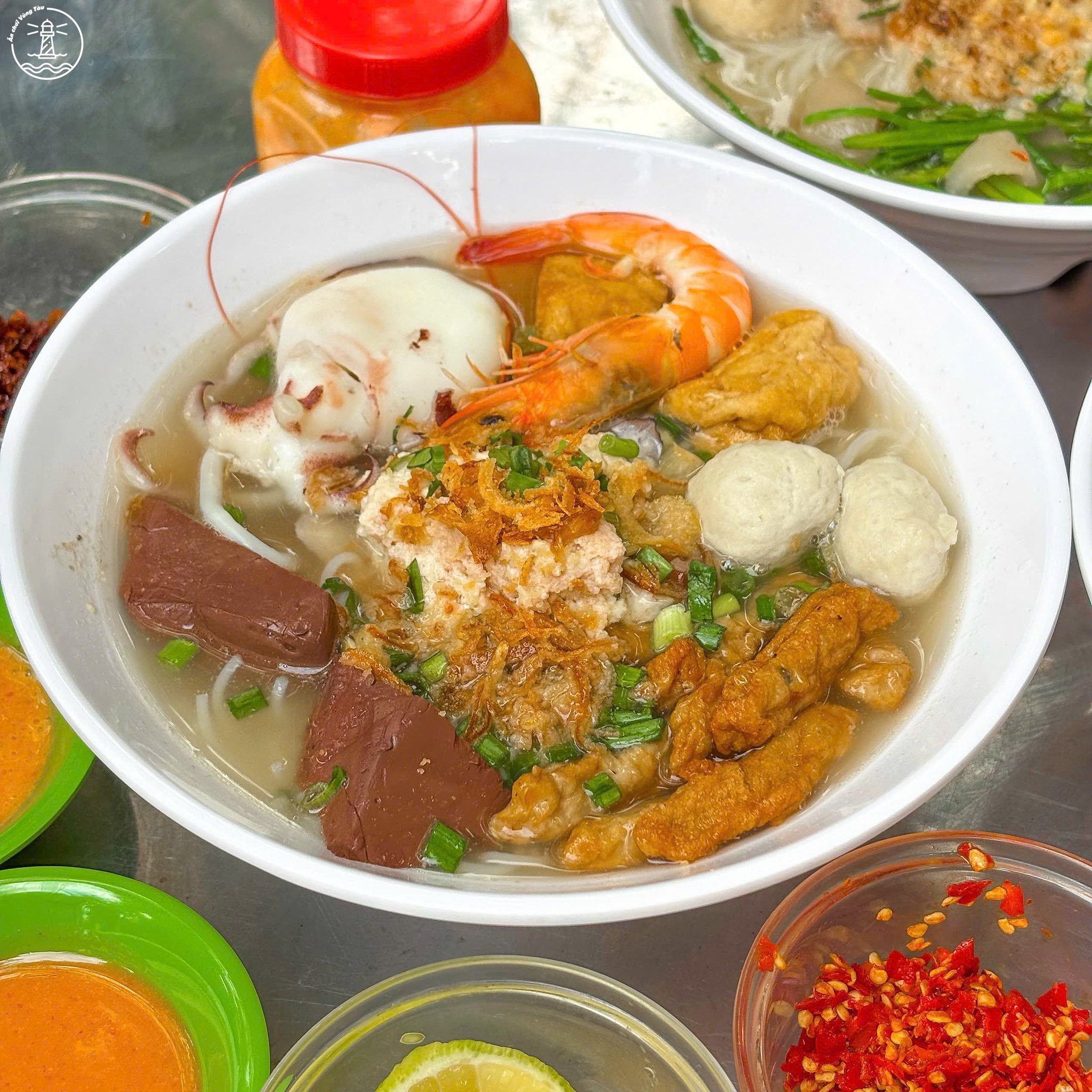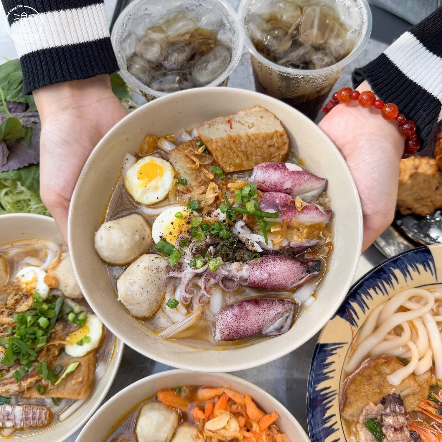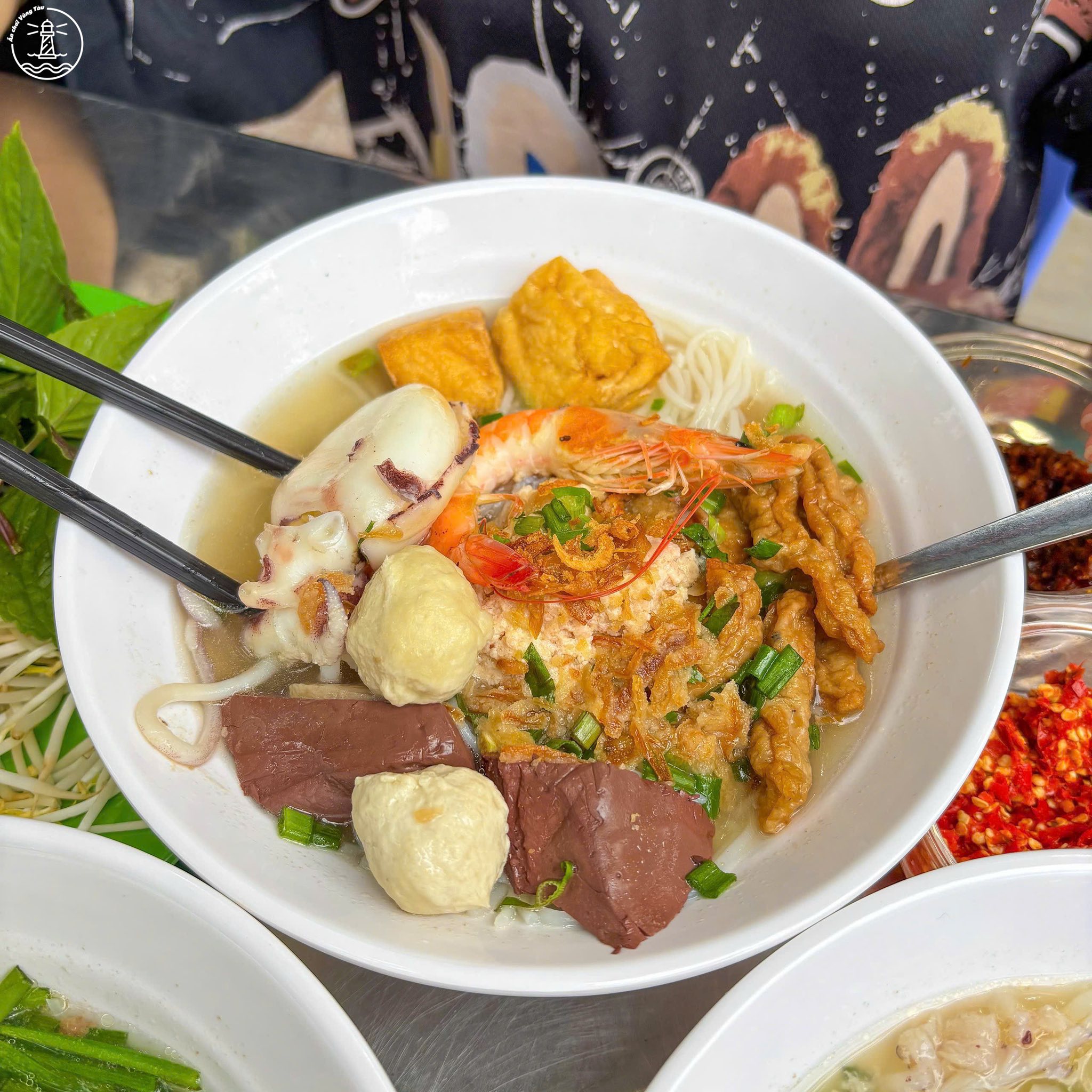 Nước lèo tại đây có vị thanh, không quá gắt nhưng vẫn đậm đà, kết hợp cùng topping đa dạng như tôm, mực và các loại hải sản khác tạo nên một tô bún đầy đặn và hài hòa hương vị. Nguyên liệu được chọn lựa kỹ nên khi thưởng thức có thể cảm nhận rõ độ tươi và chất lượng của từng thành phần.