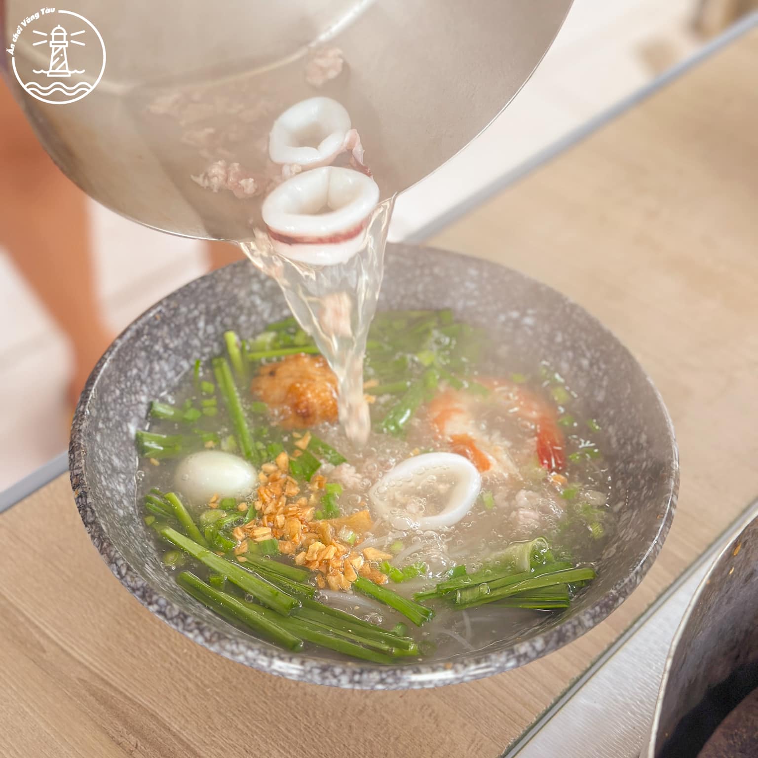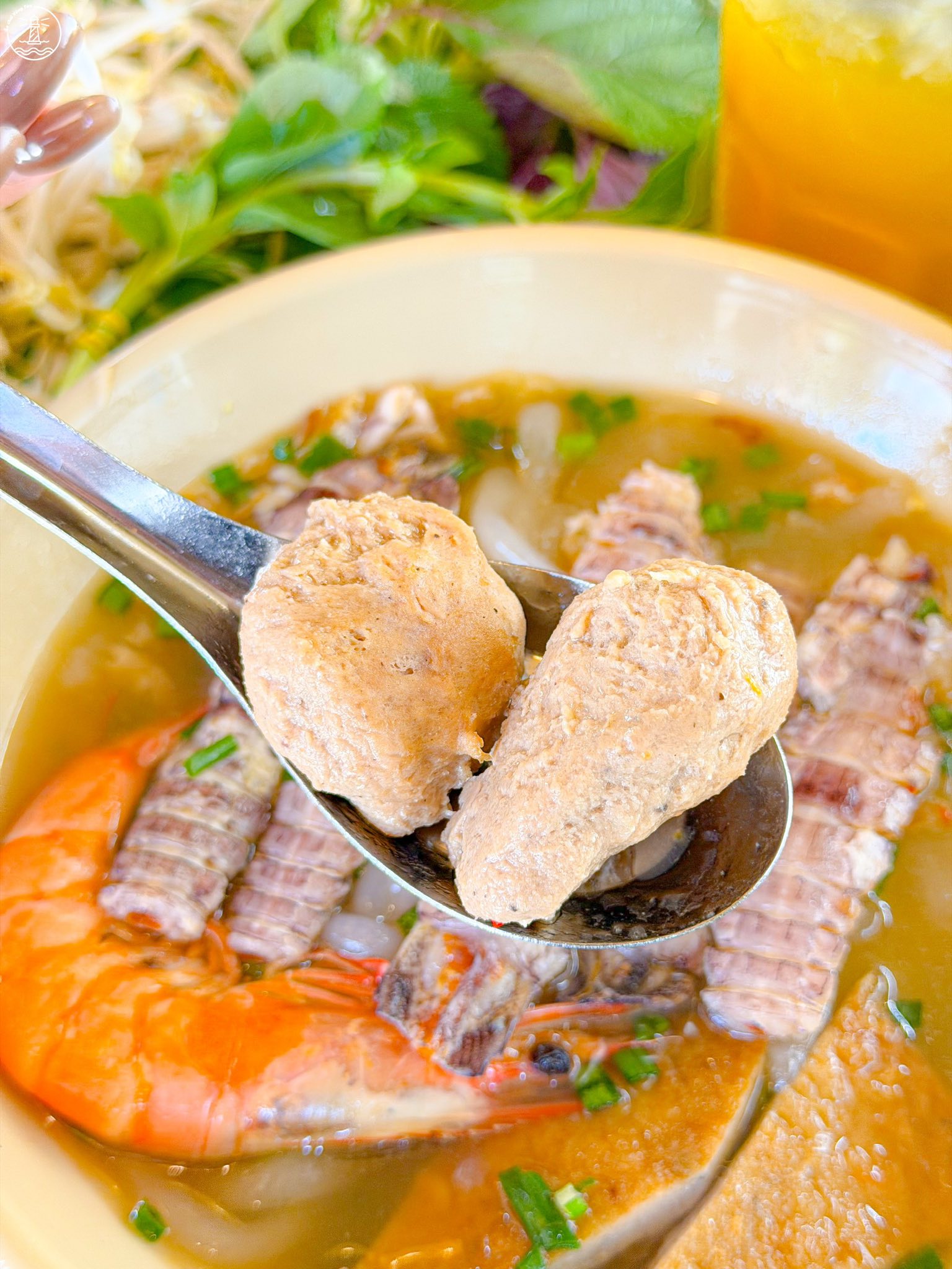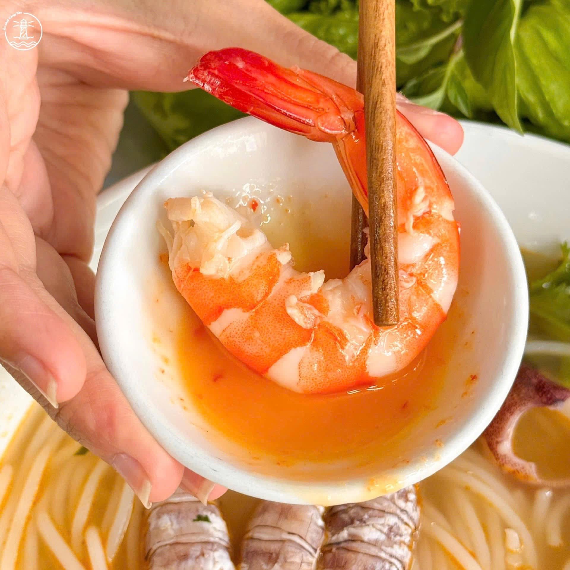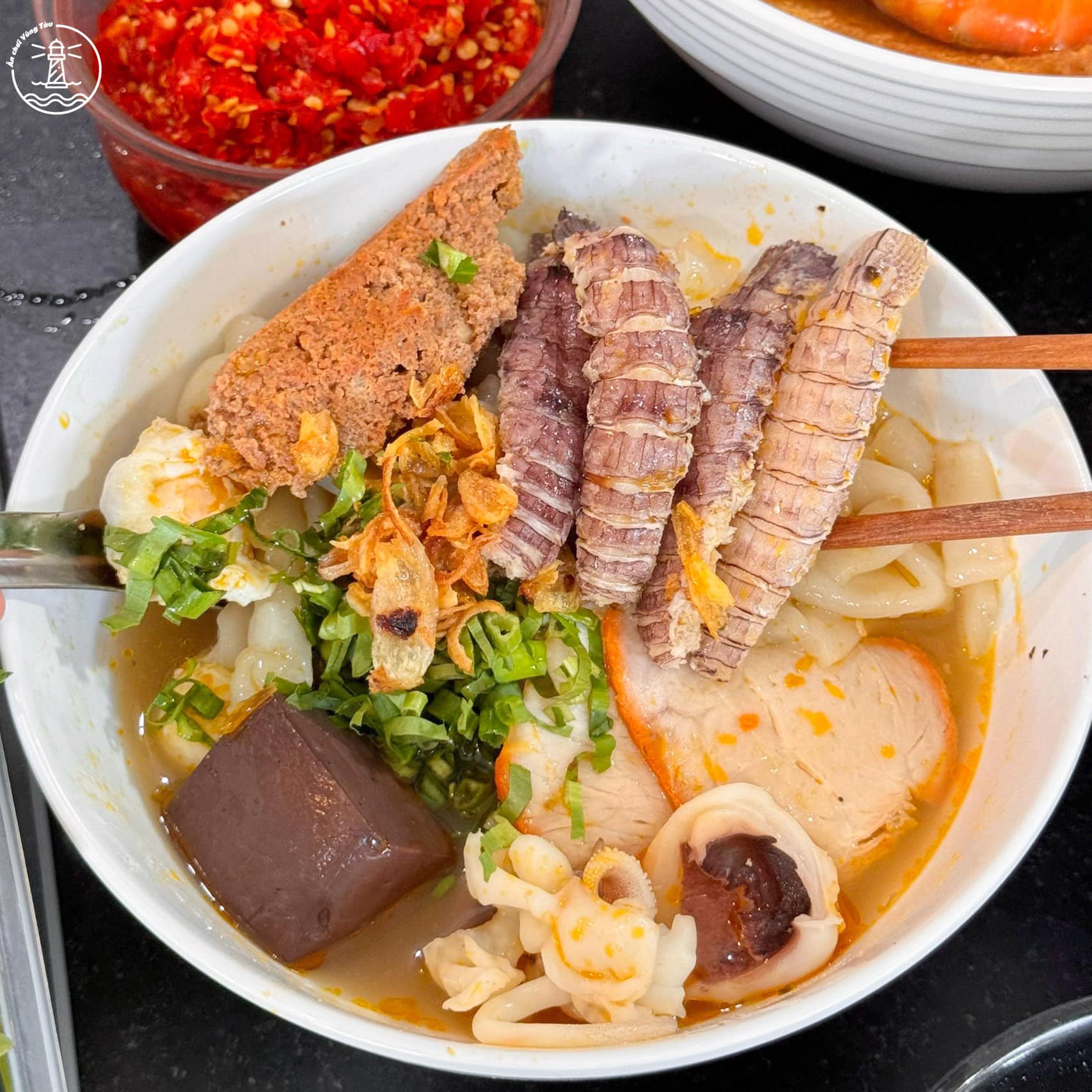 Nước lèo tại đây có vị thanh, không quá gắt nhưng vẫn đậm đà, kết hợp cùng topping đa dạng như tôm, mực và các loại hải sản khác tạo nên một tô bún đầy đặn và hài hòa hương vị. Nguyên liệu được chọn lựa kỹ nên khi thưởng thức có thể cảm nhận rõ độ tươi và chất lượng của từng thành phần.
