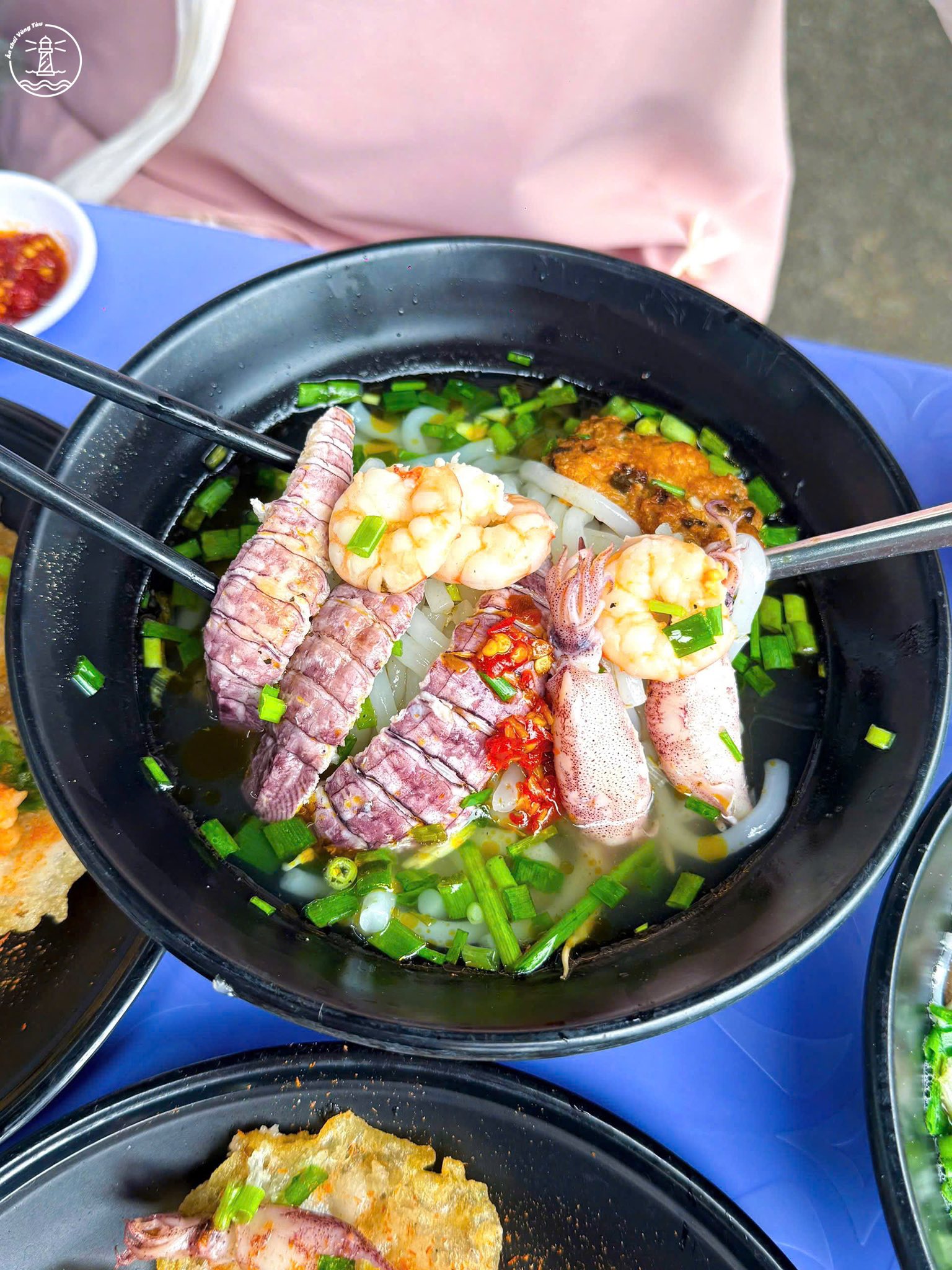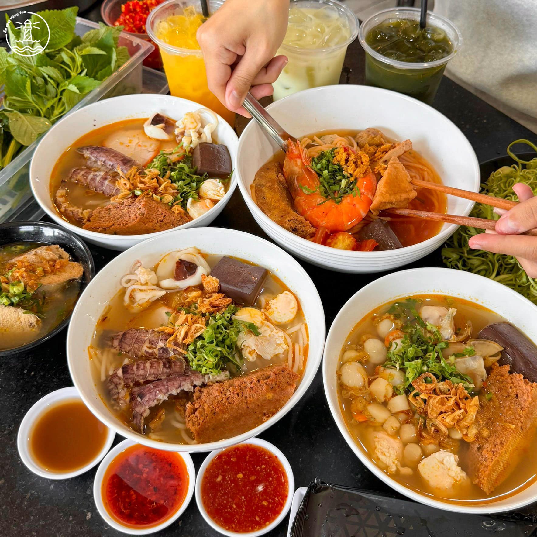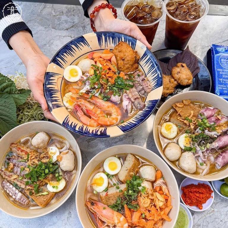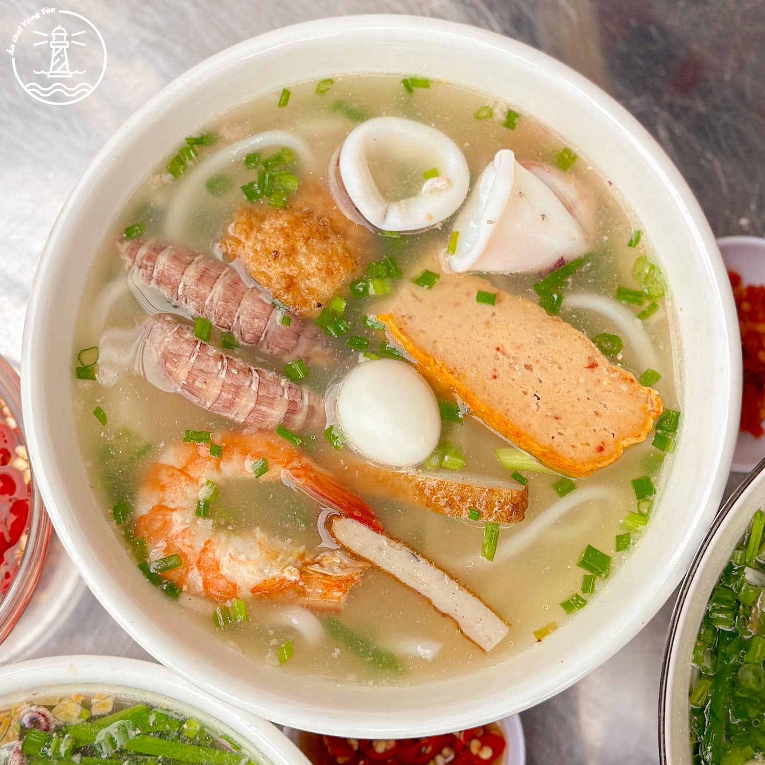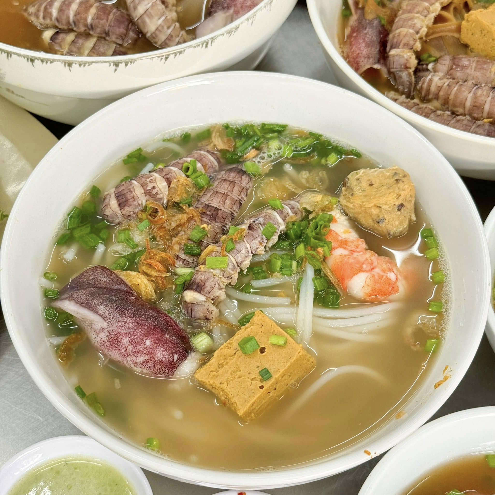 Nước lèo tại đây có vị thanh, không quá gắt nhưng vẫn đậm đà, kết hợp cùng topping đa dạng như tôm, mực và các loại hải sản khác tạo nên một tô bún đầy đặn và hài hòa hương vị. Nguyên liệu được chọn lựa kỹ nên khi thưởng thức có thể cảm nhận rõ độ tươi và chất lượng của từng thành phần.