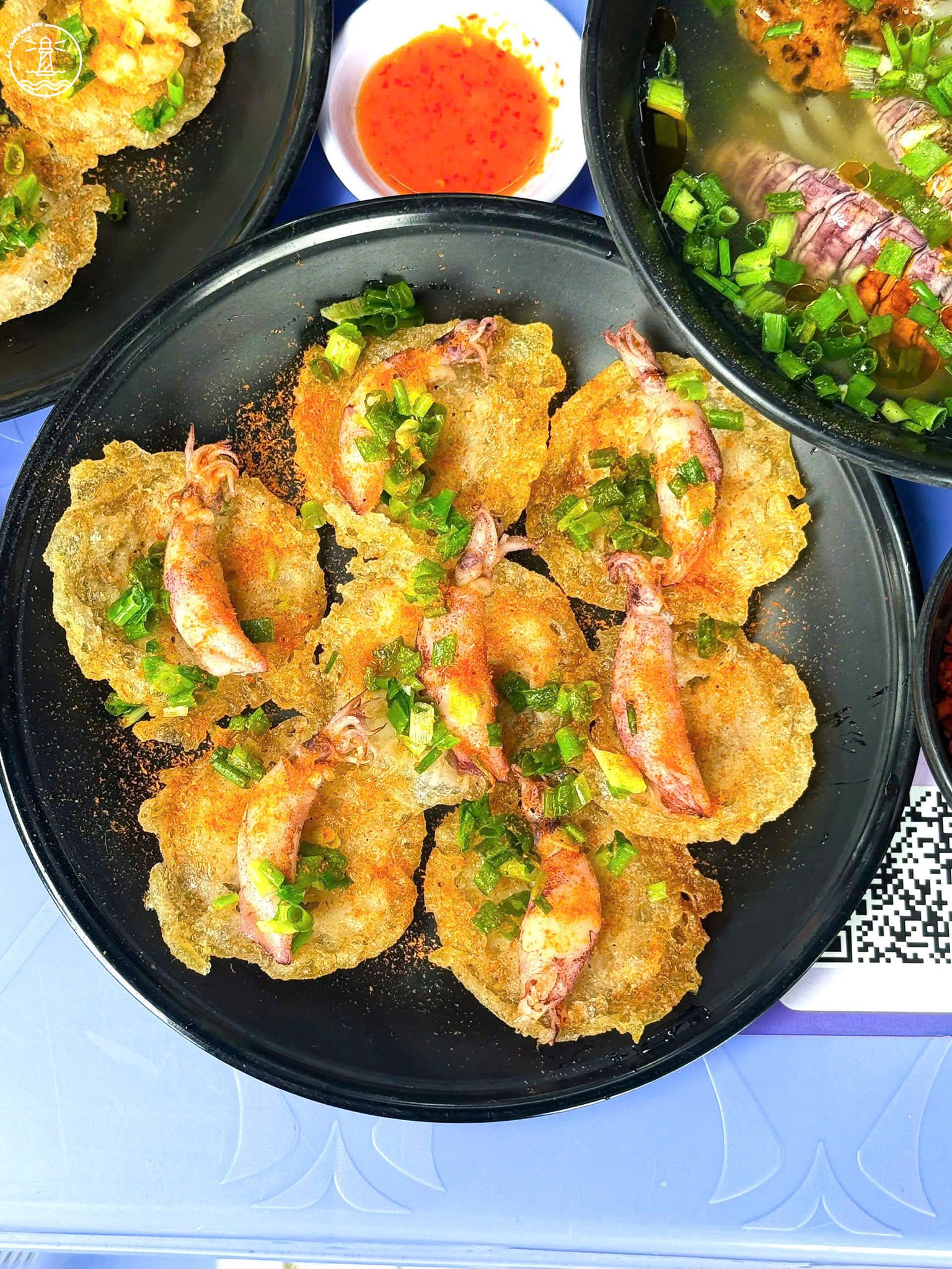 Bên cạnh món bún riêu tôm đã quá nổi tiếng, bánh canh tại đây cũng được nhiều người lựa chọn, đặc biệt là món bánh canh bề bề với sợi bánh làm từ bột sắt, to và dẹt, ăn dai rõ rệt. Phần topping được chuẩn bị đầy đặn gồm bề bề, chả ốc giác, chả cá viên, huyết, riêu tôm, mực, lòng đỏ trứng cút và xá xíu, kết hợp cùng nước dùng sánh nhẹ, đậm đà và có vị ngọt thanh từ hải sản.
