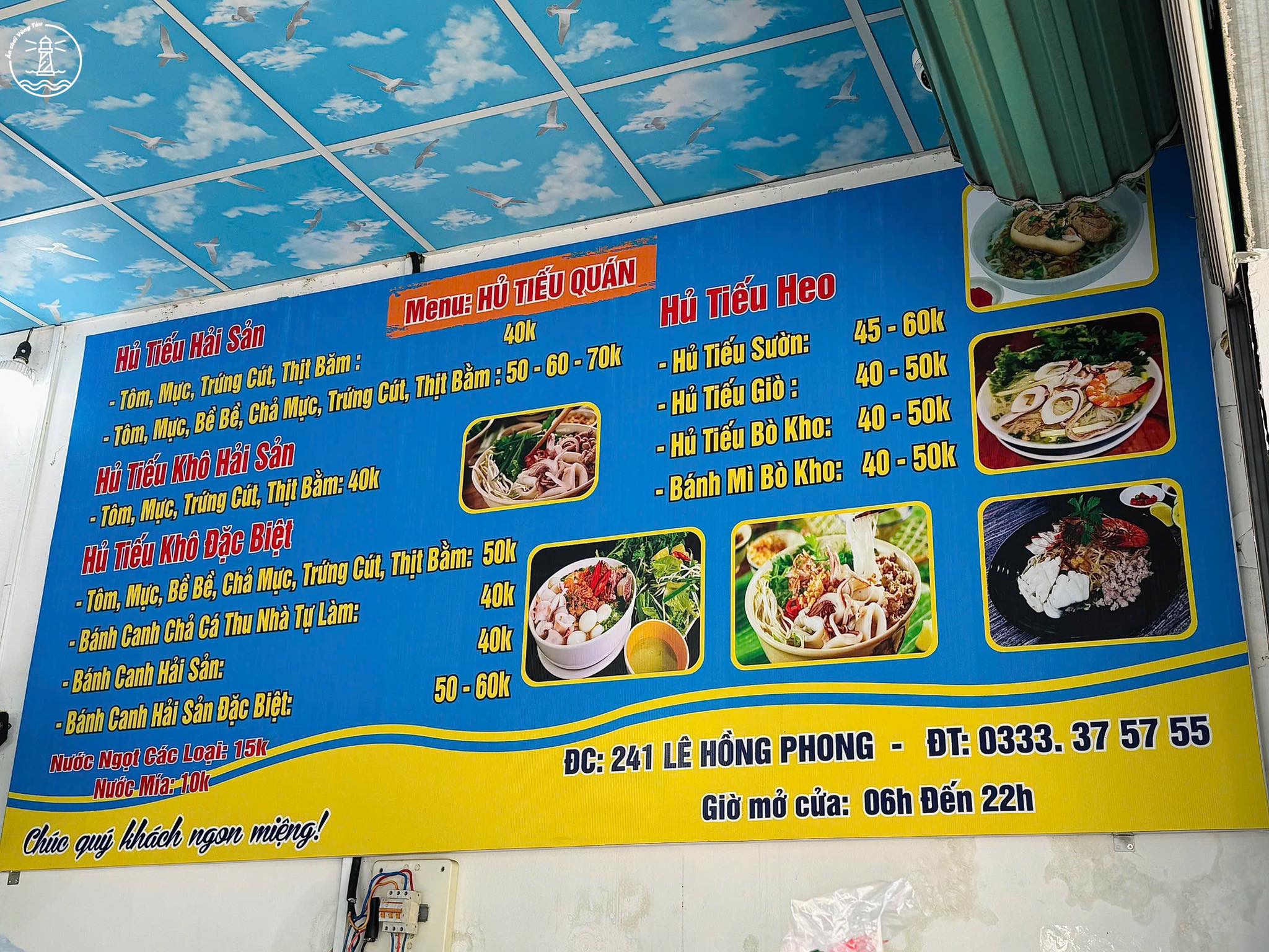 Thực đơn đa dạng với các món hủ tiếu và bánh canh hải sản, trong đó nổi bật là hủ tiếu hải sản đặc biệt và bánh canh hải sản đặc biệt. Sợi bánh canh dai ngon, không bị bột, nước dùng nấu từ hải sản nên có vị ngọt thanh tự nhiên, kết hợp cùng tôm, mực và bề bề tươi tạo nên tổng thể hài hòa. Hủ tíu có thể chọn dạng nước hoặc khô, phần hủ tíu khô được trộn sẵn với sốt đậm đà, thấm vị, topping đầy đủ và hợp khẩu vị.