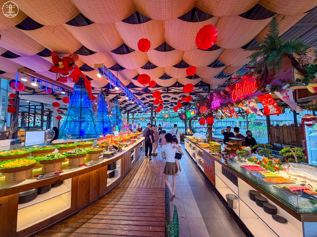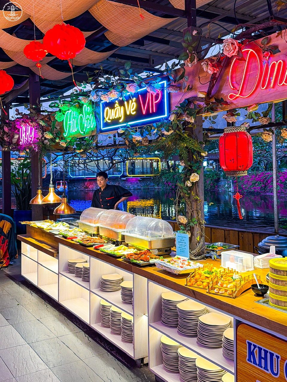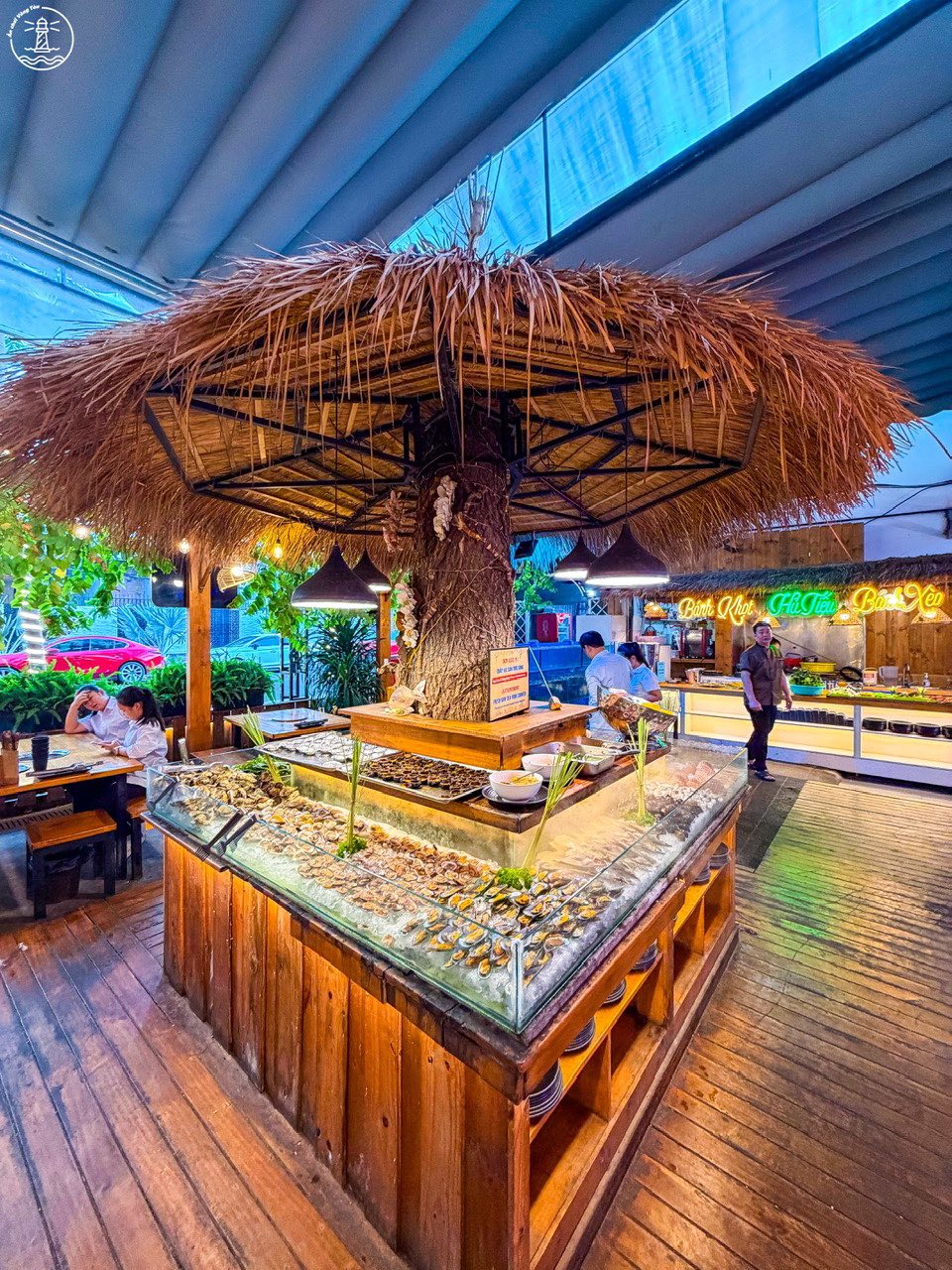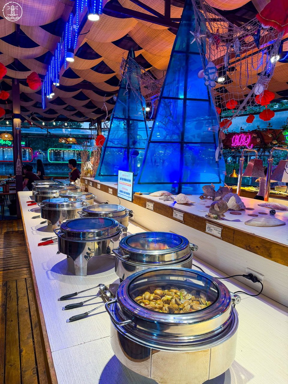 Khu vực buffet được bố trí theo từng quầy riêng biệt, giúp khách dễ quan sát và lựa chọn món ăn. Lối đi rộng, không gây cảm giác chật chội kể cả khi lượng khách đông vào cuối tuần. Ngoài khu vực máy lạnh bên trong, quán còn có không gian ngoài trời phù hợp cho nhóm đông người hoặc những ai muốn tận hưởng không khí biển về đêm.
