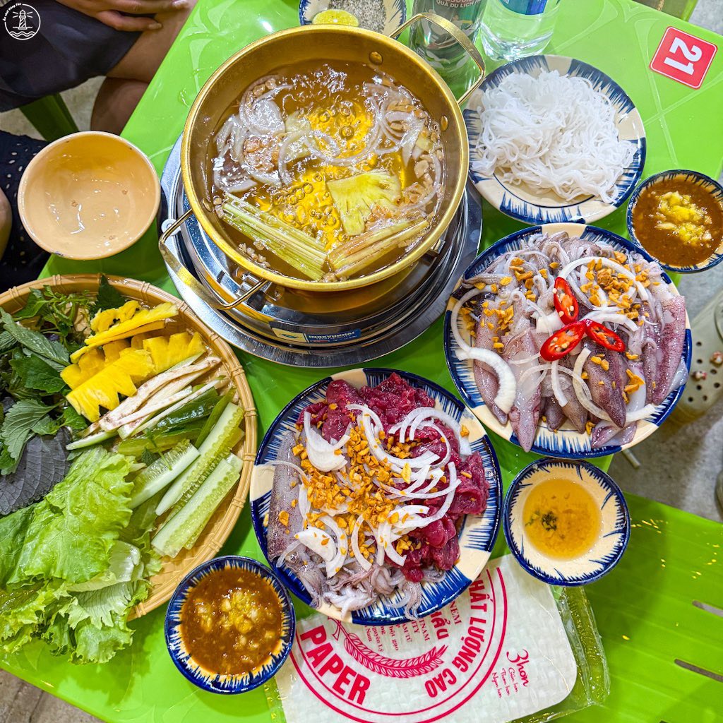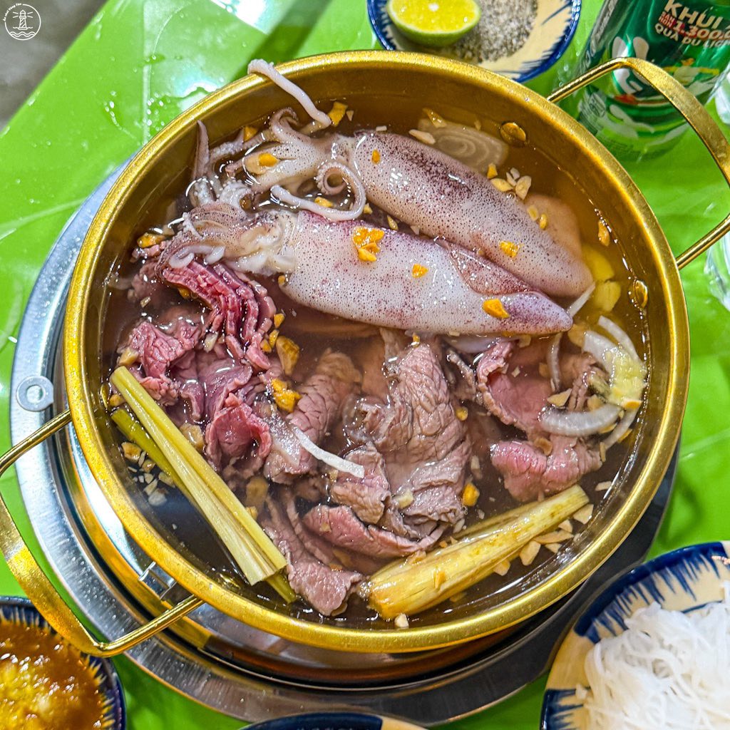 Đây chắc chắn là một trong những quán bò ngon ở Vũng Tàu bạn không thể bỏ qua, với menu đơn giản, tập trung vào hai món chính là bò và mực. Nổi bật nhất là phần bò tươi ngon, mềm mọng kết hợp hoàn hảo cùng nước chấm mắm nêm đậm đà, vừa vặn. Nước dùng được pha từ nước dừa tươi, mang vị thanh ngọt tự nhiên và chua nhẹ, khiến món ăn trở nên hấp dẫn hơn bao giờ hết. Mực nguyên con ở đây cũng được đánh giá cao nhờ sự tươi roi rói.