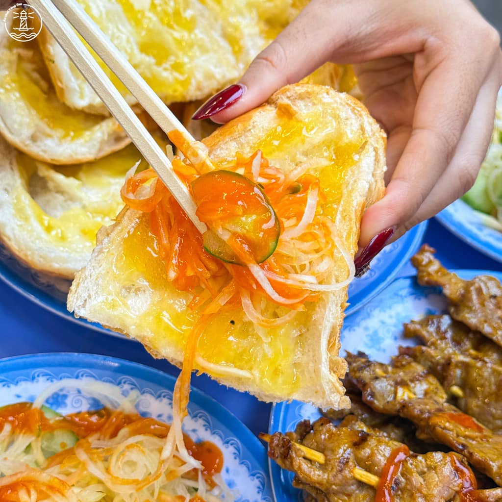 Nổi bật nhất trong thực đơn chính là xiên bò nướng than thơm lừng. Thịt bò được thái mỏng tinh tế, tẩm ướp đậm đà vừa phải, nướng lên mềm ngọt. Tuy nhiên, ngôi sao thực sự của bữa ăn lại là món bánh mì sốt bơ. Khác hẳn với loại bơ thông thường, phần sốt bơ ở đây có vị ngọt dịu, thơm nhẹ mùi vani, béo ngậy nhưng không hề gây ngán. Bánh mì được nướng giòn, khi ăn cùng lớp sốt bơ mịn màng tạo nên một trải nghiệm ẩm thực là lạ nhưng bắt miệng.