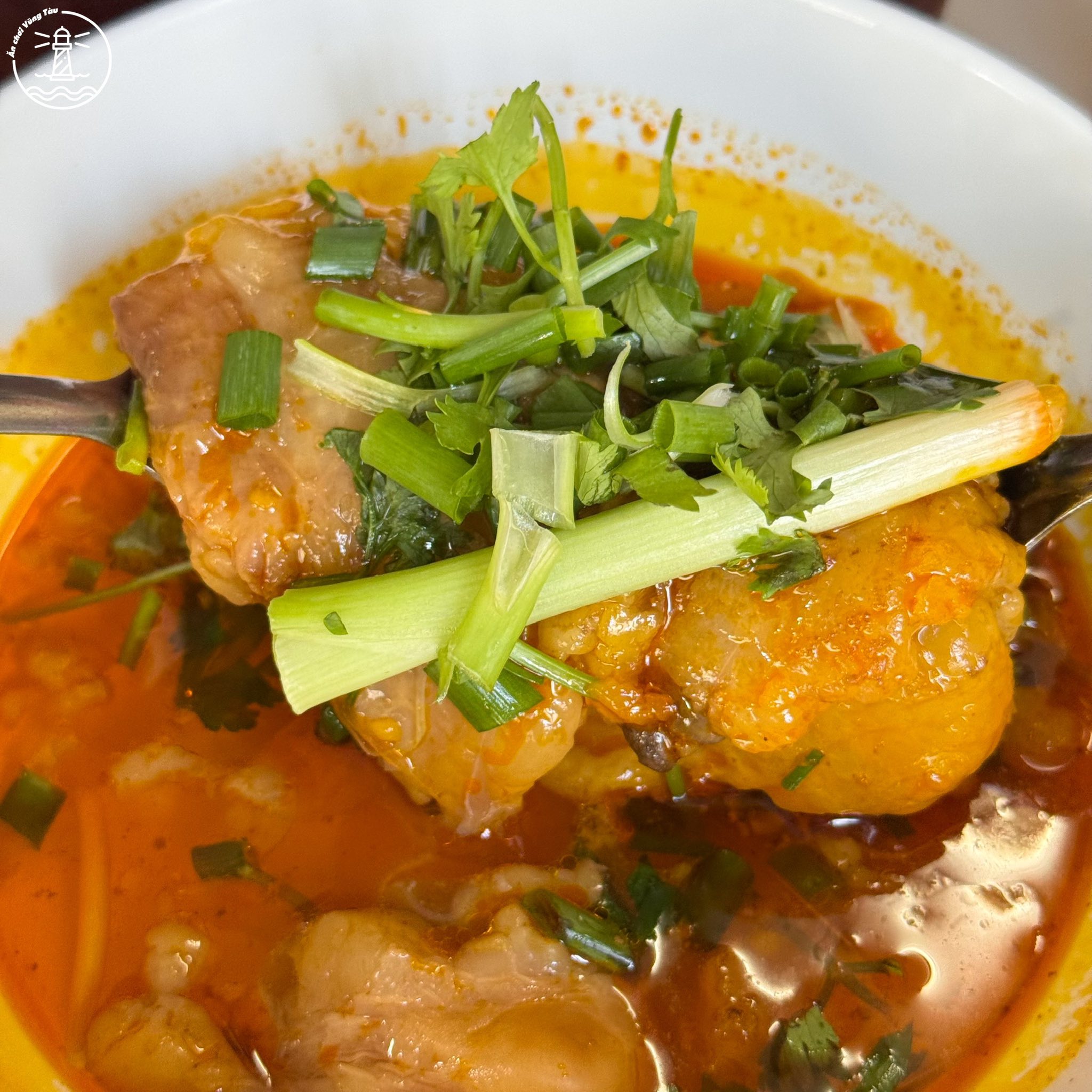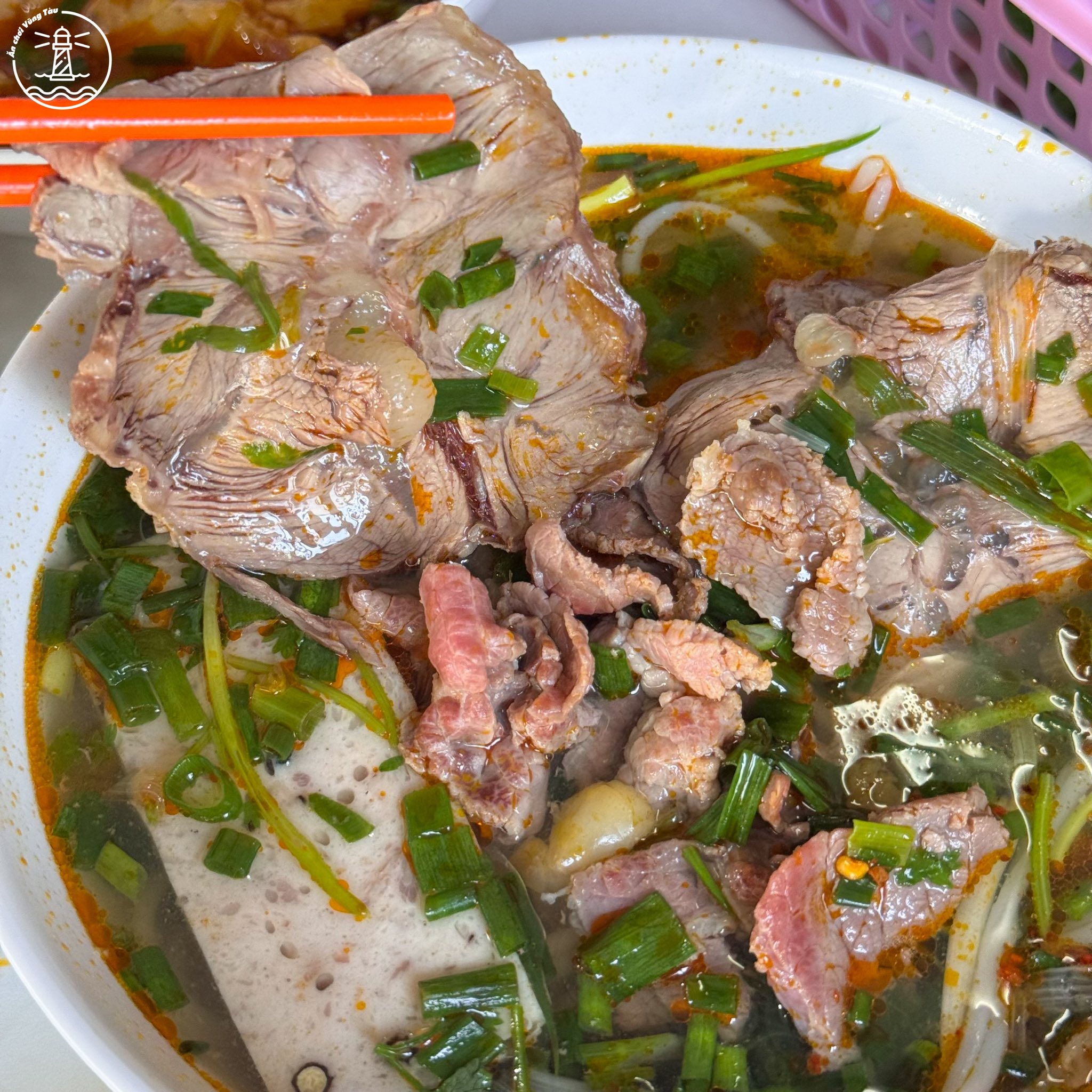 Nằm gần khu vực Bãi Sau sôi động, quán nổi tiếng với những tô bún bò đầy ắp, nước dùng đậm đà, thơm ngon đúng chuẩn vị bún bò Huế. Từng miếng thịt bò thái to, mềm ngọt, ăn kèm với sợi bún to và các loại rau sống tươi mát, tạo nên một hương vị khó cưỡng. Dù là sáng sớm hay cuối tuần, quán luôn tấp nập khách ra vào, minh chứng cho chất lượng và sức hấp dẫn của món ăn.