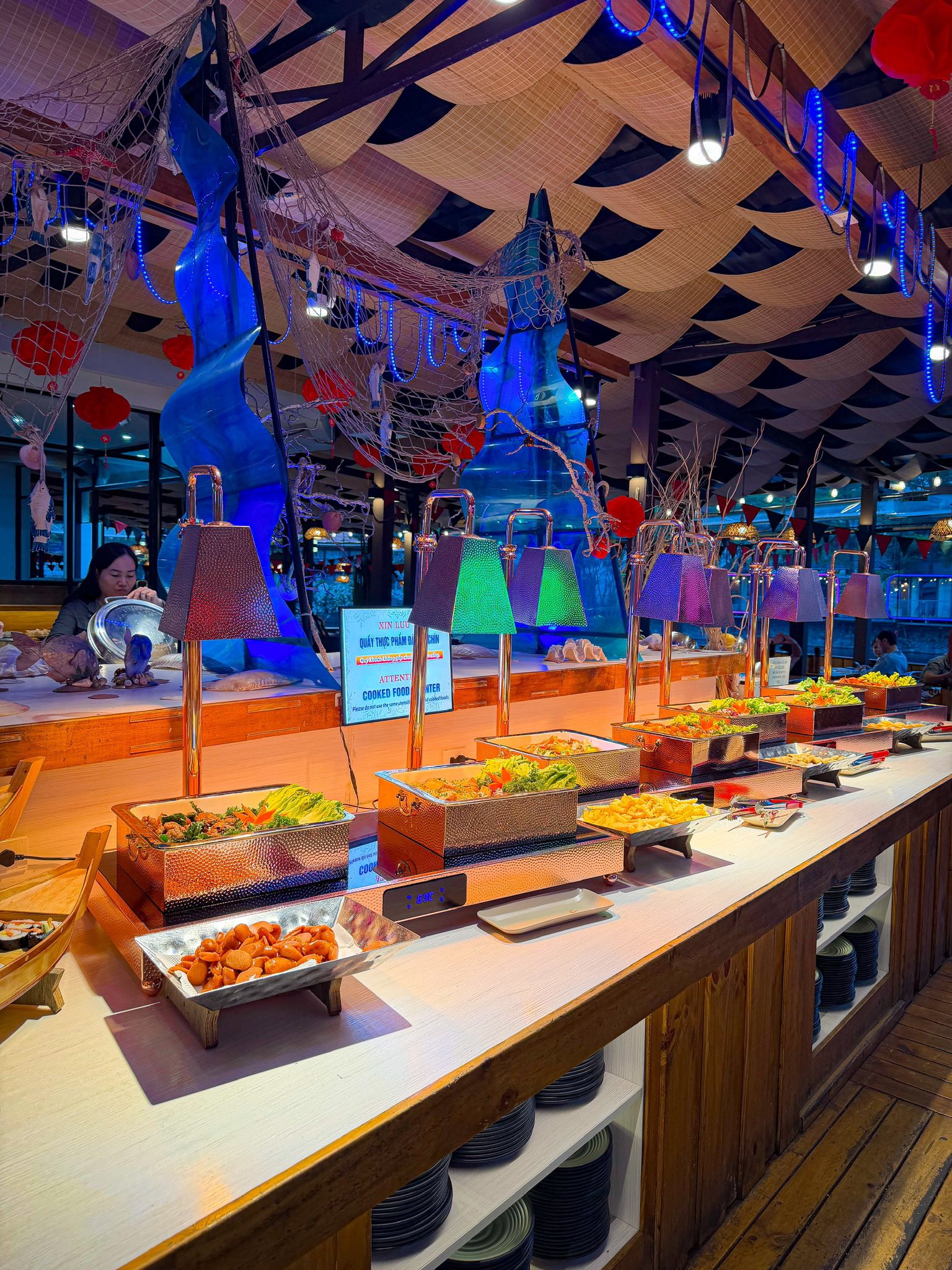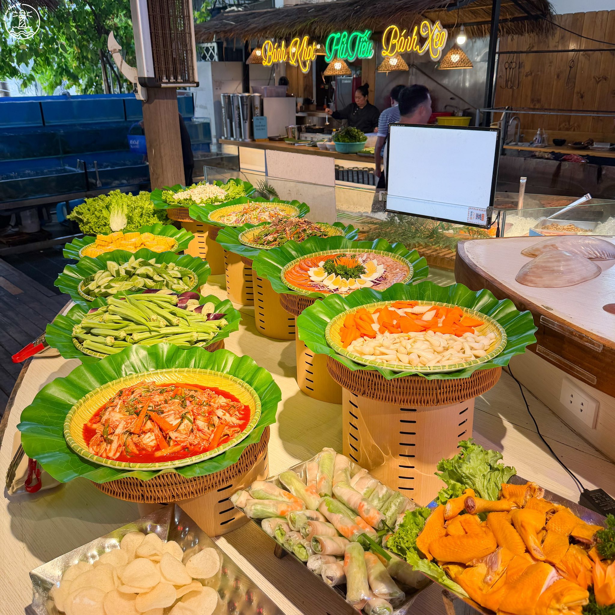 Thay vì bày sẵn, các món thịt và cua thiên nhiên sẽ được phục vụ tận bàn ngay khi bạn quét mã QR gọi món để đảm bảo độ tươi ngon nhất. Quầy line đồ khai vị và món tráng miệng như panna cotta, bánh flan cũng được refill liên tục, giúp trải nghiệm ẩm thực của bạn thêm phần trọn vẹn.